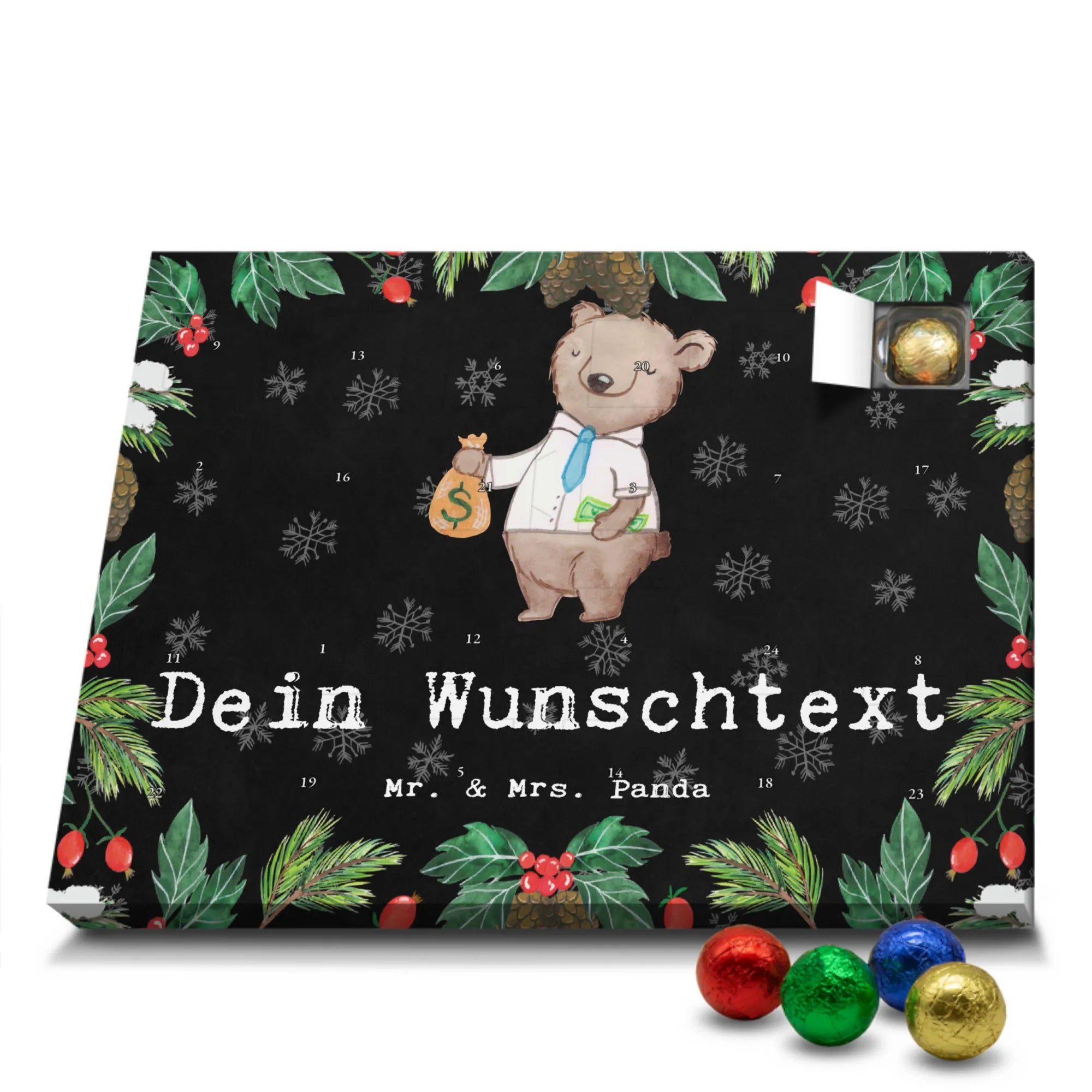 Hol dir Weihnachtszauber: Gestalte jetzt deinen personalisierten Schoko Adventskalender von Mr. & Mrs. Panda und verschenke jeden Tag ein Lächeln!