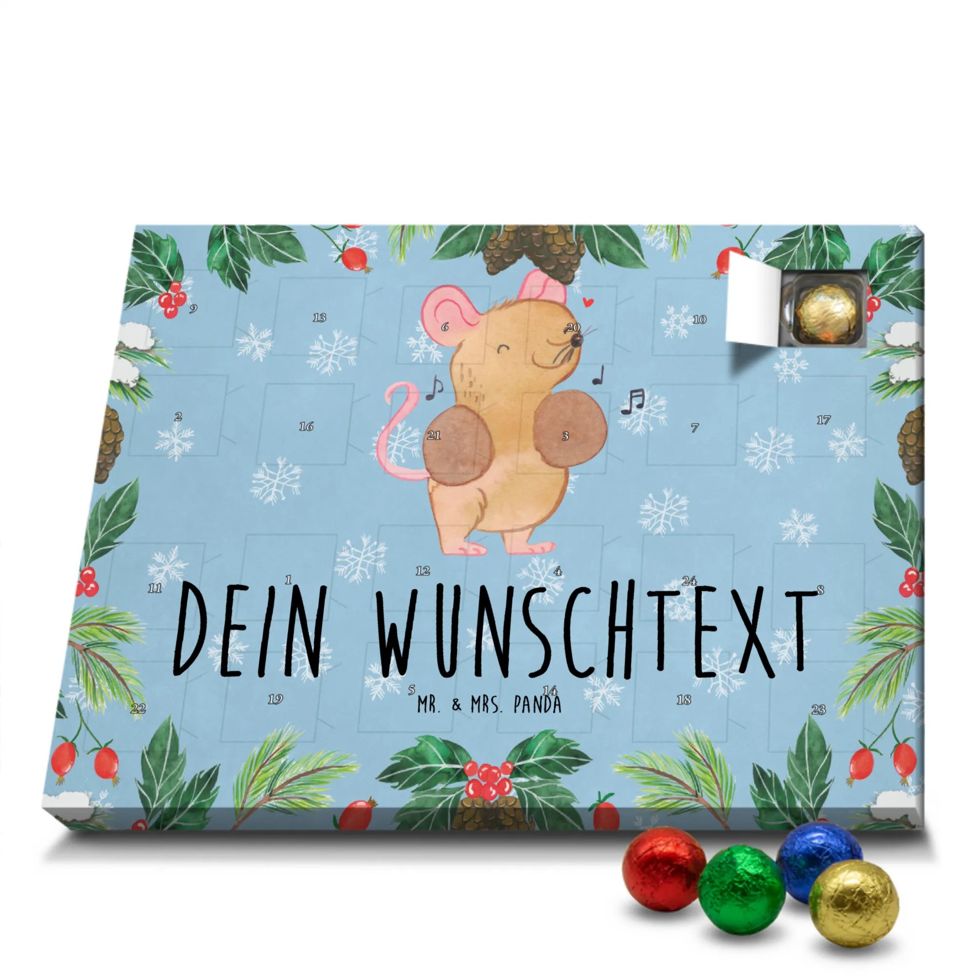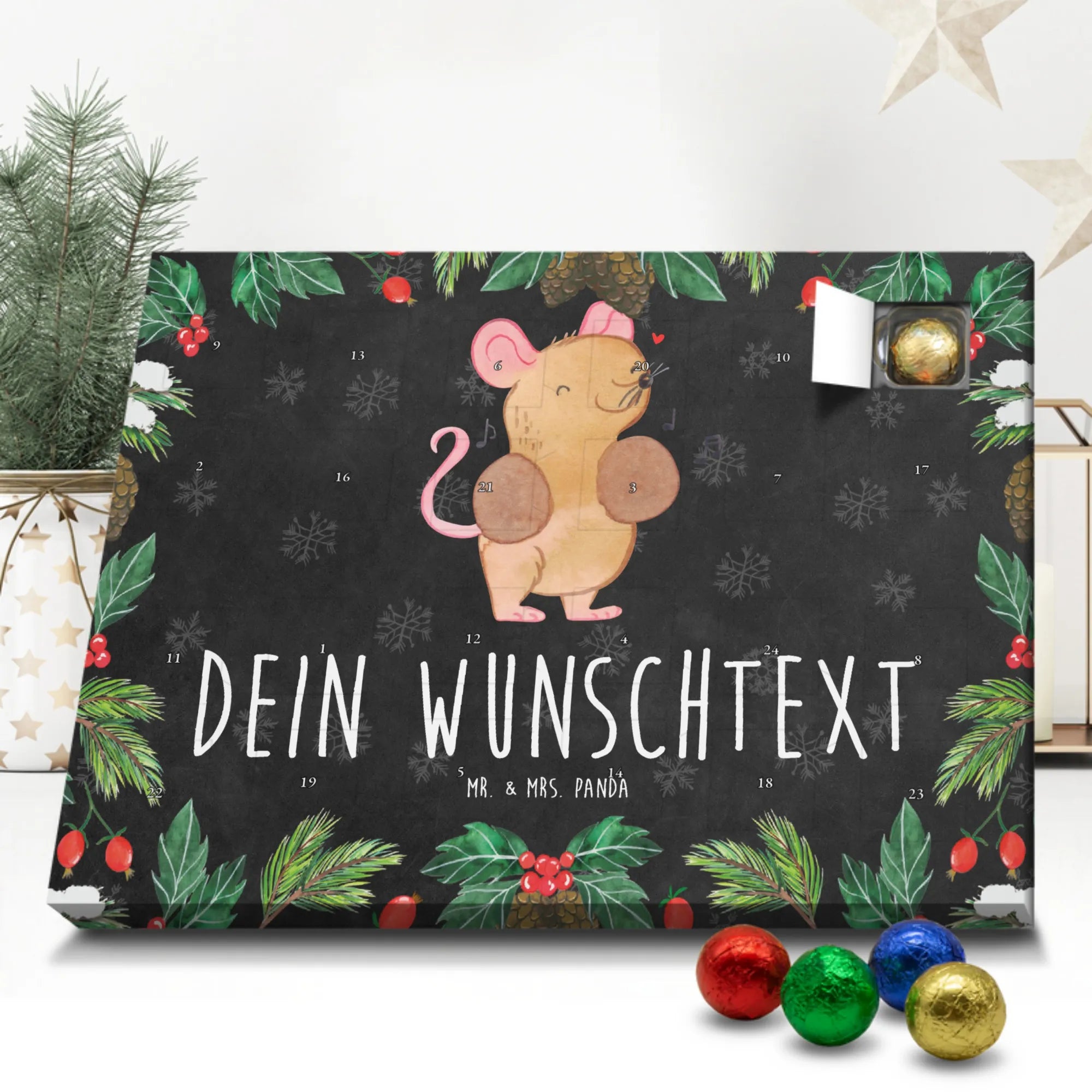 Mach die Adventszeit persönlich mit unserem Personalisierter Adventskalender mit Schokolade von Mr. & Mrs. Panda. Jeder Kalender ist liebevoll illustriert und bedruckt mit charmanten Sprüchen und Motiven – perfekt als Geschenk oder Deko für dein Zuhause. Du kannst deinen Wunschname oder einen kurzen Text hinzufügen, damit der Kalender ganz individuell wird. Die brillante Druckqualität und die seidenmatte Oberflächenveredelung sorgen für eine edle Optik, und auch die Seitenflächen sind komplett bedruckt. Maße: 233 mm x 178 mm x 24 mm. Die clevere Konstruktion erlaubt es, den Kalender aufzuhängen oder aufzustellen – flexibel und dekorativ zugleich. Gefüllt mit MARKENNAMEN Schokolade sowie köstlichen Schokoladenkugeln ist jeder Tag im Advent eine süße Überraschung. Wichtiger Hinweis: (Kann Spuren von Haselnüssen, Mandeln, Gluten und Soja enthalten!), kühl und trocken lagern! Egal ob für Kinder, Partner oder beste Freundin – dieser personalisierte Adventskalender bringt ein Lächeln und zaubert gemütliche Vorfreude. Bestell jetzt und gestalte deine Adventszeit mit einem Hauch Mr. & Mrs. Panda.