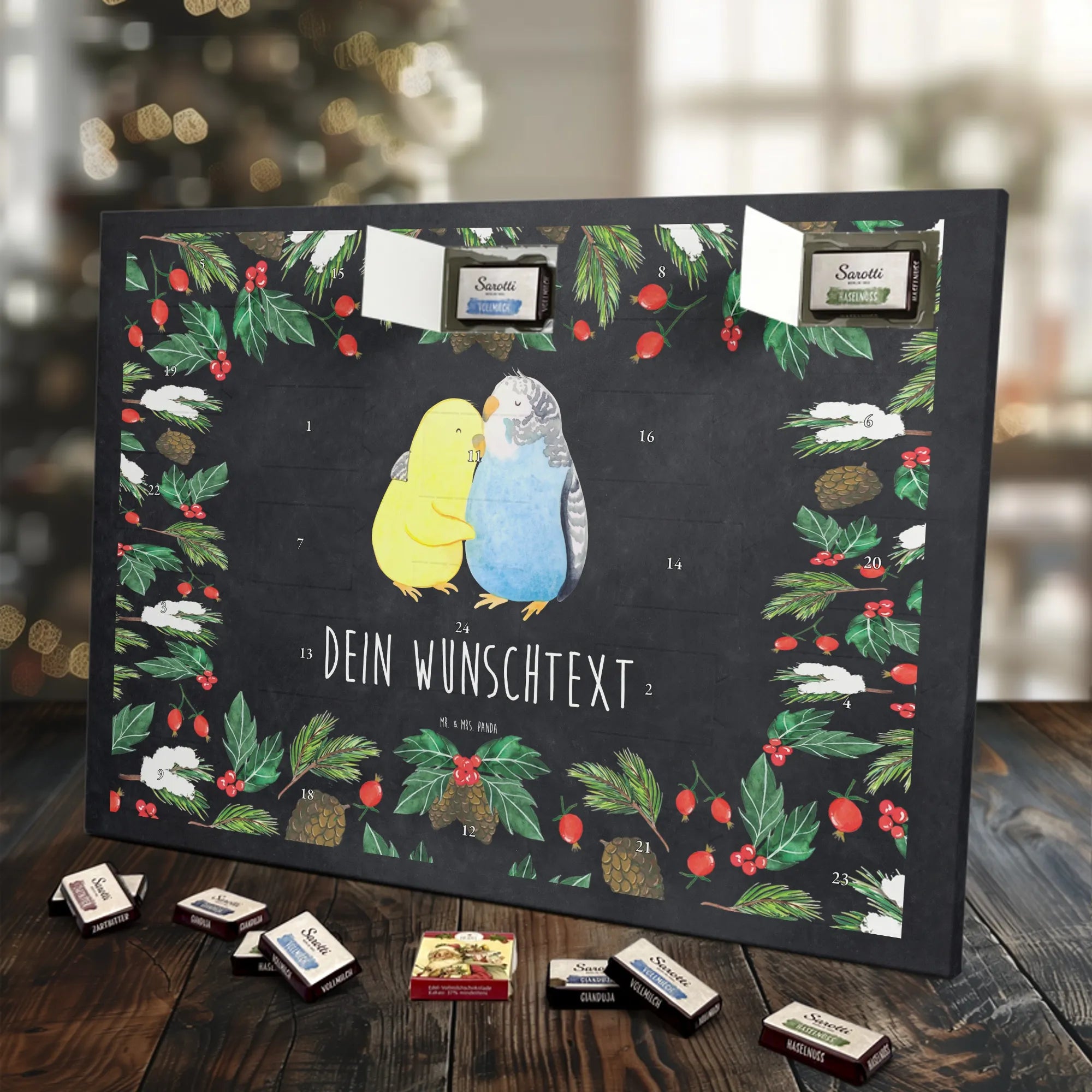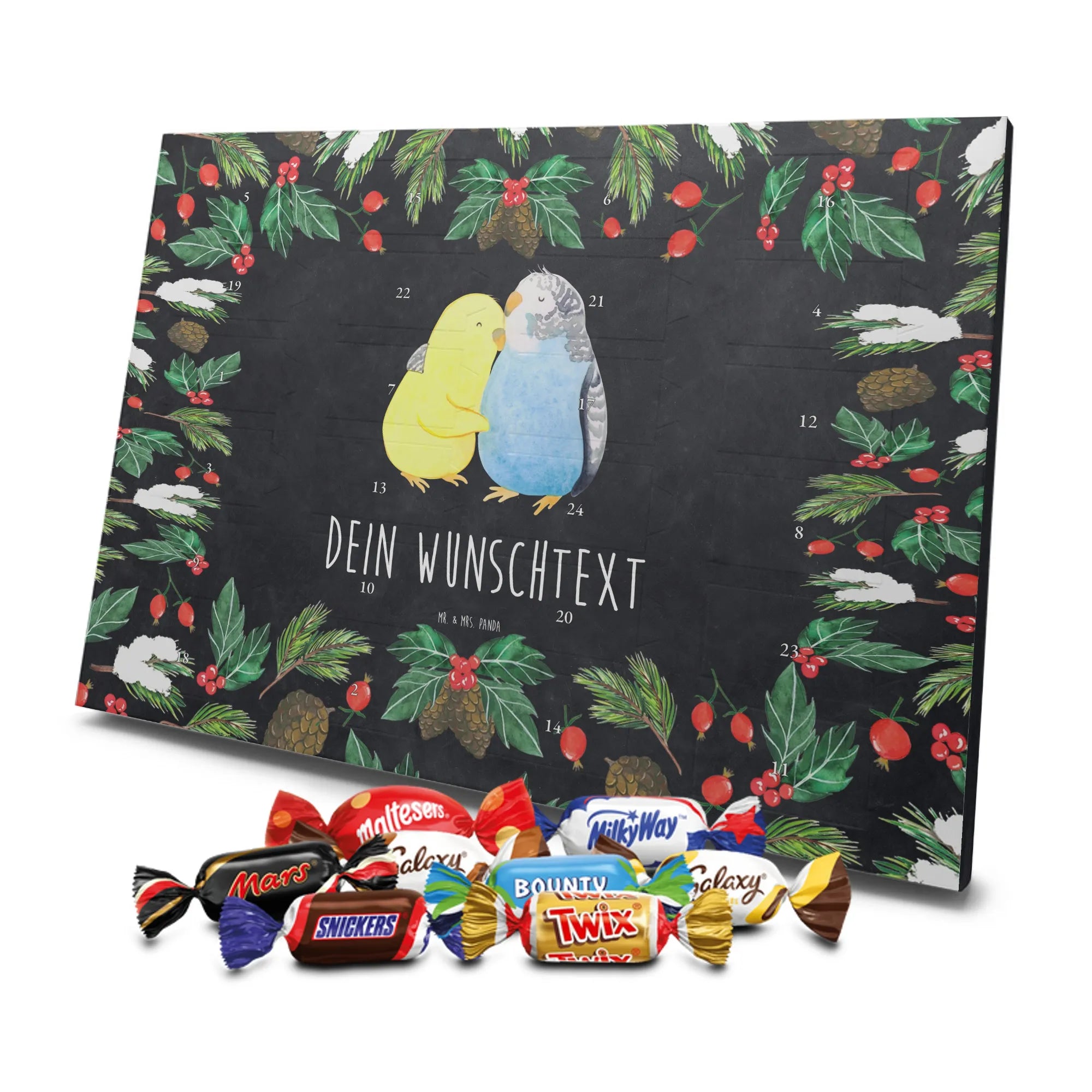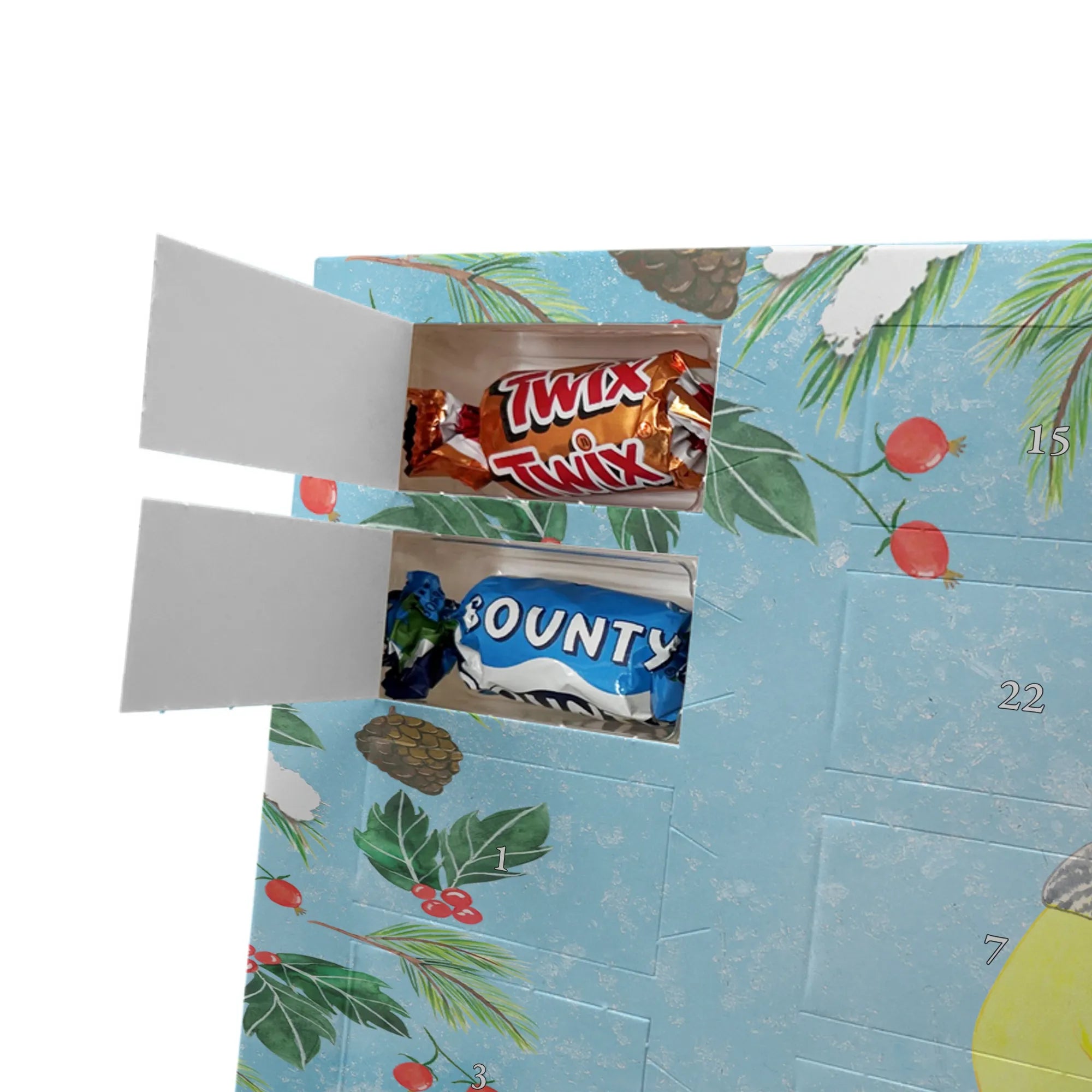 Personalisierter Schoko-Adventskalender von Mr. & Mrs. Panda – liebevoll gestaltet und ideal als individuelles Geschenk in der Adventszeit. Wir bedrucken den Kalender mit zauberhaften Motiven & herzlichen Sprüchen und personalisieren ihn mit deinem Wunschnamen oder Wunschtext. Die hochwertige Druckqualität kombiniert mit einer seidenmatten Oberflächenveredelung sorgt für ein edles Erscheinungsbild, und die bedruckten Seitenflächen geben dem Motiv zusätzlichen Charme. Der Kalender kann aufgehängt oder aufgestellt werden, sodass du ihn flexibel platzieren kannst. Gefüllt ist der Kalender mit Celebrations, die 24 hochwertige Überraschungen in 8 verschiedenen Sorten beinhalten: Maltesers, Mars, Snickers, Twix, Milky Way, Bounty, Galaxy und Galaxy Caramel. Maße: 325 mm x 225 mm x 27 mm – handlich und doch großzügig für die kleinen Leckereien hinter den Türchen. Ob für Kinder, Partner oder beste Freunde: dieser personalisierte Schoko-Adventskalender macht das Warten auf Weihnachten bunter und leckerer. Verschenke eine persönliche Erinnerung und jeden Tag ein kleines Schokoladen-Glück!