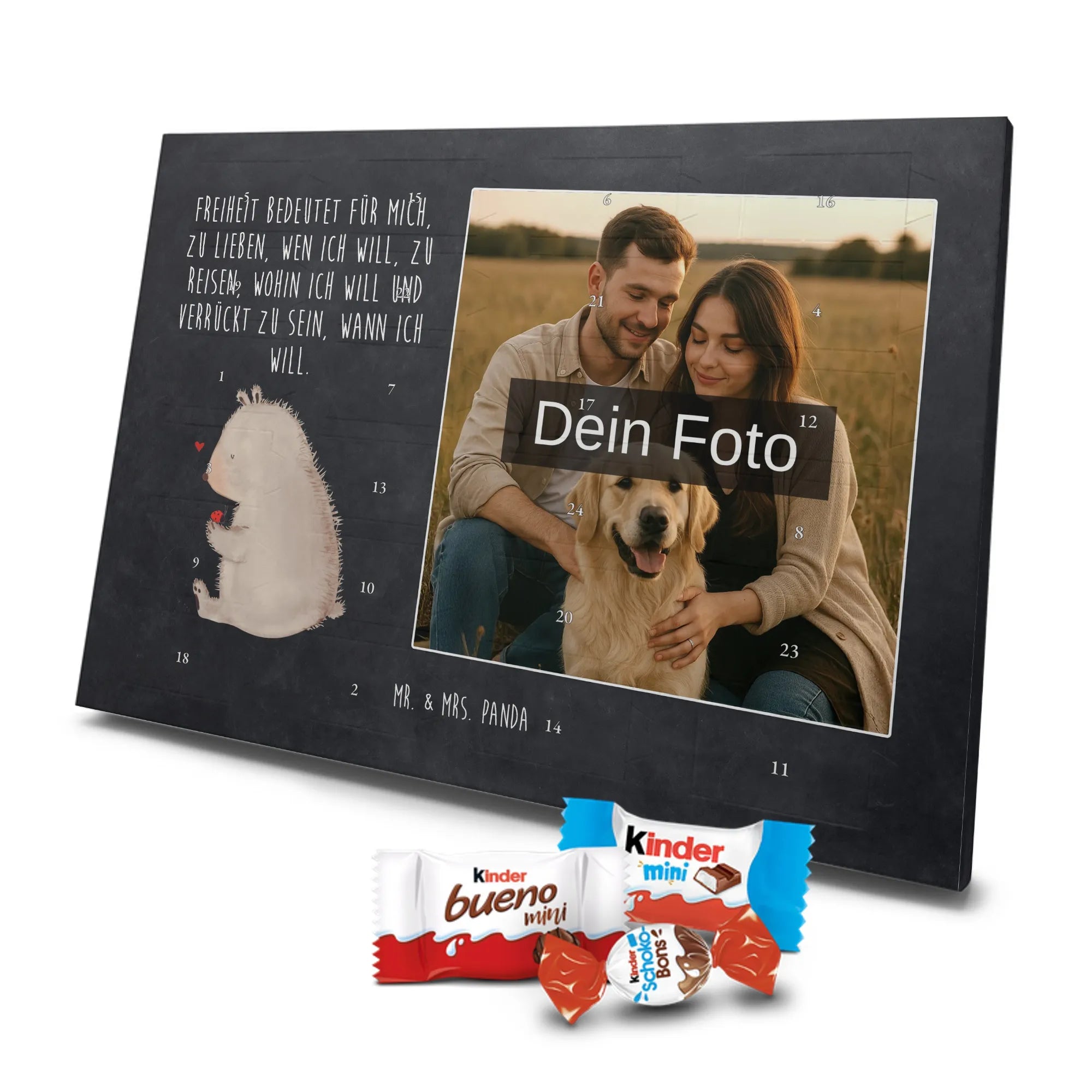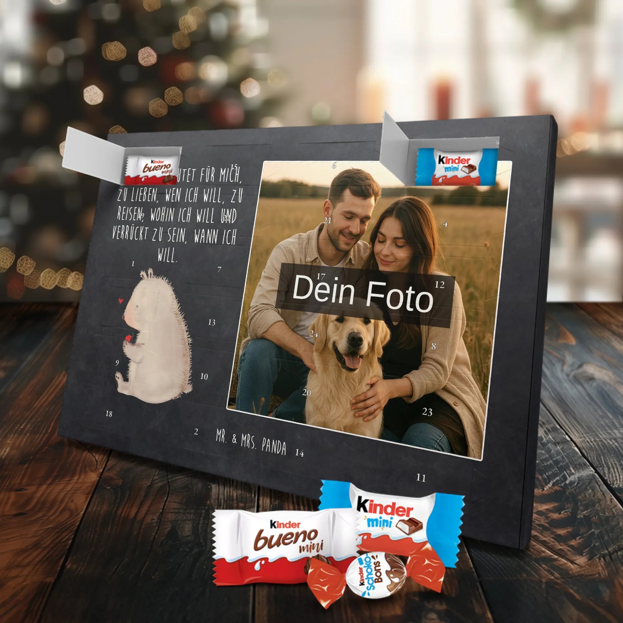 Unser personalisierten Schoko Foto Adventskalender ist ein echtes Highlight in der Adventszeit – handlich, individuell und voller süßer Überraschungen. Du personalisierst die Vorderseite mit deinem liebsten Foto und wir kombinieren es mit liebevollen Motiven und Sprüchen von Mr. & Mrs. Panda. Bitte achte auf eine ausreichende Bildauflösung und einen passenden Bildausschnitt, damit das Druckergebnis gestochen scharf ist. Lade nur Bilder hoch, deren Rechte du besitzt oder bei denen du die Erlaubnis hast, besonders wenn Personen darauf zu sehen sind. Wichtig: Fotos werden nicht retuschiert oder zugeschnitten; personalisierte Foto-Artikel sind vom Widerruf ausgeschlossen. Der Kalender besticht durch brillante Druckqualität und eine seidenmatte Oberflächenveredelung sowie bedruckte Seitenflächen. Maße: 355 mm x 245 mm x 11 mm. Du kannst ihn entweder aufstellen oder an die Wand hängen. Gefüllt ist der Adventskalender mit kinder® Schokolade, inklusive kinder® Schoko-Bons, kinder® Bueno mini und kinder® Schokolade mini. Ein liebevolles, persönliches Geschenk für Kinder, Freunde oder die bessere Hälfte – individuell, süß und mit dem typischen Mr. & Mrs. Panda Charme.