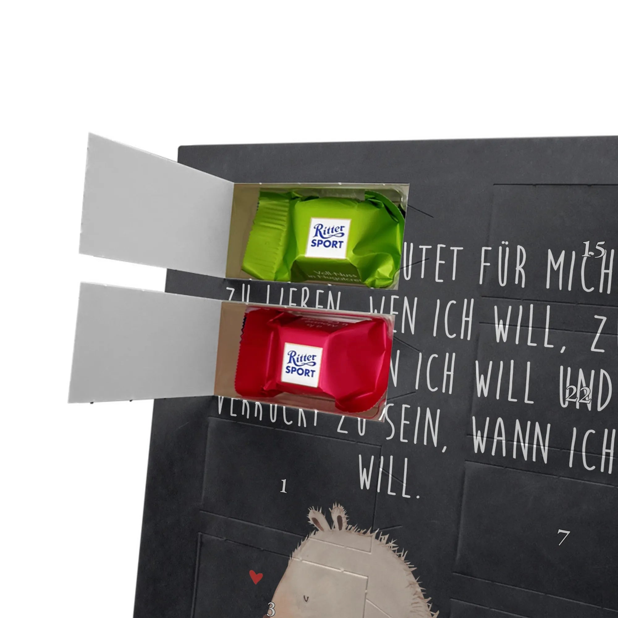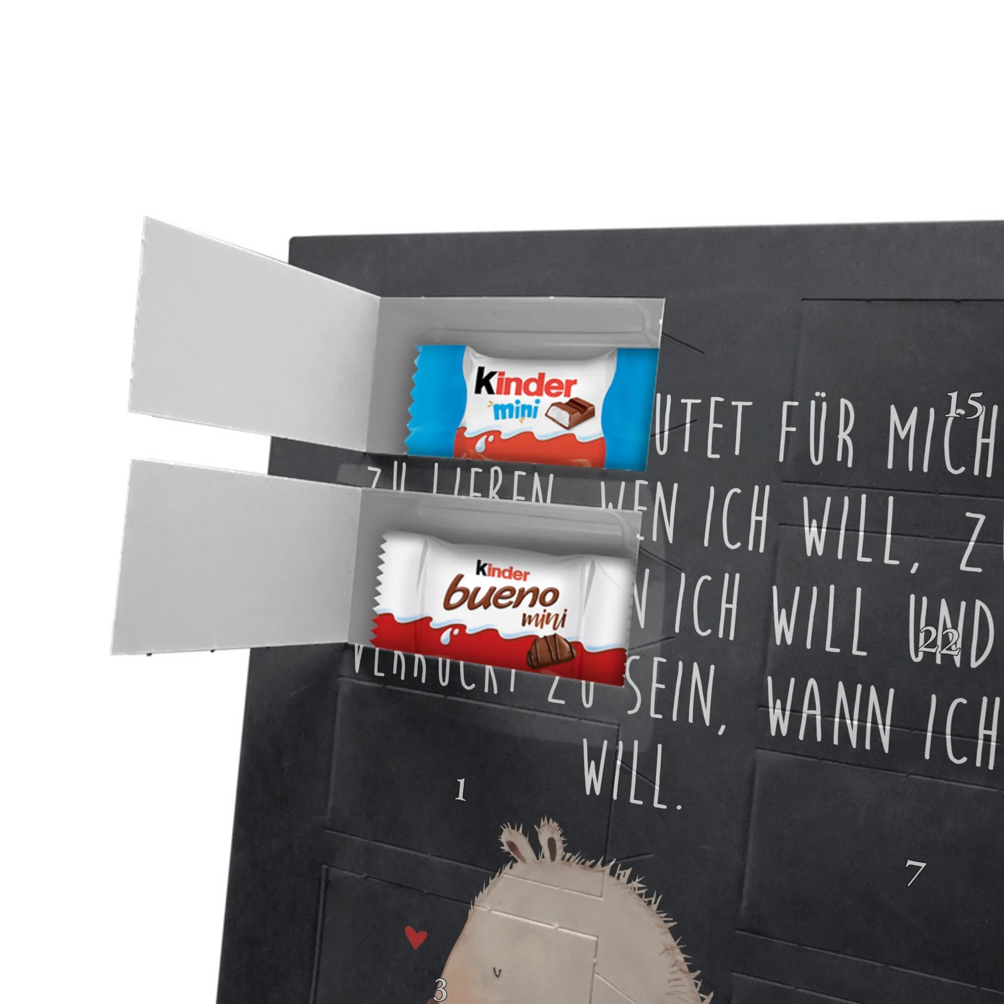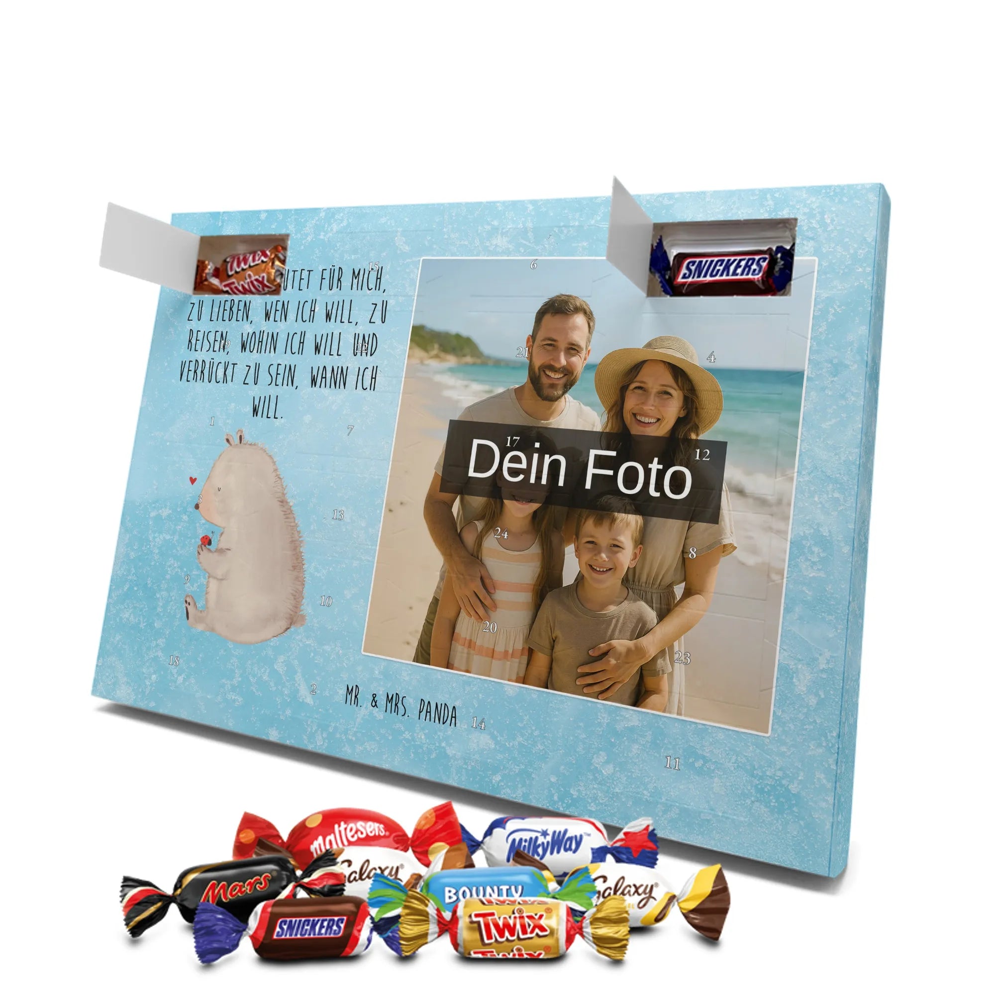 Personalisierter Schoko-Adventskalender mit Foto – das kleine Weihnachtswunder von Mr. & Mrs. Panda! Verschenke jeden Tag Vorfreude: Der Kalender ist liebevoll gestaltet mit unseren herzlichen Illustrationen und Sprüchen, während dein Foto die persönliche Mitte bildet. Bitte lade ein hochauflösendes Foto hoch und prüfe den Bildausschnitt, damit nichts Wichtiges verloren geht. Nutze nur Bilder, für die du die Rechte hast. Die hochwertige, seidenmatte Veredelung und die bedruckten Seitenflächen garantieren ein edles Erscheinungsbild. Maße: 355 mm x 245 mm x 11 mm; lässt sich sowohl aufhängen als auch aufstellen. Achtung: Fotos werden nicht nachbearbeitet oder zugeschnitten; personalisierte Artikel sind vom Rückgaberecht ausgeschlossen. Gefüllt mit 24 einzeln verpackten Schokoladentäfelchen aus den vier Geschmacksrichtungen Vollmilch, Nougat, Zartbitter und Haselnuss – von Sarotti® und Confiserie Heidel®. Insgesamt enthält der Kalender 107 g Markenschokolade. Ein persönliches Geschenk mit süßem Inhalt, ideal für Partner, Familie und Freunde, verpackt mit der typischen Mr. & Mrs. Panda Liebe zum Detail.