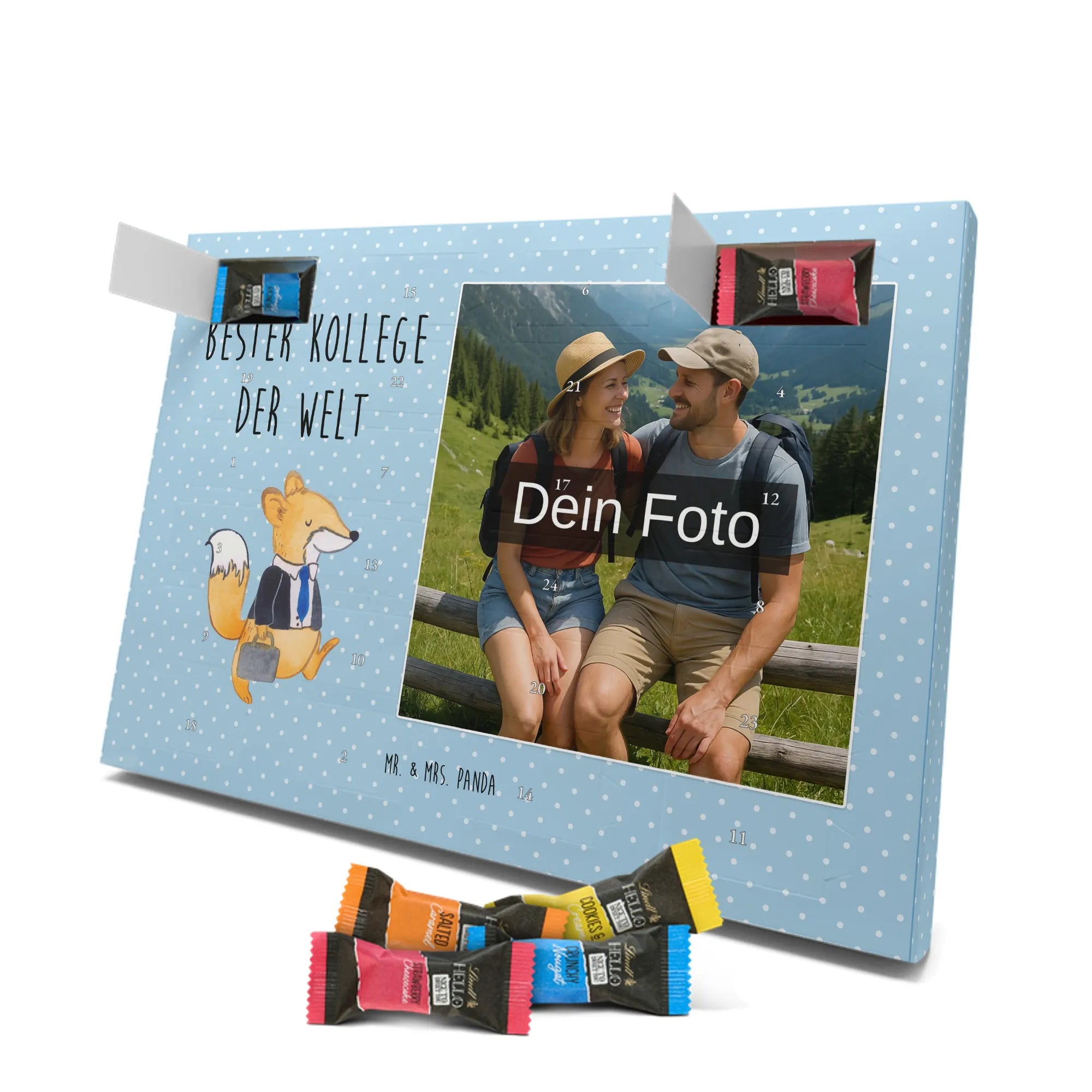 🐼 PERSONALISIERTES ADVENTS-SCHOKOKALENDER: Foto, Mr. & Mrs. Panda Motive & Lindt Hello Minis vereint.