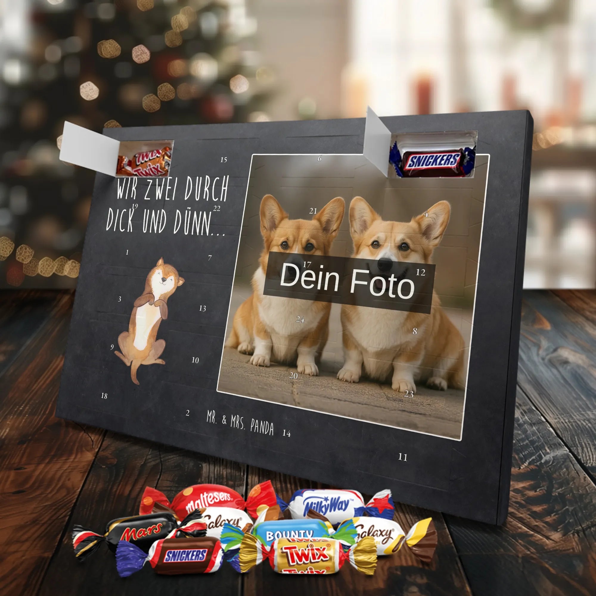 Lustiger Personalisierter Schoko Foto-Adventskalender – das Must-have für eine persönliche Adventszeit von Mr. & Mrs. Panda. Jeder Kalender wird mit unseren charmanten Illustrationen und liebevollen Sprüchen bedruckt, während dein Foto die Vorderseite einzigartig macht. Achte bitte darauf, ein Foto mit guter Qualität und ausreichend hoher Auflösung hochzuladen, damit der Druck gestochen scharf wirkt. Überprüfe den Bildausschnitt, damit wichtige Bereiche nicht verloren gehen. Denk daran, nur Bilder zu verwenden, bei denen du die nötigen Rechte besitzt. Die Verarbeitung ist hochwertig: brillante Druckqualität mit seidenmatter Oberflächenveredelung und bedruckten Seitenflächen. Maße: 325 mm x 225 mm x 27 mm. Du kannst den Kalender aufhängen oder aufstellen – sehr praktisch. Hinweis: Die hochgeladenen Fotos werden nicht nachbearbeitet oder zugeschnitten; Rücknahme bei personalisierten Foto-Artikeln ist ausgeschlossen. Gefüllt ist der Kalender mit Celebrations Schokolade – 24 Stück in 8 verschiedenen Sorten (Maltesers, Mars, Snickers, Twix, Milky Way, Bounty, Galaxy, Galaxy Caramel). Verschenke ein Stück persönlich gestaltete Vorfreude und mache jeden Dezembertag zu etwas Besonderem.