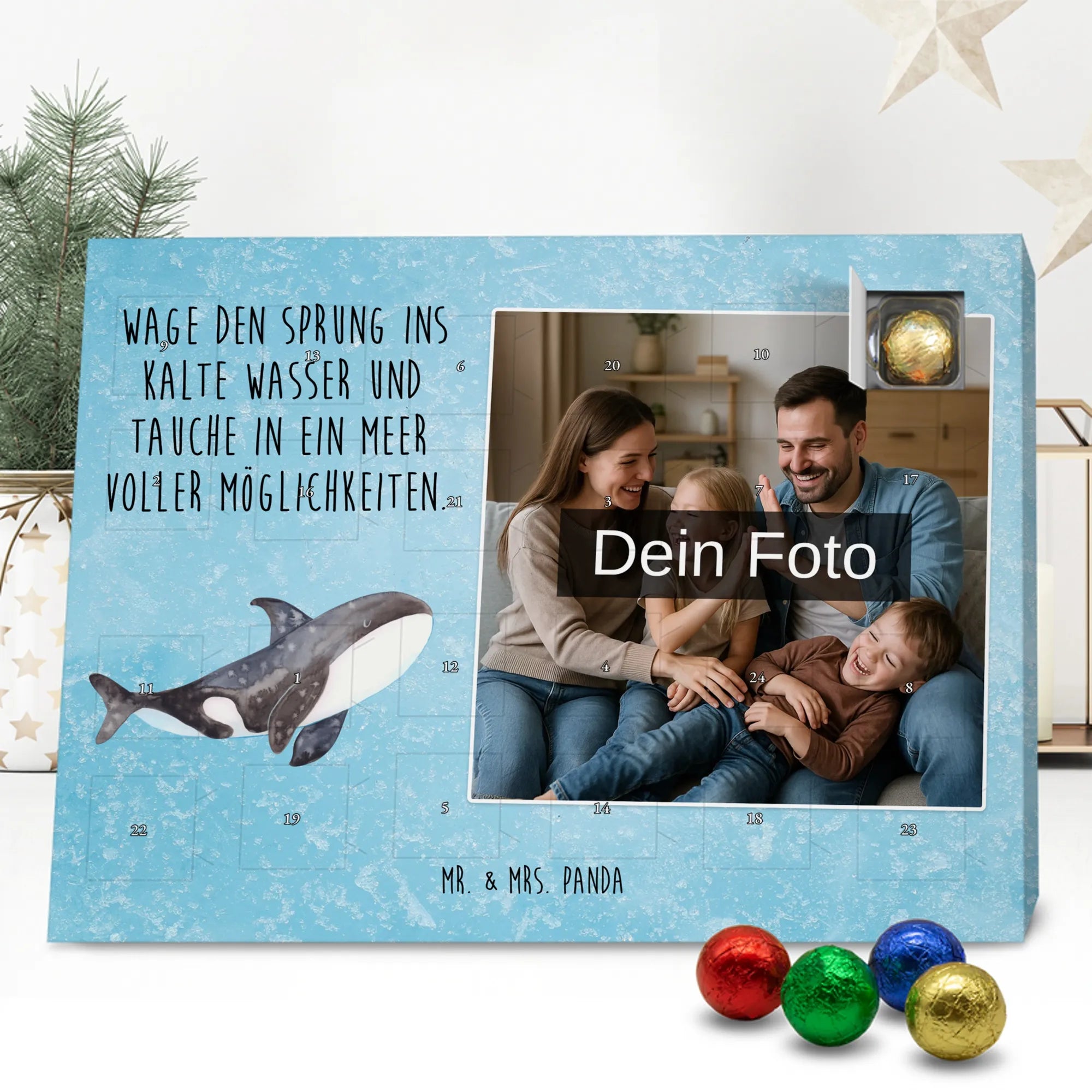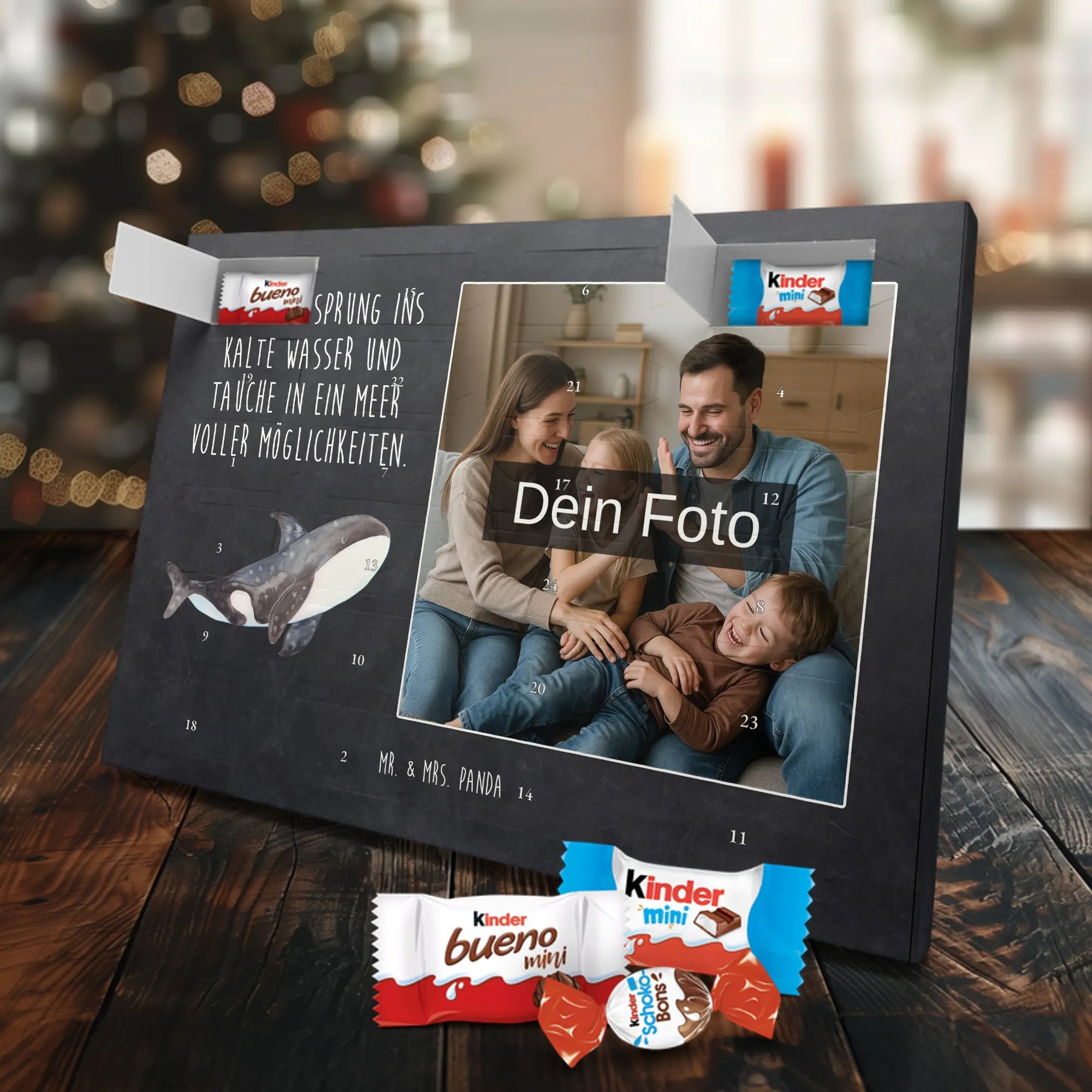Liebevoll gestalteter Personalisierter Foto-Adventskalender von Mr. & Mrs. Panda – perfektes Geschenk für alle, die Weihnachten mit einer persönlichen Note mögen. Du erhältst einen Adventskalender, bedruckt mit unseren typischen Mr. & Mrs. Panda Motiven & Sprüchen, und kannst ein eigenes Foto einfügen. Bitte lade ein Foto in hoher Auflösung hoch und achte auf den Bildausschnitt, damit wichtige Gesichter und Details nicht verloren gehen. Verwende nur Bilder, für die du die Rechte besitzt oder eine Erlaubnis hast. Der Kalender überzeugt durch brillante Druckqualität, eine seidenmatte Oberflächenveredelung und bedruckte Seitenflächen. Maße: 233 mm x 178 mm x 24 mm. Besonderheit: Der Kalender kann aufgehängt oder aufgestellt werden. Hinweis: Die Fotos werden weder aufbereitet noch zugeschnitten; Rücknahme bei personalisierten Foto-Artikeln ist ausgeschlossen. Gefüllt mit MARKENNAMEN Schokolade und leckeren Schokoladenkugeln. Kann Spuren von Haselnüssen, Mandeln, Gluten und Soja enthalten. Kühl und trocken lagern. Ein emotionales, süßes Geschenk, das an jedem Adventstag Freude und Erinnerungen schenkt.