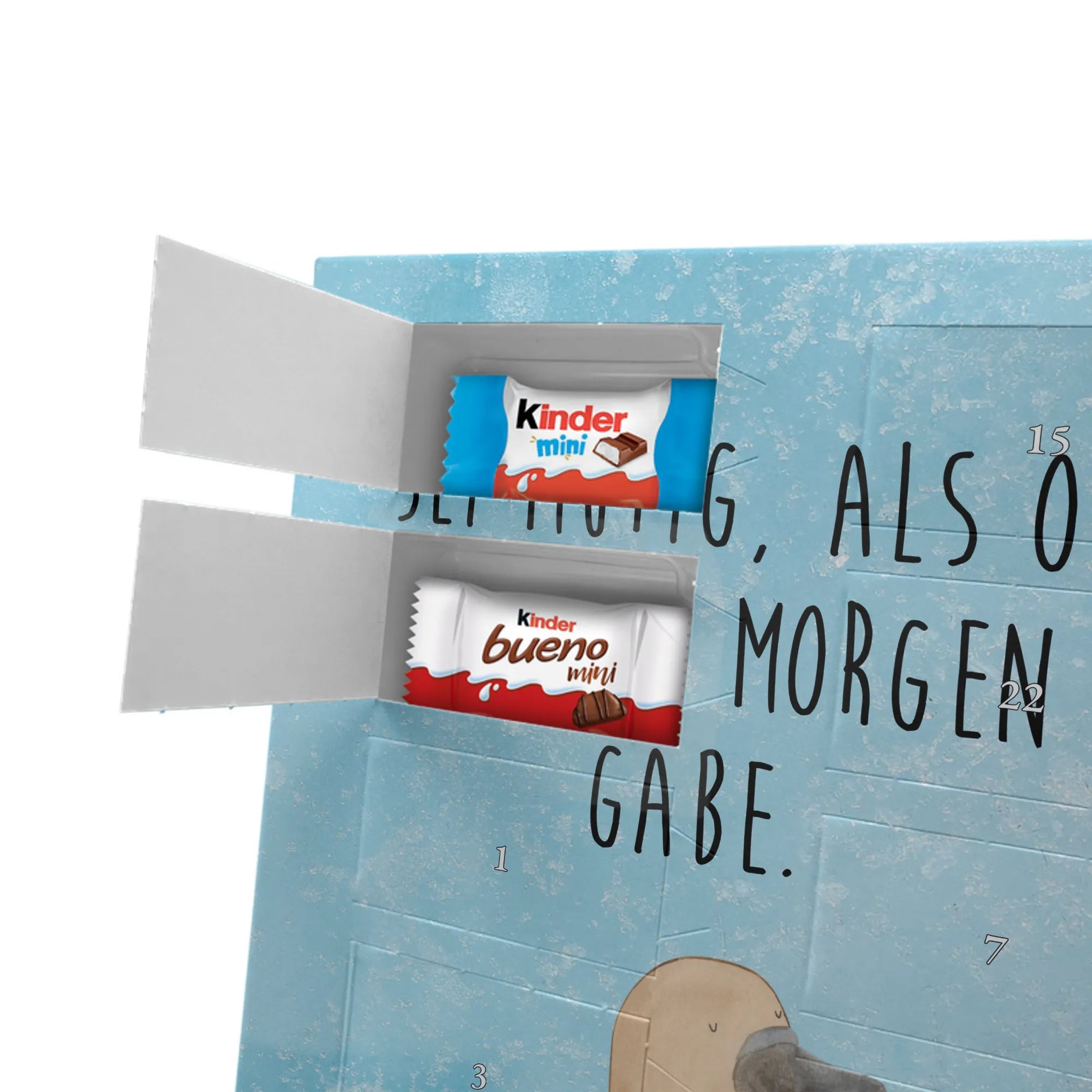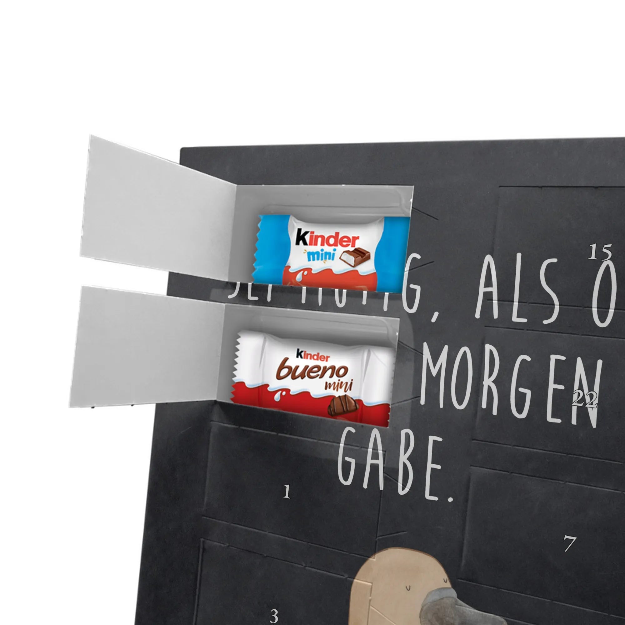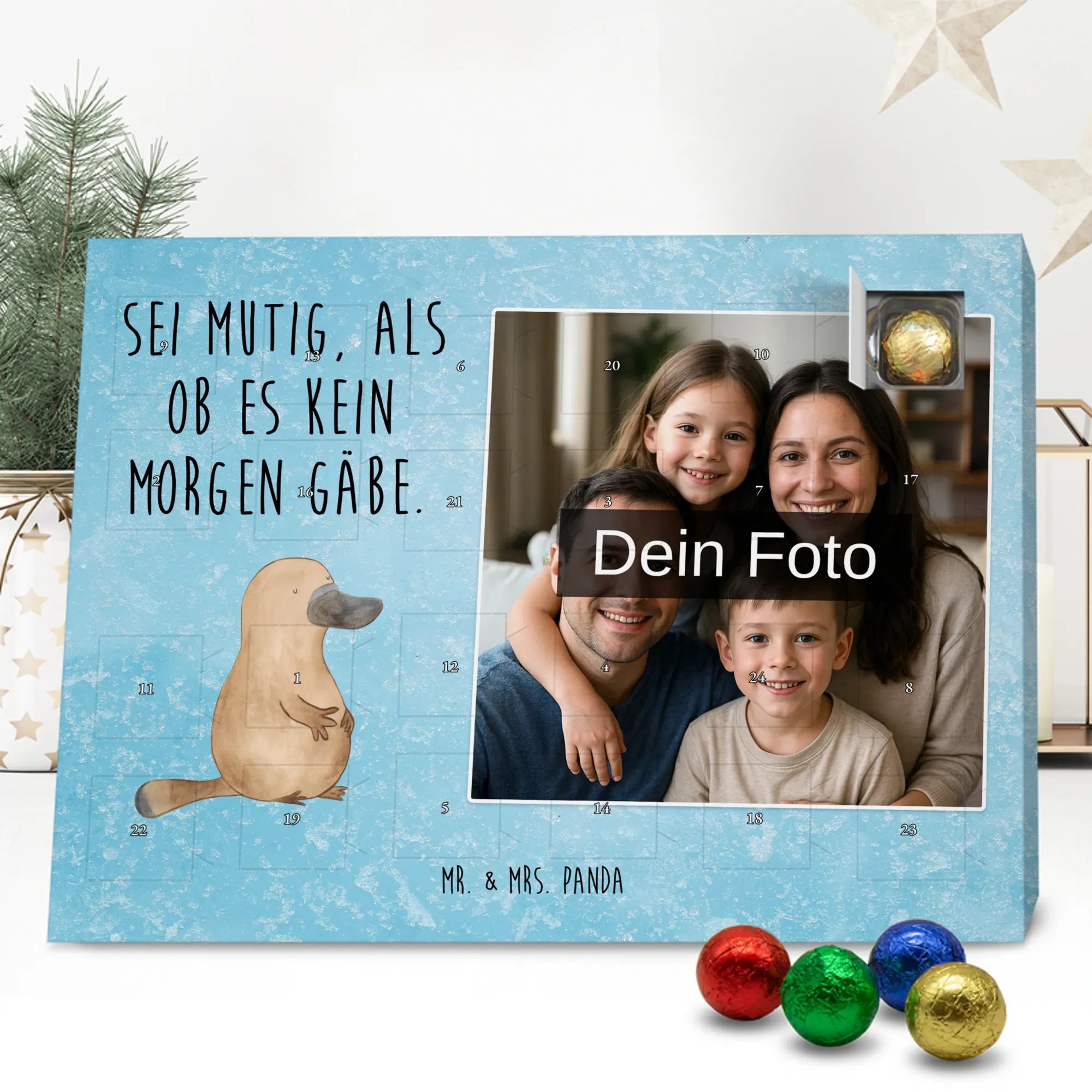 Liebevoller Foto Adventskalender personalisiert von Mr. & Mrs. Panda – der perfekte Begleiter durch die Adventszeit. Bedruckt mit unseren beliebten Motiven & Sprüchen, kannst du den Kalender mit einem persönlichen Foto versehen. Achte auf hohe Auflösung und einen passenden Bildausschnitt, damit das Motiv optimal zur Geltung kommt. Verwende nur Bilder, für die du die Rechte besitzt, um rechtliche Probleme zu vermeiden. Der Kalender bietet brillante Druckqualität, eine seidenmatte Oberflächenveredelung und bedruckte Seitenflächen. Maße: 233 mm x 178 mm x 24 mm. Besonderheit: Er lässt sich sowohl aufstellen als auch aufhängen. Bitte beachte: Die Fotos werden weder aufbereitet noch zugeschnitten, daher ist eine Rücknahme bei personalisierten Foto-Artikeln ausgeschlossen. Gefüllt mit MARKENNAMEN Schokolade und leckeren Schokoladenkugeln. Hinweis: Kann Spuren von Haselnüssen, Mandeln, Gluten und Soja enthalten. Kühl und trocken lagern. Schenke persönliche Vorfreude – jeden Tag ein kleines Highlight mit Schokolade und Erinnerungen.