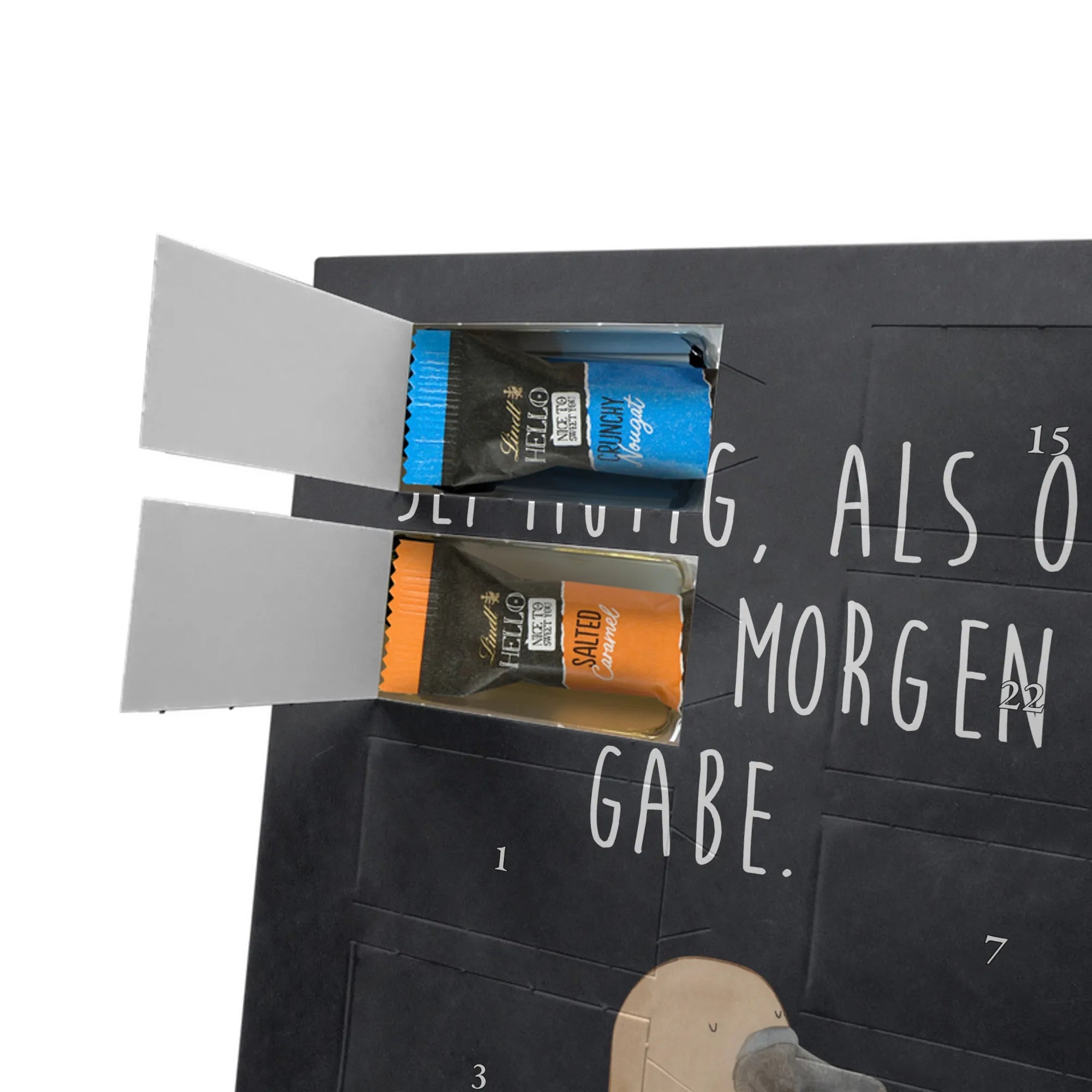 Entdecke unseren charmanten Personalisierter Schoko-Foto Adventskalender von Mr. & Mrs. Panda – ein liebevolles Geschenk für Freunde, Familie oder dich selbst. Aufdrucke mit süßen Motiven und herzlichen Sprüchen begleiten dein persönliches Foto, das du individuell hochlädst. Achte bitte auf eine ausreichende Auflösung des Bildes und einen passenden Bildausschnitt, damit das Druckbild klar bleibt. Wir weisen darauf hin, dass Fotos nicht nachbearbeitet oder zugeschnitten werden; achte daher auf Bildrechte und Zustimmung der abgebildeten Personen. Die Verarbeitung überzeugt durch eine seidenmatte Oberflächenveredelung und bedruckte Seitenflächen; dadurch wirkt der Kalender sehr hochwertig. Der Kalender ist vielseitig: Du kannst ihn sowohl aufstellen als auch aufhängen. Maße: 233 mm x 178 mm x 24 mm. Gefüllt mit Lindt Lindor Markenschokolade – 24 einzeln verpackte Markenschokoladen Kugeln in den Geschmacksrichtungen Vollmilch, Feinherb und Weiße Schokolade. Zutaten und Allergene sind auf der Verpackung angegeben; es kann Spuren von Haselnüssen und Mandeln geben. Hinweis: Personalisierte Foto-Artikel sind vom Umtausch ausgeschlossen.