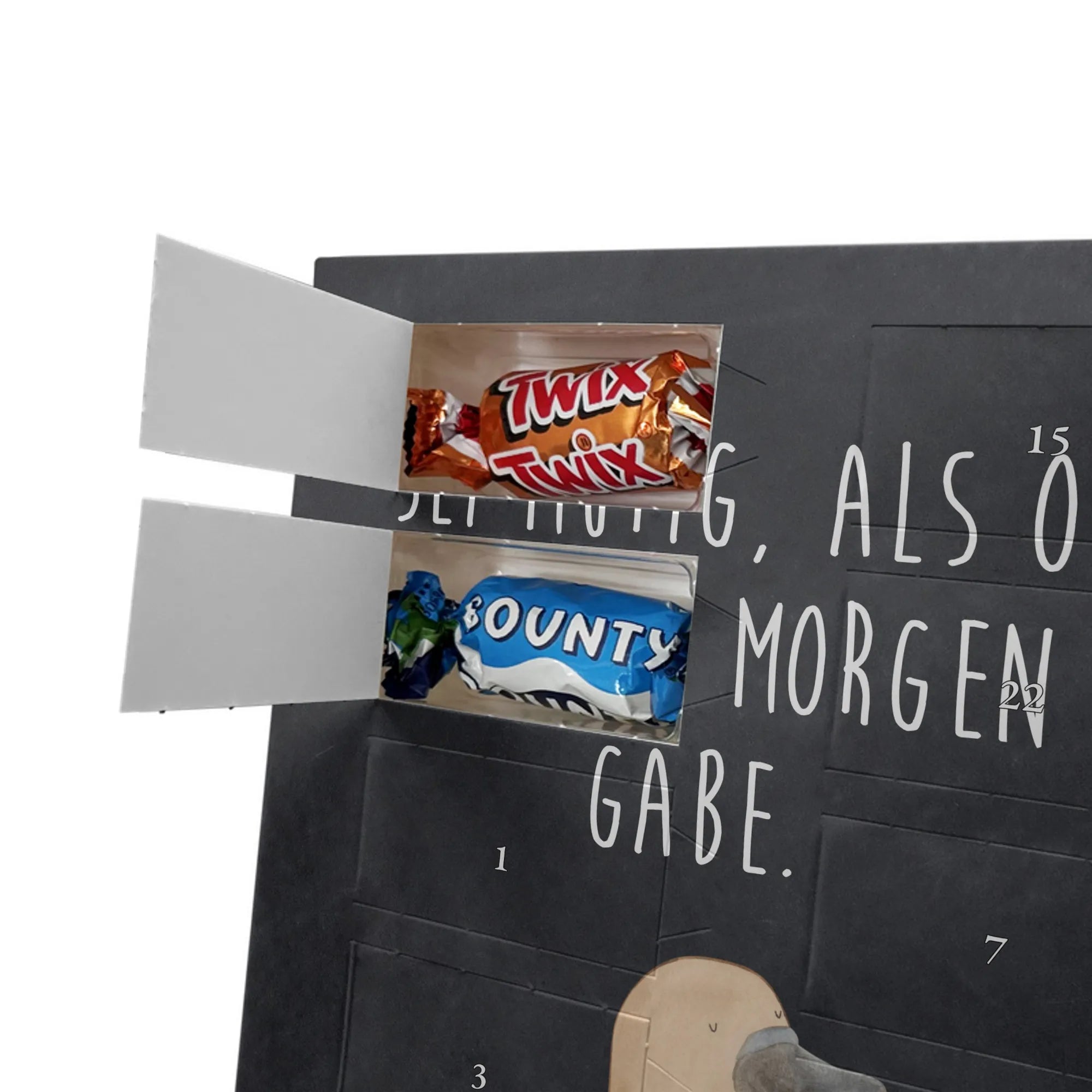 Lustiger Personalisierter Schoko Foto-Adventskalender – das Must-have für eine persönliche Adventszeit von Mr. & Mrs. Panda. Jeder Kalender wird mit unseren charmanten Illustrationen und liebevollen Sprüchen bedruckt, während dein Foto die Vorderseite einzigartig macht. Achte bitte darauf, ein Foto mit guter Qualität und ausreichend hoher Auflösung hochzuladen, damit der Druck gestochen scharf wirkt. Überprüfe den Bildausschnitt, damit wichtige Bereiche nicht verloren gehen. Denk daran, nur Bilder zu verwenden, bei denen du die nötigen Rechte besitzt. Die Verarbeitung ist hochwertig: brillante Druckqualität mit seidenmatter Oberflächenveredelung und bedruckten Seitenflächen. Maße: 325 mm x 225 mm x 27 mm. Du kannst den Kalender aufhängen oder aufstellen – sehr praktisch. Hinweis: Die hochgeladenen Fotos werden nicht nachbearbeitet oder zugeschnitten; Rücknahme bei personalisierten Foto-Artikeln ist ausgeschlossen. Gefüllt ist der Kalender mit Celebrations Schokolade – 24 Stück in 8 verschiedenen Sorten (Maltesers, Mars, Snickers, Twix, Milky Way, Bounty, Galaxy, Galaxy Caramel). Verschenke ein Stück persönlich gestaltete Vorfreude und mache jeden Dezembertag zu etwas Besonderem.