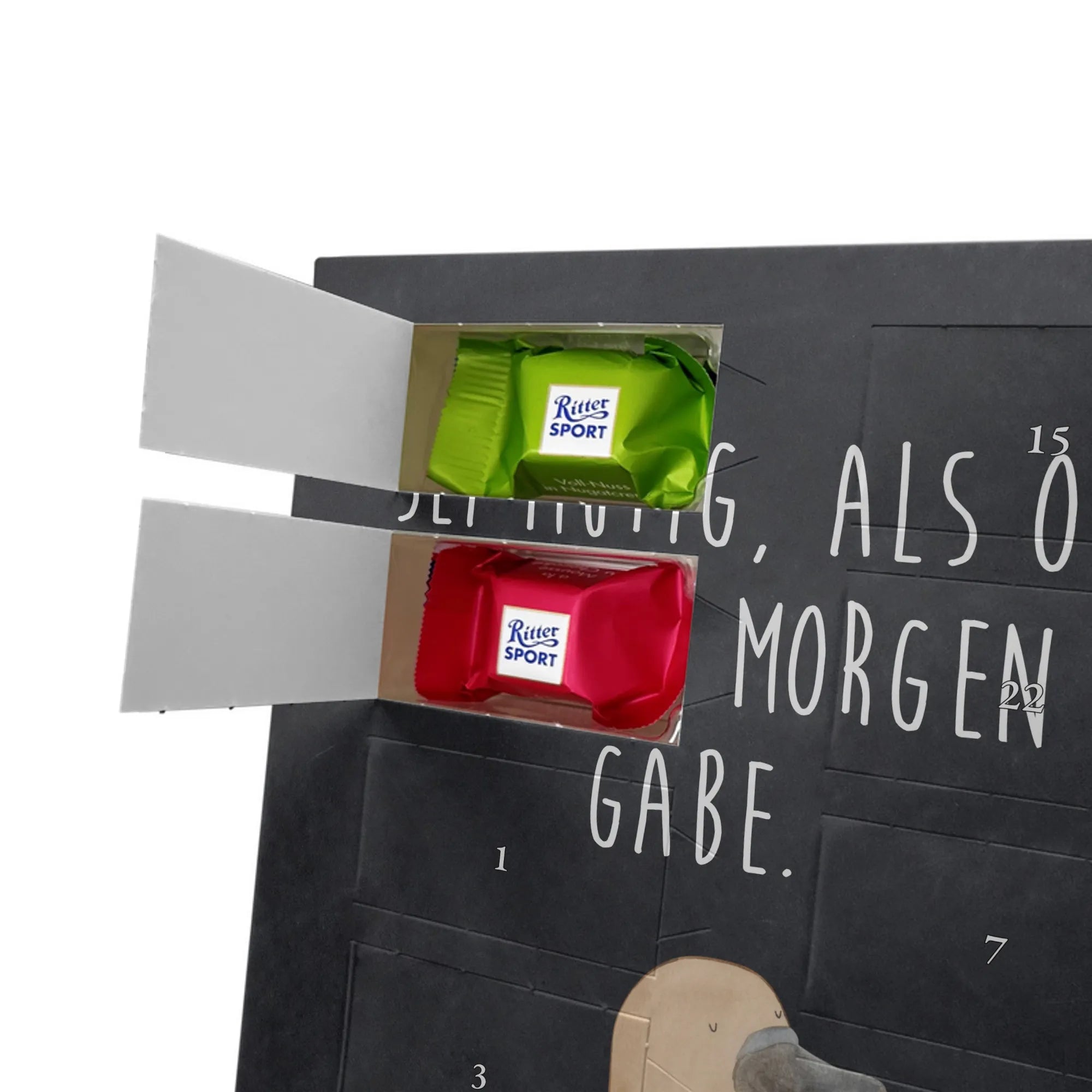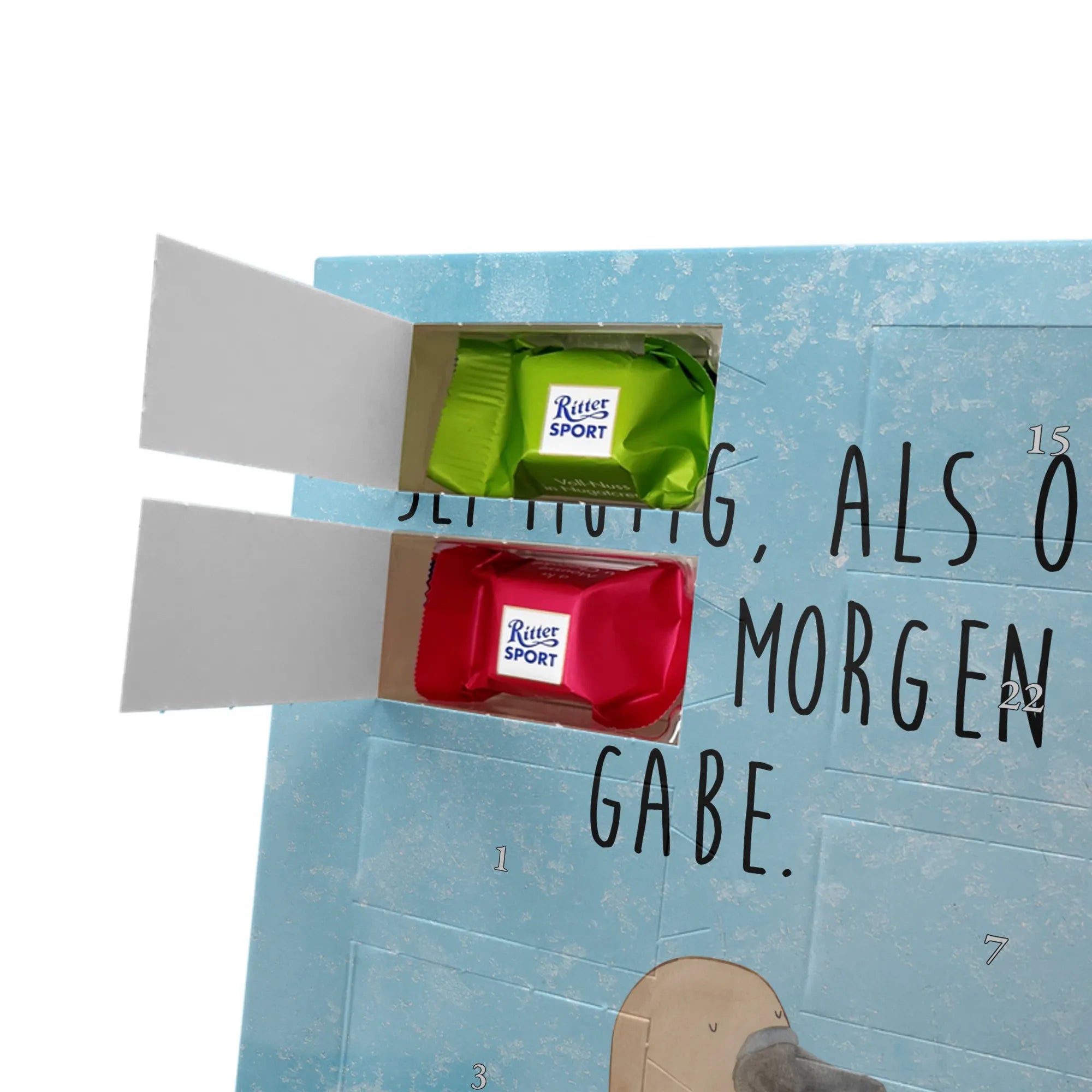 Schoko Foto Adventskalender personalisiert – ein fröhlicher Hingucker von Mr. & Mrs. Panda, der Adventszeit und Erinnerungen verbindet. Der Kalender ist bedruckt mit zauberhaften Motiven & Sprüchen von Mr. & Mrs. Panda und lässt sich ganz leicht mit einem Foto deiner Wahl personalisieren. Achtung Bildqualität: Für ein scharfes Druckbild solltest du ein Foto in hoher Auflösung verwenden. Kontrolliere den Bildausschnitt, damit wichtige Gesichter oder Details nicht verloren gehen. Verwende nur Fotos, für die du die Rechte besitzt oder die frei nutzbar sind. Bitte beachte: Die Fotos werden weder nachbearbeitet noch zugeschnitten und personalisierte Foto Artikel sind vom Umtausch ausgeschlossen. Die Verarbeitung überzeugt mit seidenmatter Oberflächenveredelung und bedruckten Seitenflächen für ein edles Finish. Maße: 325 mm x 225 mm x 27 mm. Besonderheit: Du kannst den Kalender aufhängen oder aufstellen – ganz flexibel. Gefüllt ist der Kalender mit Ritter Sport Schokowürfeln in leckeren Geschmacksrichtungen wie Mousse au Chocolat, Schoko Crisp, Voll-Nuss in Nougatcreme, Karamell Duo, Joghurt und Erdbeer-Joghurt. Ein liebevolles Geschenk, das jeden Tag im Advent versüßt.