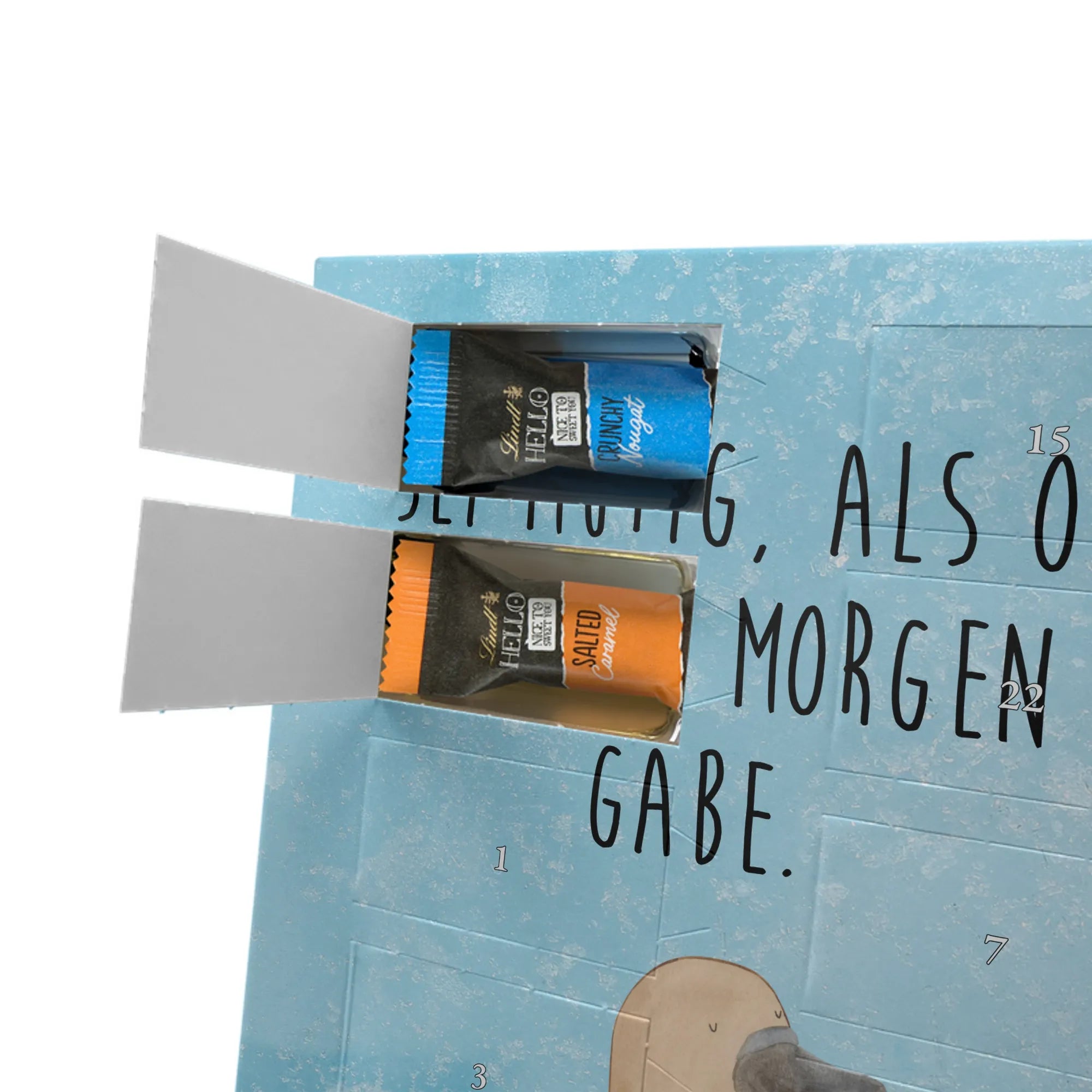 Wunderschöner Personalisierter Schoko Foto Adventskalender von Mr. & Mrs. Panda – perfekt, um dir oder deinen Liebsten die Vorweihnachtszeit zu versüßen. Dieser Adventskalender ist mit liebevollen Motiven und herzlichen Sprüchen von Mr. & Mrs. Panda bedruckt und du kannst ihn ganz einfach mit einem persönlichen Foto individualisieren. Achte bitte darauf, dass dein Foto eine hohe Auflösung hat und der Bildausschnitt passt, damit das Druckergebnis klar und strahlend wird. Lade nur Bilder hoch, an denen du die Bildrechte besitzt oder für die du die Erlaubnis hast. Die brillante Druckqualität mit seidenmatter Oberflächenveredelung sorgt für einen edlen Look, die Seitenflächen sind ebenfalls bedruckt. Maße: 325 mm x 225 mm x 27 mm. Der Kalender enthält 24 einzeln verpackte Schokoladen Mini Sticks in vier verschiedenen Sorten: Karamell-Schokoladenkuchen, Kekse, Knuspriger Nougat und Erdbeer-Cheesecake. Gefüllt mit Lindt Hello Schokolade. Allergene: Milcheiweiß, Milchzucker, Soja, Weizen, Haselnüsse. Kann Mandeln und andere Schalenfrüchte enthalten. Besonderheiten: Der Kalender kann aufgehängt oder aufgestellt werden. Bitte beachte: Die Fotos werden weder aufbereitet noch zugeschnitten – Rücknahme bei personalisierten Foto-Artikeln ist ausgeschlossen. Wir von Mr. & Mrs. Panda wünschen dir eine zuckersüße Adventszeit mit deinem ganz persönlichen Foto-Adventskalender!