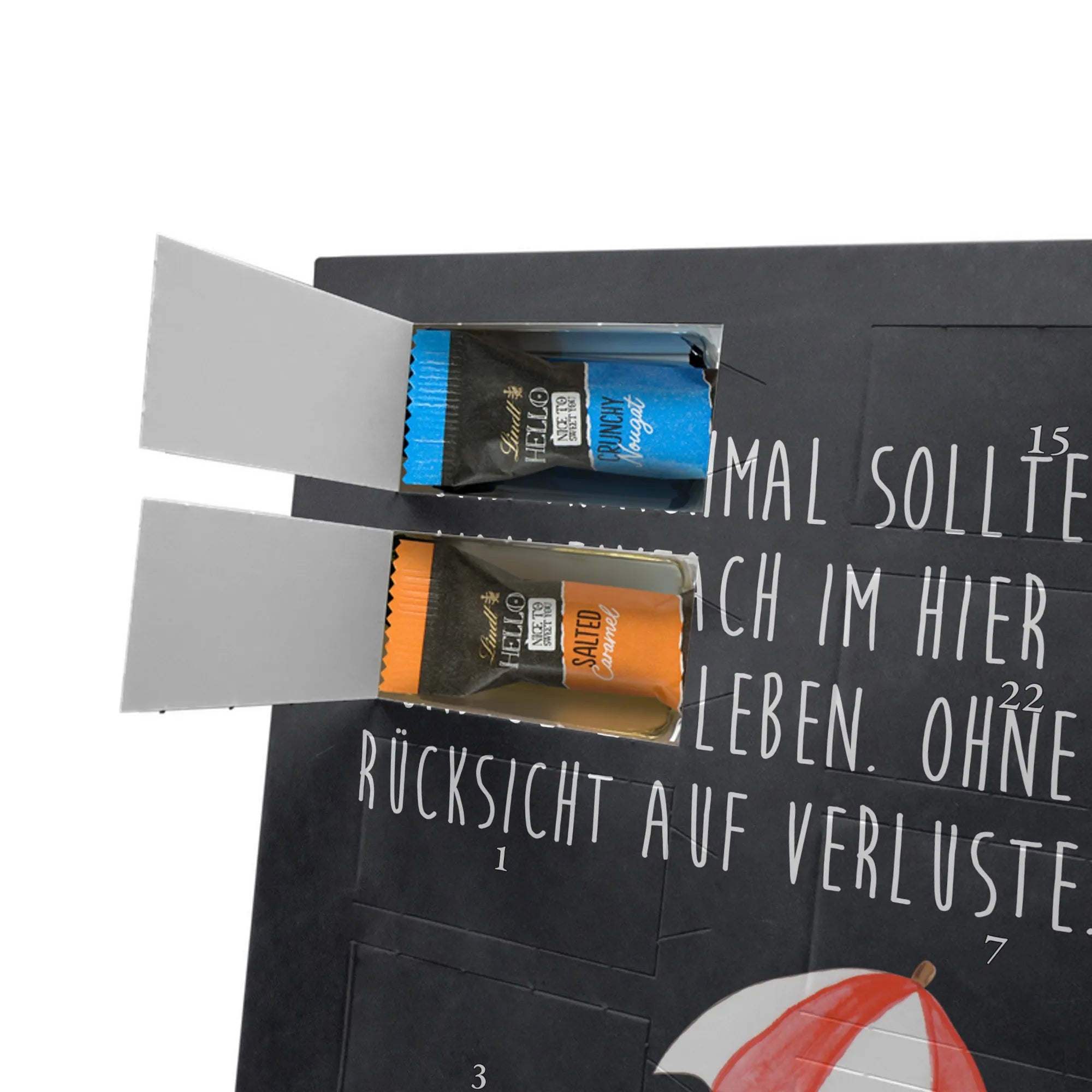 Entdecke unseren charmanten Personalisierter Schoko-Foto Adventskalender von Mr. & Mrs. Panda – ein liebevolles Geschenk für Freunde, Familie oder dich selbst. Aufdrucke mit süßen Motiven und herzlichen Sprüchen begleiten dein persönliches Foto, das du individuell hochlädst. Achte bitte auf eine ausreichende Auflösung des Bildes und einen passenden Bildausschnitt, damit das Druckbild klar bleibt. Wir weisen darauf hin, dass Fotos nicht nachbearbeitet oder zugeschnitten werden; achte daher auf Bildrechte und Zustimmung der abgebildeten Personen. Die Verarbeitung überzeugt durch eine seidenmatte Oberflächenveredelung und bedruckte Seitenflächen; dadurch wirkt der Kalender sehr hochwertig. Der Kalender ist vielseitig: Du kannst ihn sowohl aufstellen als auch aufhängen. Maße: 233 mm x 178 mm x 24 mm. Gefüllt mit Lindt Lindor Markenschokolade – 24 einzeln verpackte Markenschokoladen Kugeln in den Geschmacksrichtungen Vollmilch, Feinherb und Weiße Schokolade. Zutaten und Allergene sind auf der Verpackung angegeben; es kann Spuren von Haselnüssen und Mandeln geben. Hinweis: Personalisierte Foto-Artikel sind vom Umtausch ausgeschlossen.