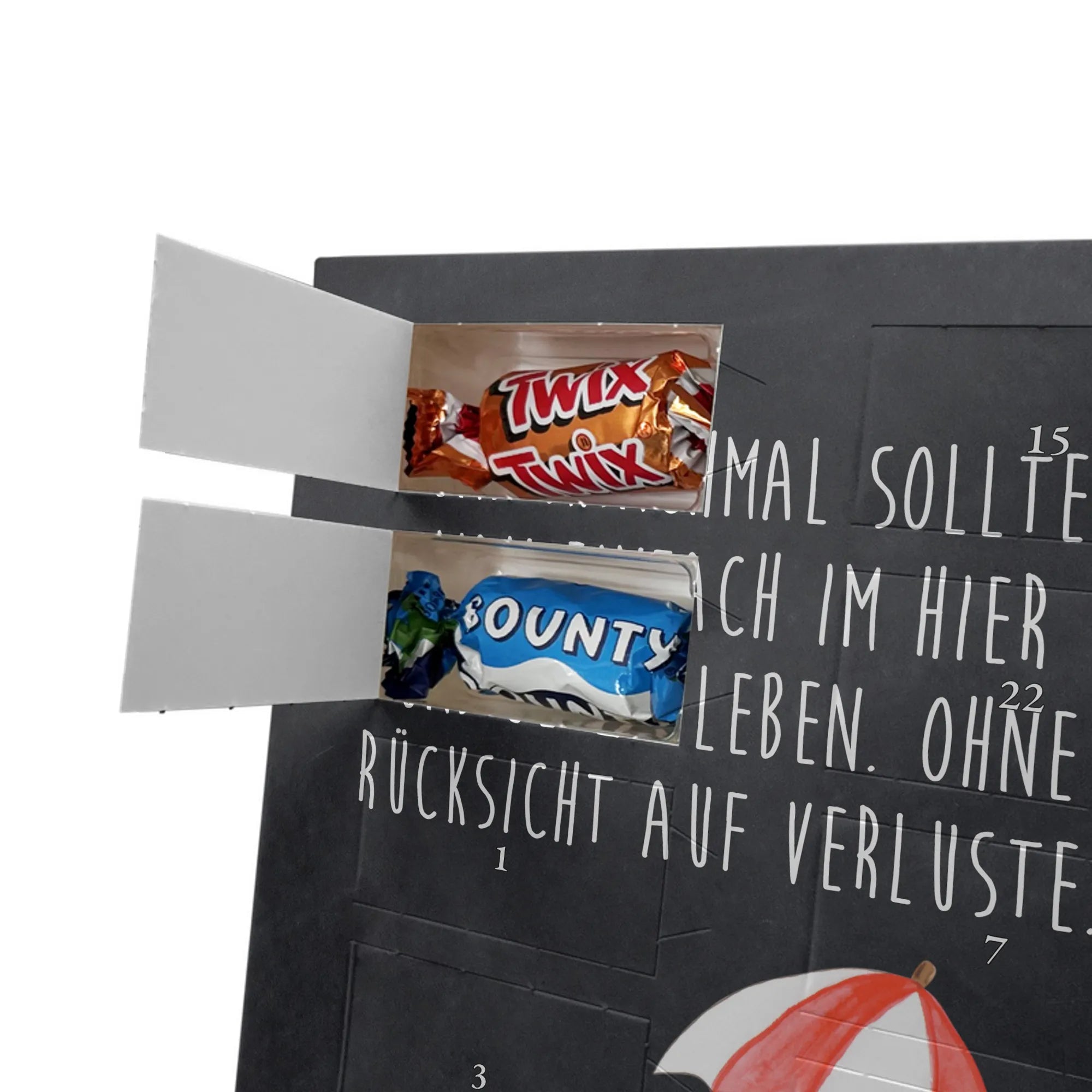 Lustiger Personalisierter Schoko Foto-Adventskalender – das Must-have für eine persönliche Adventszeit von Mr. & Mrs. Panda. Jeder Kalender wird mit unseren charmanten Illustrationen und liebevollen Sprüchen bedruckt, während dein Foto die Vorderseite einzigartig macht. Achte bitte darauf, ein Foto mit guter Qualität und ausreichend hoher Auflösung hochzuladen, damit der Druck gestochen scharf wirkt. Überprüfe den Bildausschnitt, damit wichtige Bereiche nicht verloren gehen. Denk daran, nur Bilder zu verwenden, bei denen du die nötigen Rechte besitzt. Die Verarbeitung ist hochwertig: brillante Druckqualität mit seidenmatter Oberflächenveredelung und bedruckten Seitenflächen. Maße: 325 mm x 225 mm x 27 mm. Du kannst den Kalender aufhängen oder aufstellen – sehr praktisch. Hinweis: Die hochgeladenen Fotos werden nicht nachbearbeitet oder zugeschnitten; Rücknahme bei personalisierten Foto-Artikeln ist ausgeschlossen. Gefüllt ist der Kalender mit Celebrations Schokolade – 24 Stück in 8 verschiedenen Sorten (Maltesers, Mars, Snickers, Twix, Milky Way, Bounty, Galaxy, Galaxy Caramel). Verschenke ein Stück persönlich gestaltete Vorfreude und mache jeden Dezembertag zu etwas Besonderem.