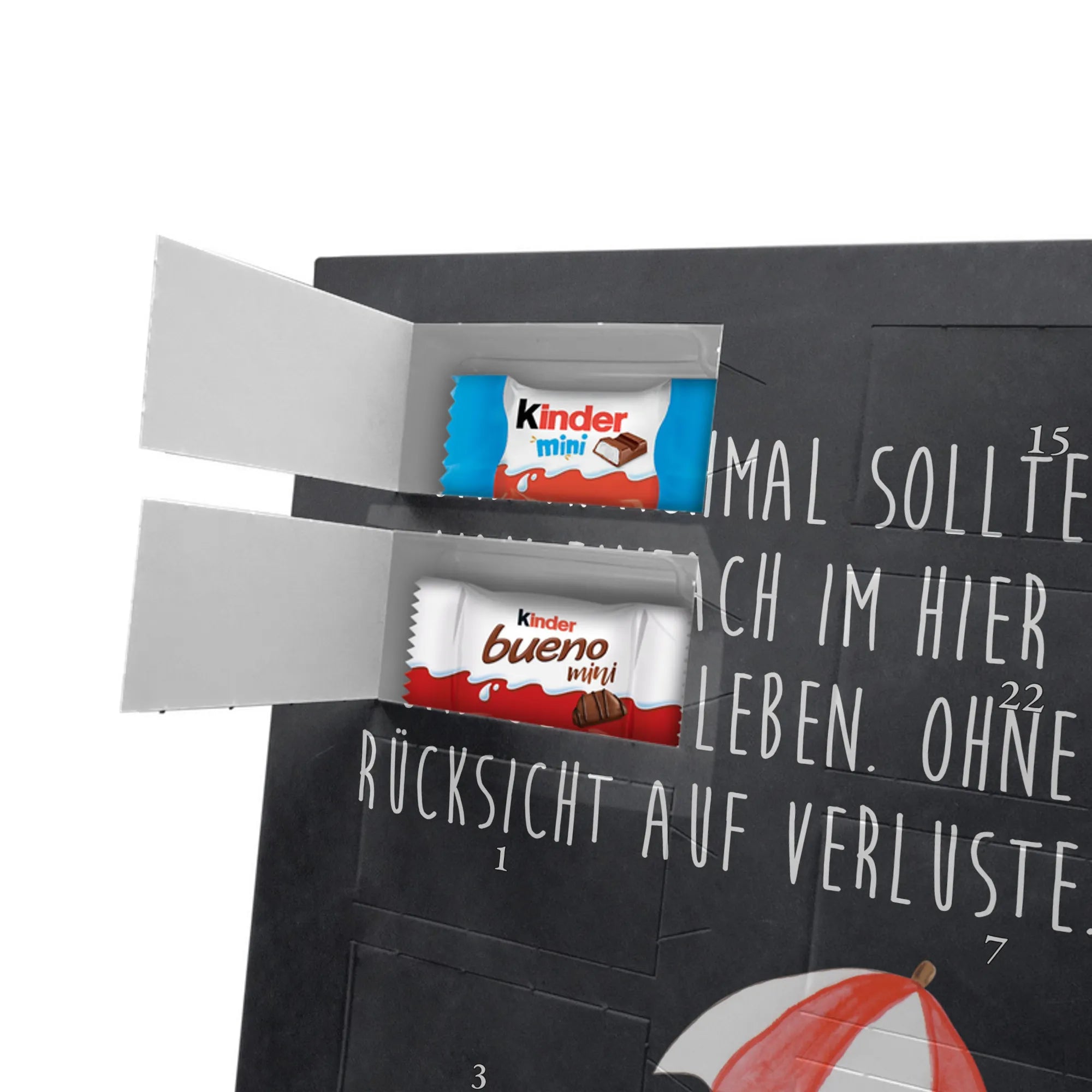 Personalisierter Schoko-Foto-Adventskalender von Mr. & Mrs. Panda – perfekt, wenn du ein einzigartiges, herzhaft-süßes Geschenk suchst. Du lädst ein Foto hoch, das wir auf der Vorderseite platzieren; der Rest des Kalenders ist mit unseren liebevollen Illustrationen und frechen Sprüchen gestaltet. Achte bitte darauf, dass das Bild eine hohe Auflösung hat und der Bildausschnitt passt, damit das Druckbild schön und scharf wird. Lade nur Fotos hoch, an denen du die Rechte besitzt oder für die du die Erlaubnis hast. Wichtig: Wir bearbeiten oder kürzen die Fotos nicht und personalisierte Artikel sind vom Rückgaberecht ausgeschlossen. Die hochwertige, seidenmatte Oberflächenveredelung sorgt für edle Optik, die bedruckten Seitenflächen geben dem Kalender eine liebevolle Note. Maße: 355 mm x 245 mm x 11 mm. Du kannst den Kalender aufstellen oder aufhängen – ganz wie du möchtest. Gefüllt ist er mit kinder® Schokolade: enthalten sind kinder® Schoko-Bons, kinder® Bueno mini und kinder® Schokolade mini. Wir empfehlen, vor dem Hochladen den Bildausschnitt am Bildschirm zu prüfen, damit Gesichter und wichtige Details nicht abgeschnitten werden. Dieser Adventskalender ist ideal für Paare, Familien und als persönliches Mitbringsel – mit ganz viel Mr. & Mrs. Panda Herz.