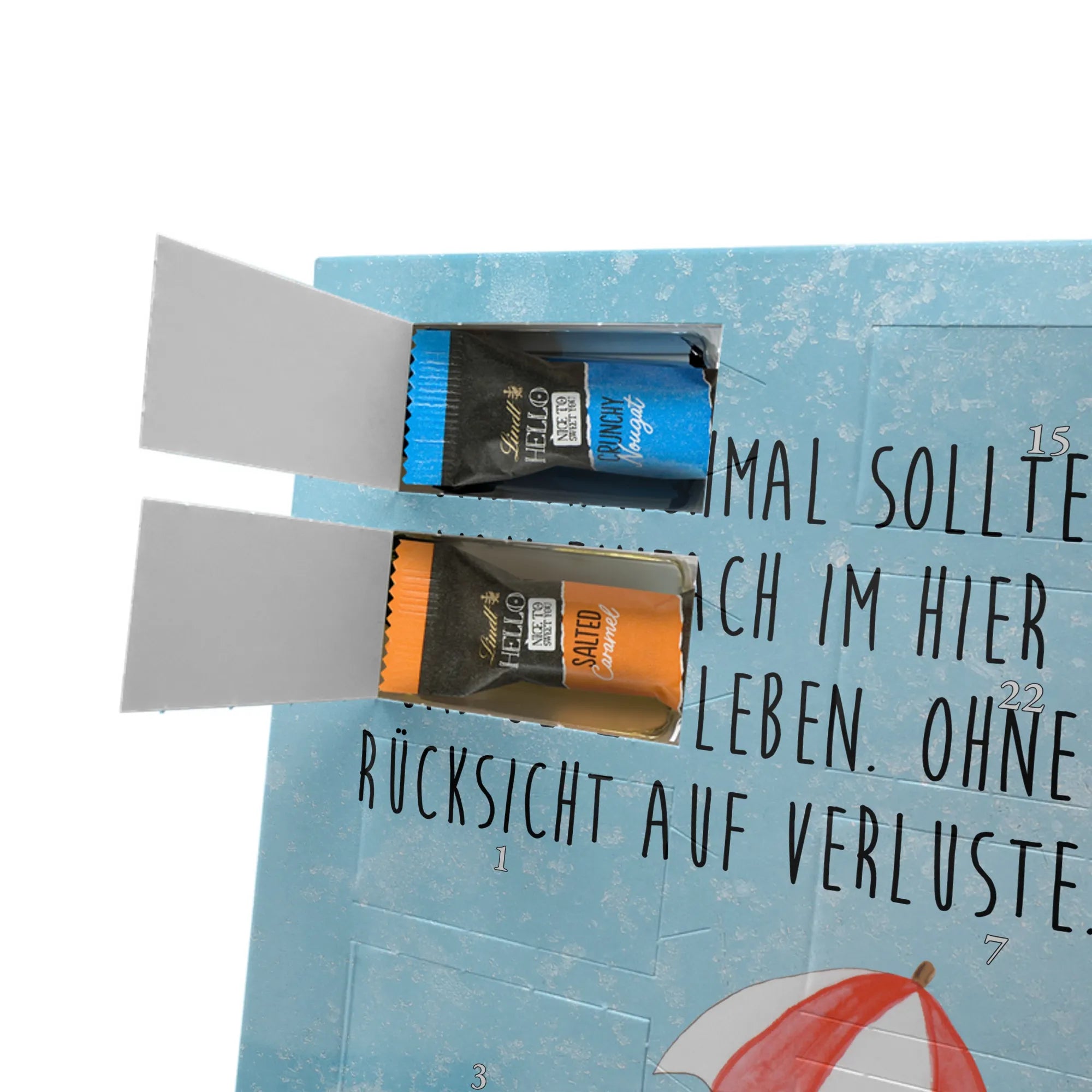 Verschenke Vorfreude: Unser individueller Foto-Adventskalender mit Schokolade von Mr. & Mrs. Panda macht jeden Dezembertag zum kleinen Fest. Der Kalender kombiniert bezaubernde Illustrationen und Sprüche von Mr. & Mrs. Panda mit deinem eigenen Foto – so entsteht ein ganz persönliches Geschenk. Achte auf Bildqualität und Bildausschnitt, damit das Foto optimal zur Geltung kommt, und nutze nur Bilder, für die du die Rechte besitzt. Die hochwertige seidenmatte Oberfläche mit bedruckten Seitenflächen veredelt das Design. Maße: 325 mm x 225 mm x 27 mm. Gefüllt mit Lindt Hello Schokolade: 24 einzeln verpackte Mini Sticks in den Sorten Karamell-Schokoladenkuchen, Kekse, Knuspriger Nougat und Erdbeer-Cheesecake. Zutaten und Allergene findest du auf der Verpackung; enthalten sind z. B. Milcheiweiß, Milchzucker, Soja, Weizen und Haselnüsse. Besonderheit: Du kannst den Kalender aufstellen oder an der Wand aufhängen. Bitte beachten: Die Fotos werden weder aufbereitet noch zugeschnitten – personalisierte Foto-Artikel sind vom Rückgaberecht ausgeschlossen. Hol dir ein Stück Adventszauber mit deinem persönlichen Foto-Adventskalender!