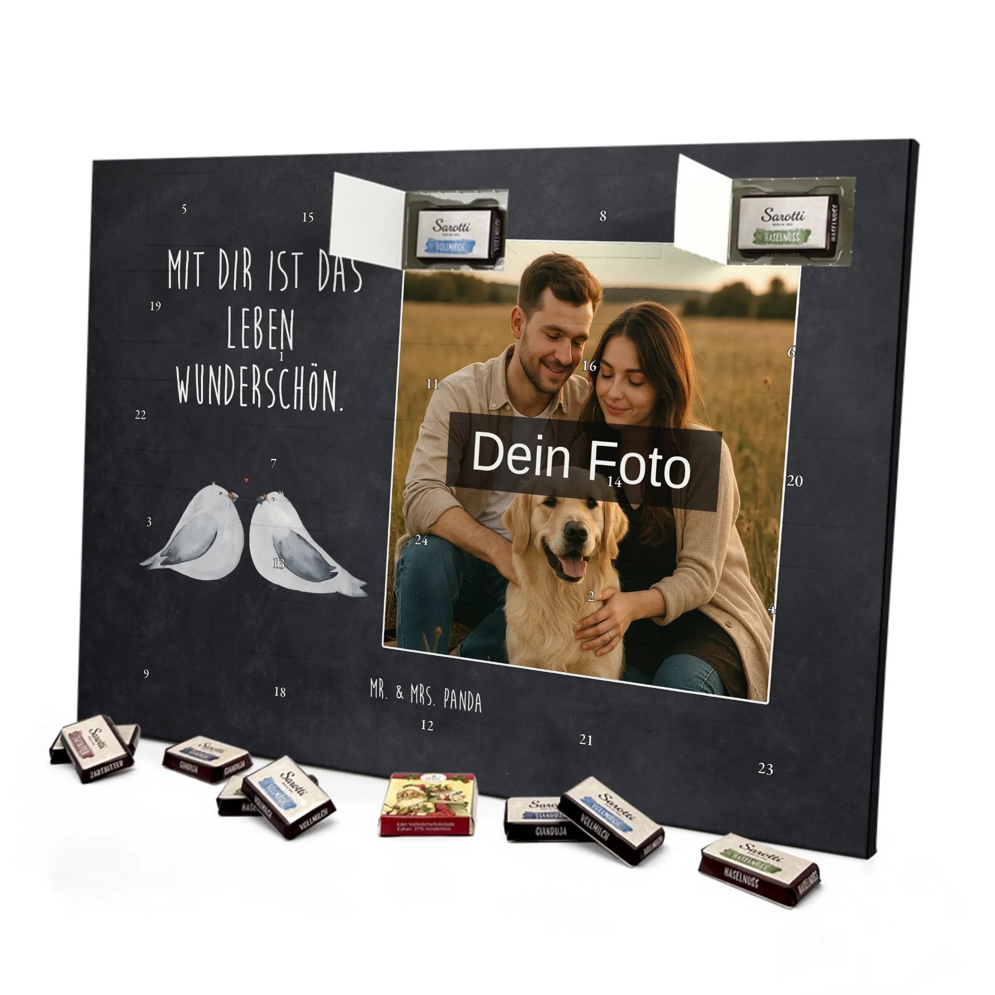 🐼 PERSONALISIERTER KALENDER: Foto-Adventskalender mit Mr. & Mrs. Panda Motiven und 24 Celebrations Schokoladenfüllungen.