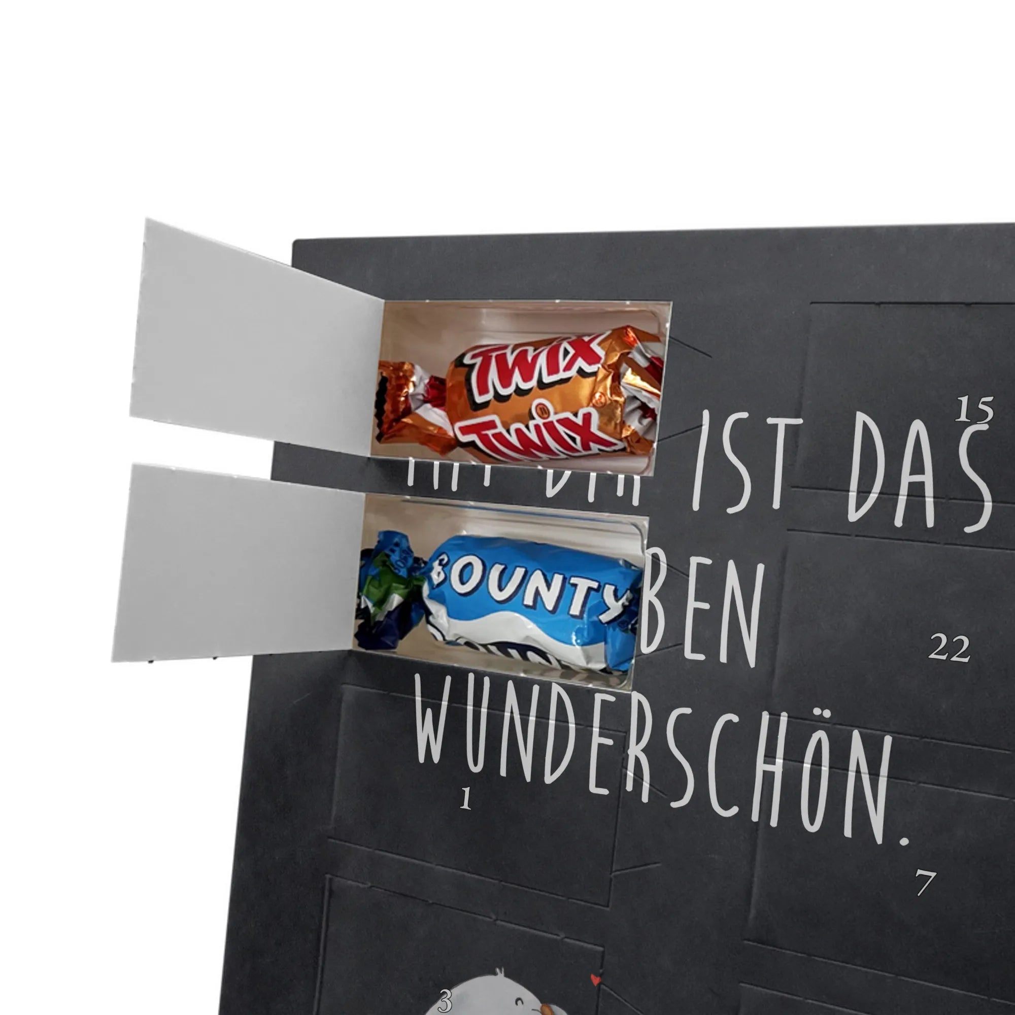 Charmanter Personalisierter Adventskalender mit Schoko-Foto von Mr. & Mrs. Panda – eine liebevolle Art, die Adventszeit zu personalisieren. Der Kalender ist mit den typischen Mr. & Mrs. Panda Motiven und herzlichen Sprüchen bedruckt; du kannst die Vorderseite mit deinem Lieblingsfoto gestalten. Achte auf eine hohe Auflösung deines Fotos, damit das Druckbild schön scharf wird, und kontrolliere den Bildausschnitt, damit keine wichtigen Details verloren gehen. Bitte lade nur Bilder hoch, für die du die Bildrechte besitzt oder eine Erlaubnis zur Nutzung vorliegt. Die Verarbeitung ist hochwertig: brillante Druckqualität, seidenmatte Oberflächenveredelung und bedruckte Seitenflächen für ein rundes Design. Maße: 325 mm x 225 mm x 27 mm. Der Kalender kann aufgehängt oder aufgestellt werden – ganz nach Belieben. Wichtig: Die Fotos werden nicht nachbearbeitet oder zugeschnitten; personalisierte Foto-Artikel sind vom Widerruf ausgenommen. Gefüllt ist der Adventskalender mit Celebrations Schokolade – 24 feine Füllungen in 8 verschiedenen Sorten (Maltesers, Mars, Snickers, Twix, Milky Way, Bounty, Galaxy, Galaxy Caramel). Ein persönliches Geschenk, das Erinnerungen und Genuss wunderbar verbindet.