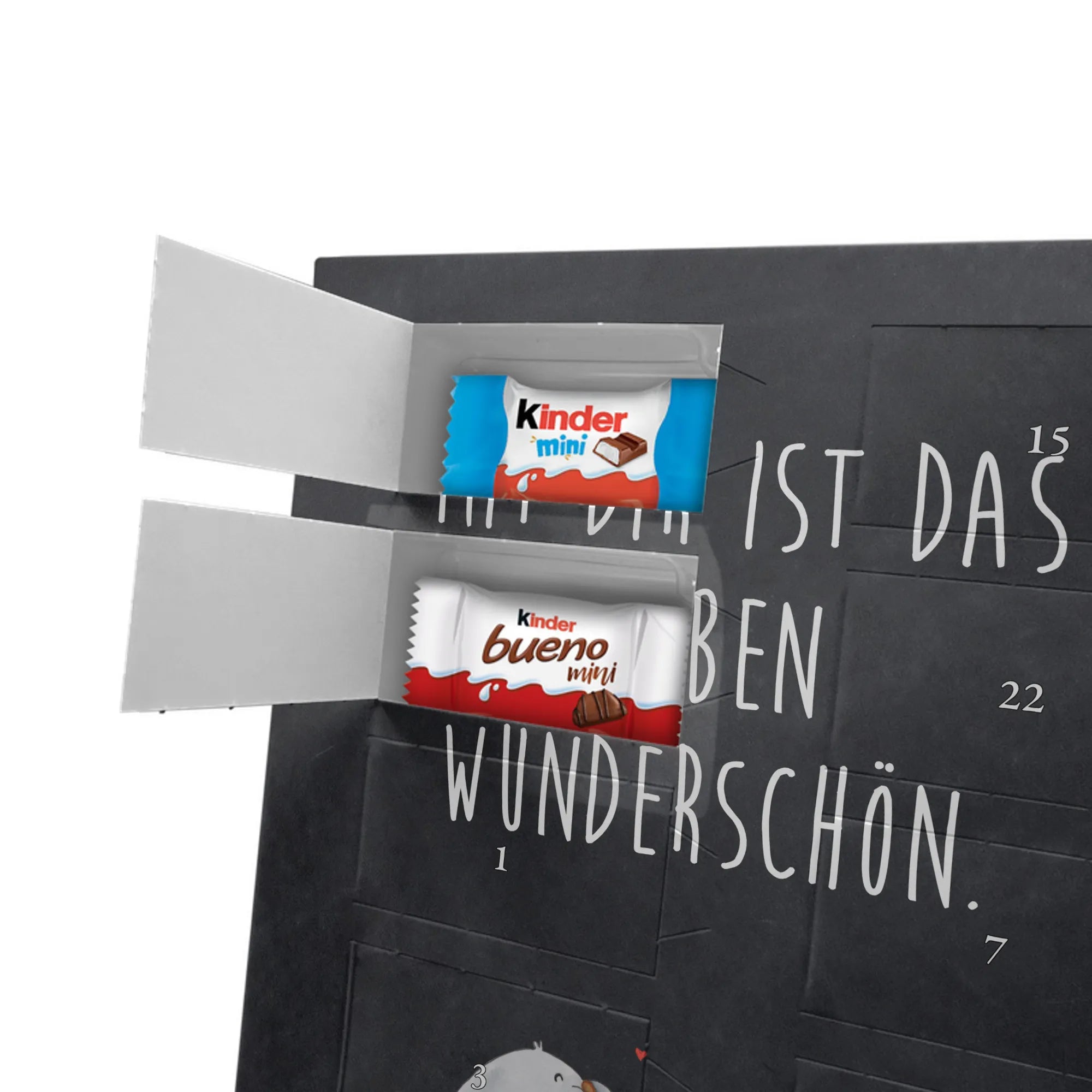 Personalisierter Schoko-Foto-Adventskalender von Mr. & Mrs. Panda – perfekt, wenn du ein einzigartiges, herzhaft-süßes Geschenk suchst. Du lädst ein Foto hoch, das wir auf der Vorderseite platzieren; der Rest des Kalenders ist mit unseren liebevollen Illustrationen und frechen Sprüchen gestaltet. Achte bitte darauf, dass das Bild eine hohe Auflösung hat und der Bildausschnitt passt, damit das Druckbild schön und scharf wird. Lade nur Fotos hoch, an denen du die Rechte besitzt oder für die du die Erlaubnis hast. Wichtig: Wir bearbeiten oder kürzen die Fotos nicht und personalisierte Artikel sind vom Rückgaberecht ausgeschlossen. Die hochwertige, seidenmatte Oberflächenveredelung sorgt für edle Optik, die bedruckten Seitenflächen geben dem Kalender eine liebevolle Note. Maße: 355 mm x 245 mm x 11 mm. Du kannst den Kalender aufstellen oder aufhängen – ganz wie du möchtest. Gefüllt ist er mit kinder® Schokolade: enthalten sind kinder® Schoko-Bons, kinder® Bueno mini und kinder® Schokolade mini. Wir empfehlen, vor dem Hochladen den Bildausschnitt am Bildschirm zu prüfen, damit Gesichter und wichtige Details nicht abgeschnitten werden. Dieser Adventskalender ist ideal für Paare, Familien und als persönliches Mitbringsel – mit ganz viel Mr. & Mrs. Panda Herz.