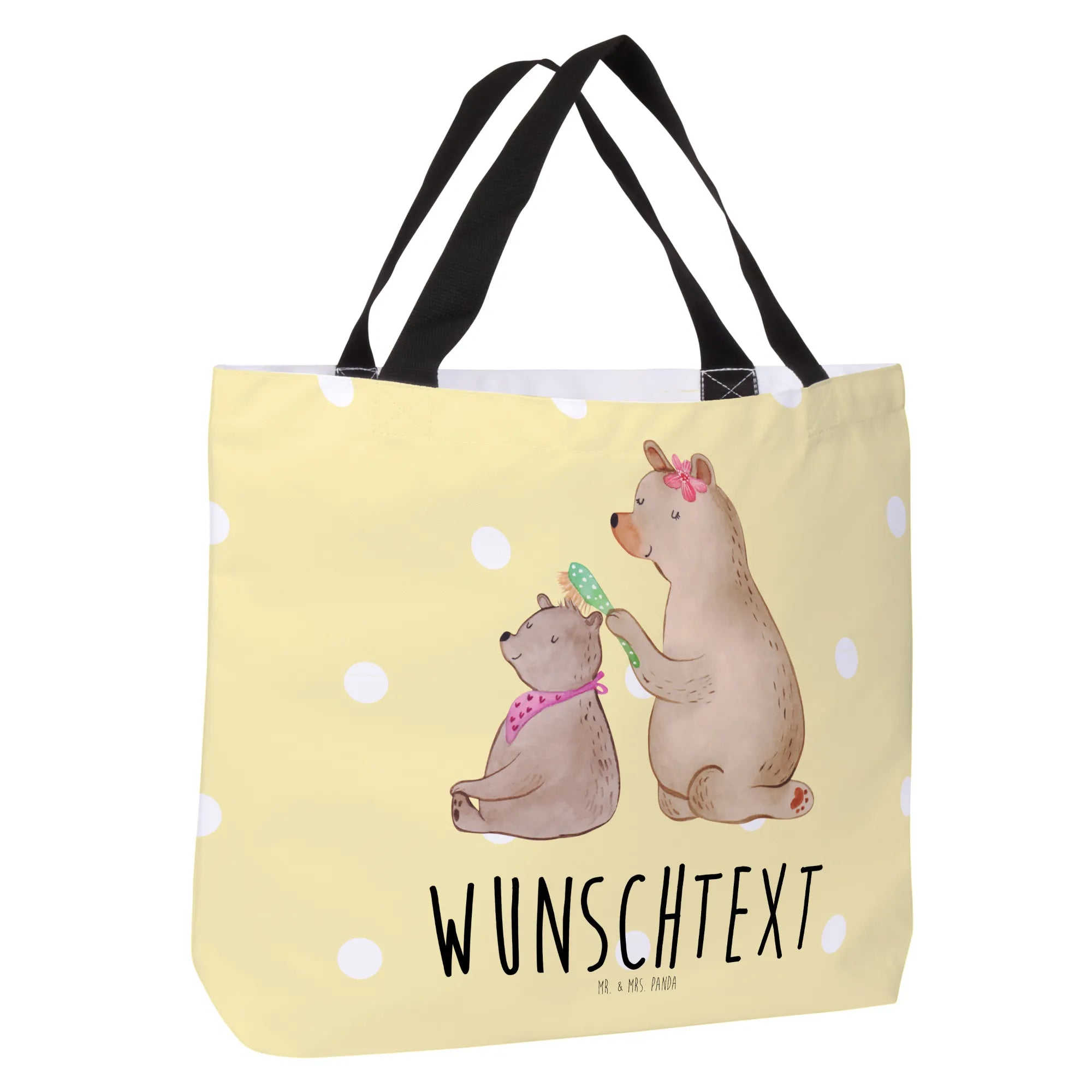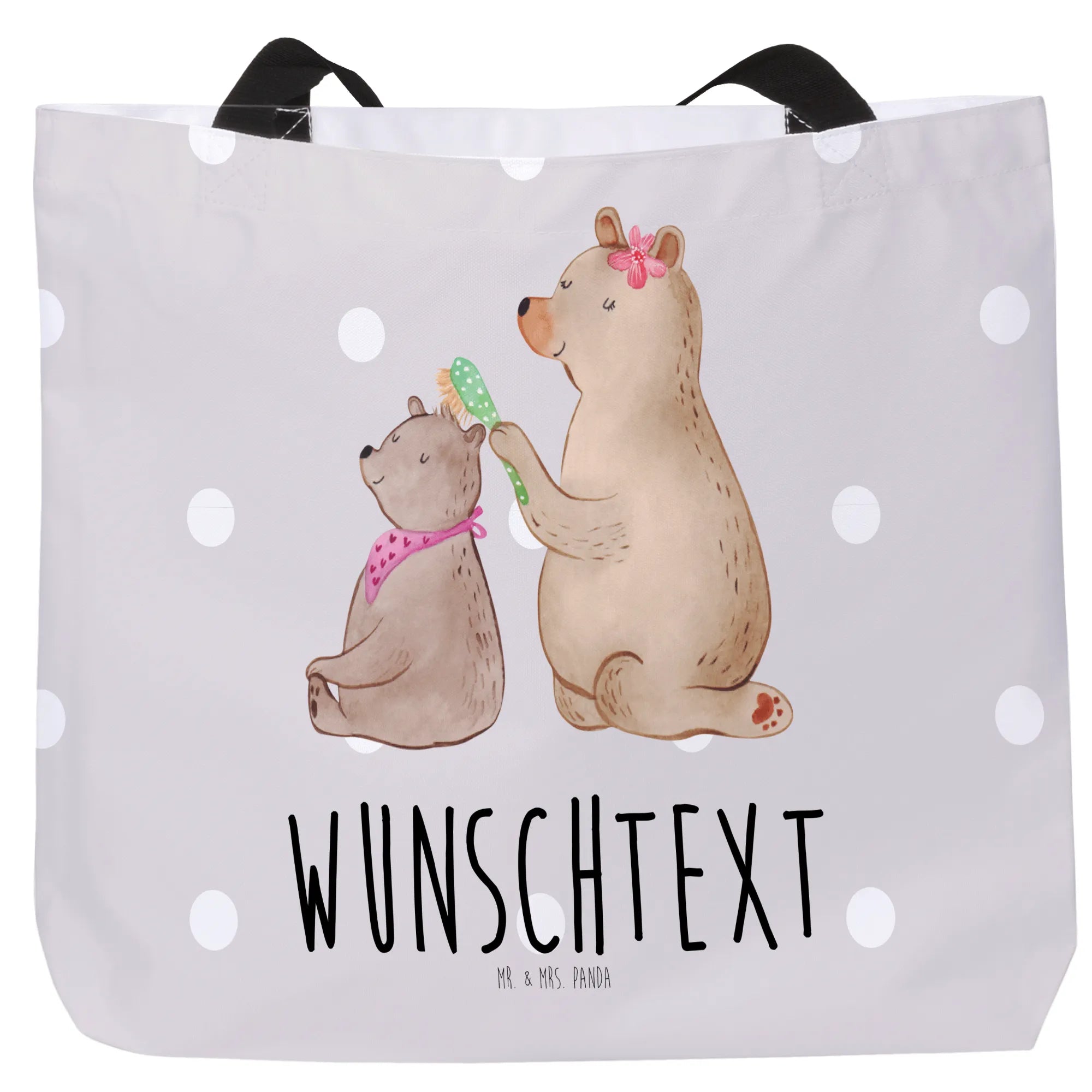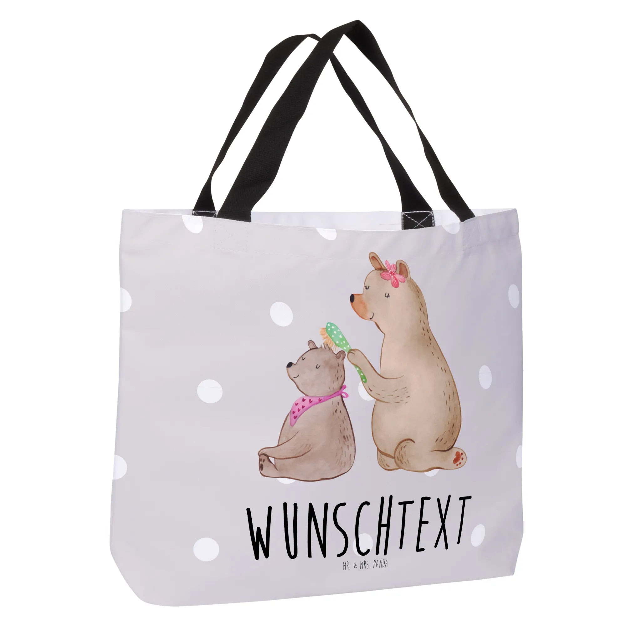 Der große Bär, der seinem kleinen Bärenkind die Haare bürstet, verkörpert die wundervolle Beziehung zwischen Mama und Kind. Das Motiv ist nicht nur niedlich, sondern auch von Herzen kommend. Du kannst den Shopper mit dem Namen deiner Wahl personalisieren, sodass er ein einmaliges Geschenk für deine Mama, Mutti oder die allerliebste Frau in deinem Leben ist.
