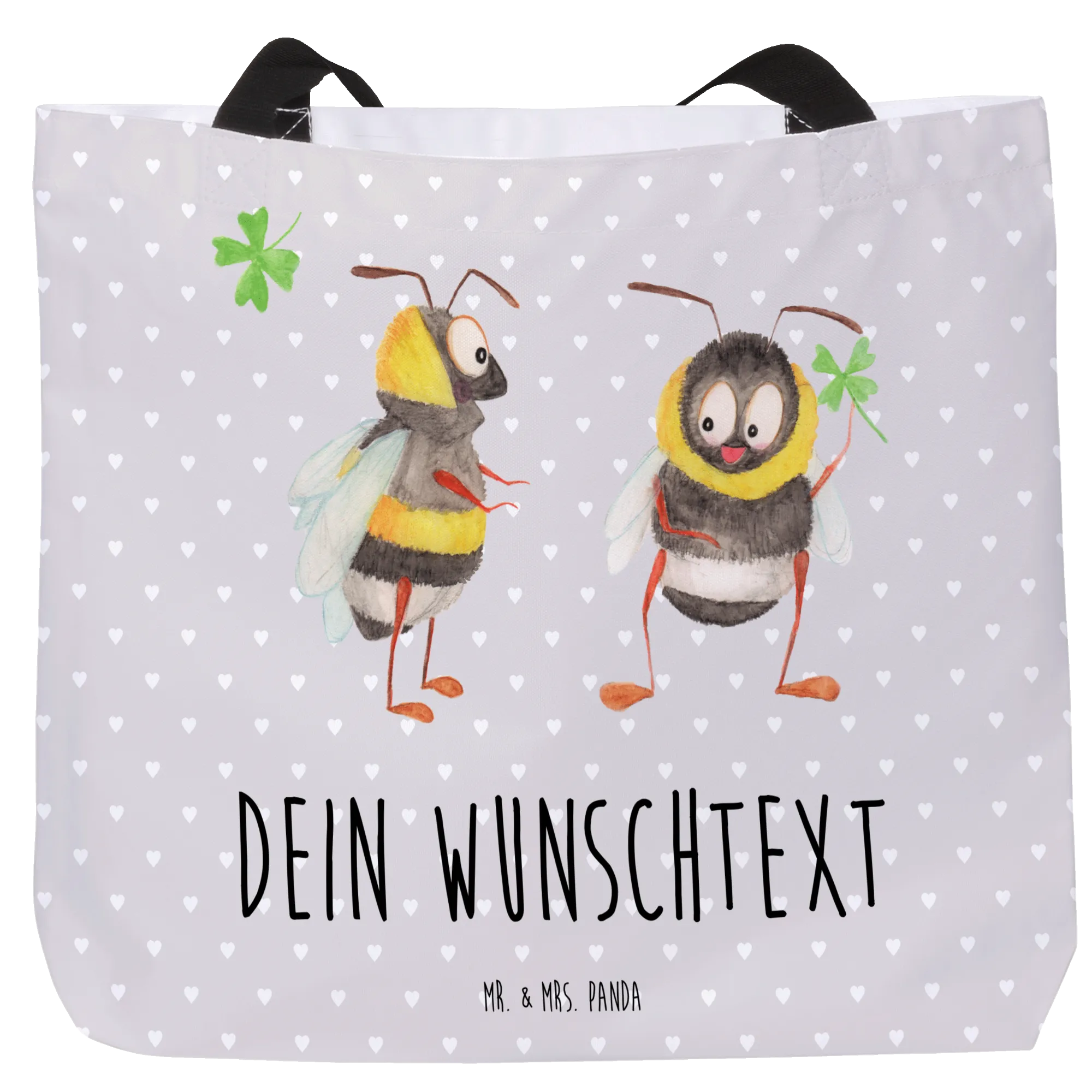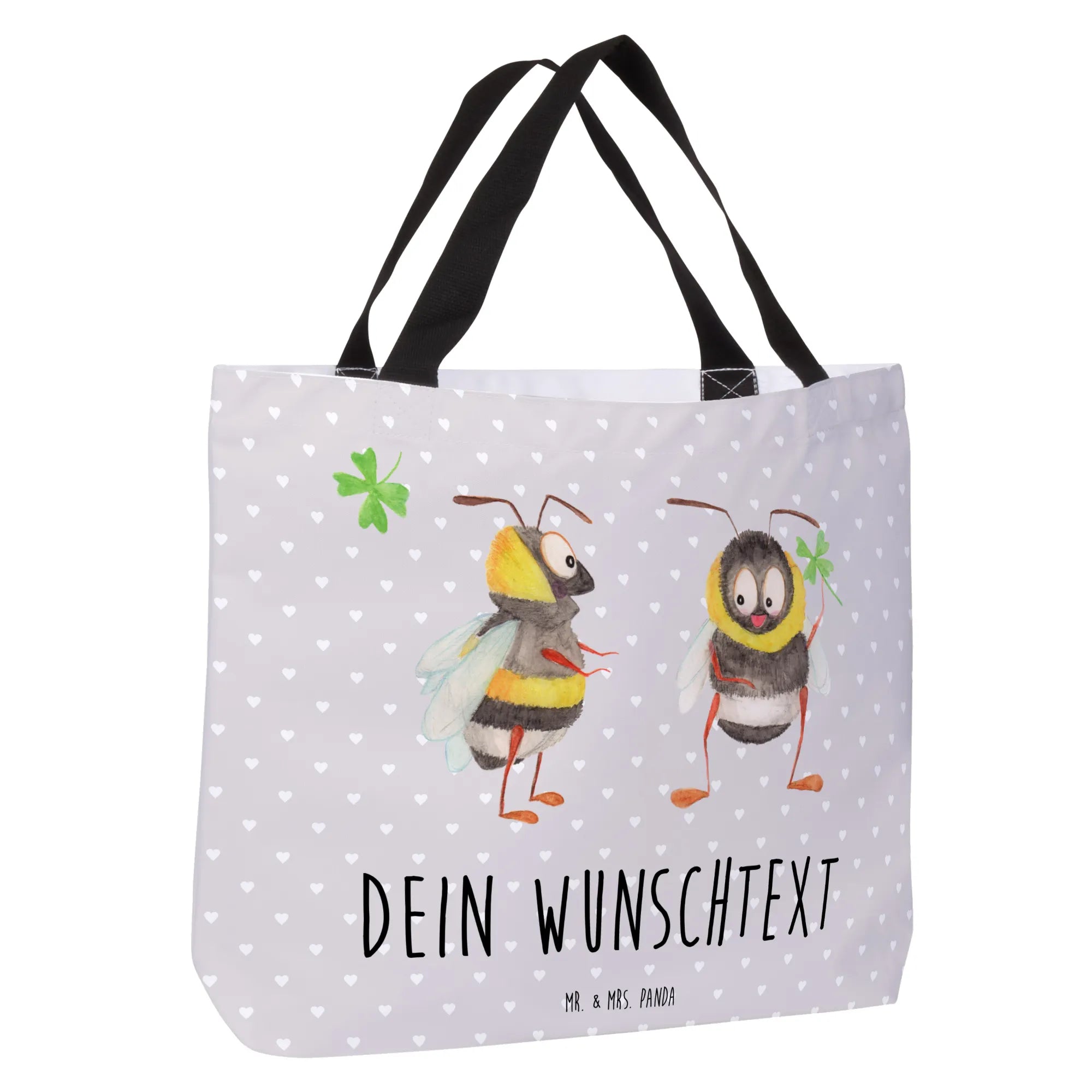 Der personalisierte Shopper im bezaubernden Design des Bienen Paares von Mr. & Mrs. Panda ist das perfekte Geschenk für all diejenigen, die Liebe und Freude im Alltag verbreiten möchten. Mit einem niedlichen Motiv, das zwei verliebte Bienen zeigt, die in einem verspielten Stil gezeichnet sind, strahlt dieser Shopper Wärme und Positivität aus. Die eine Biene hält ein vierblättriges Kleeblatt und bringt ein Lächeln auf jedes Gesicht, während die andere Biene mit ihren großen, ausdrucksvollen Augen einladen möchte.