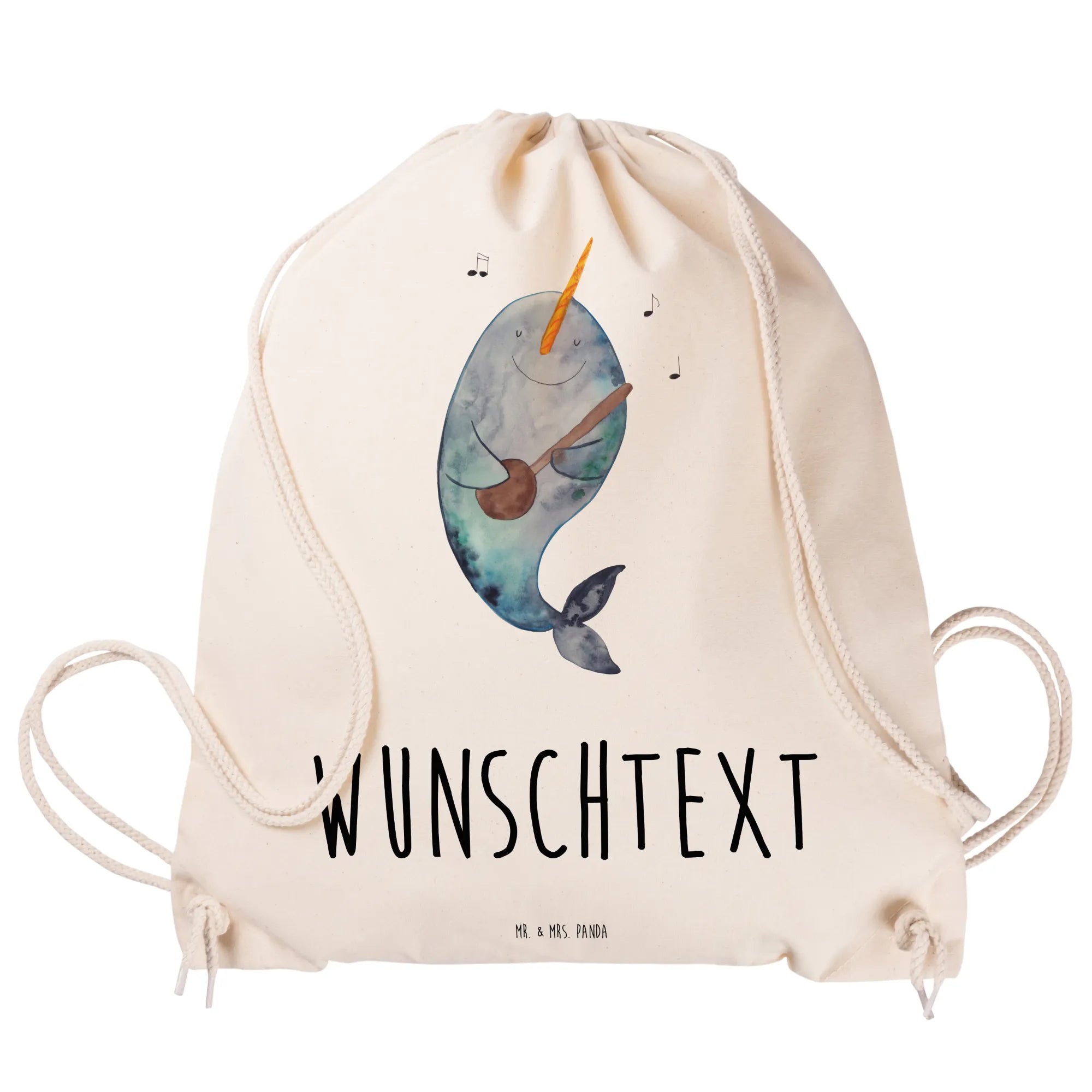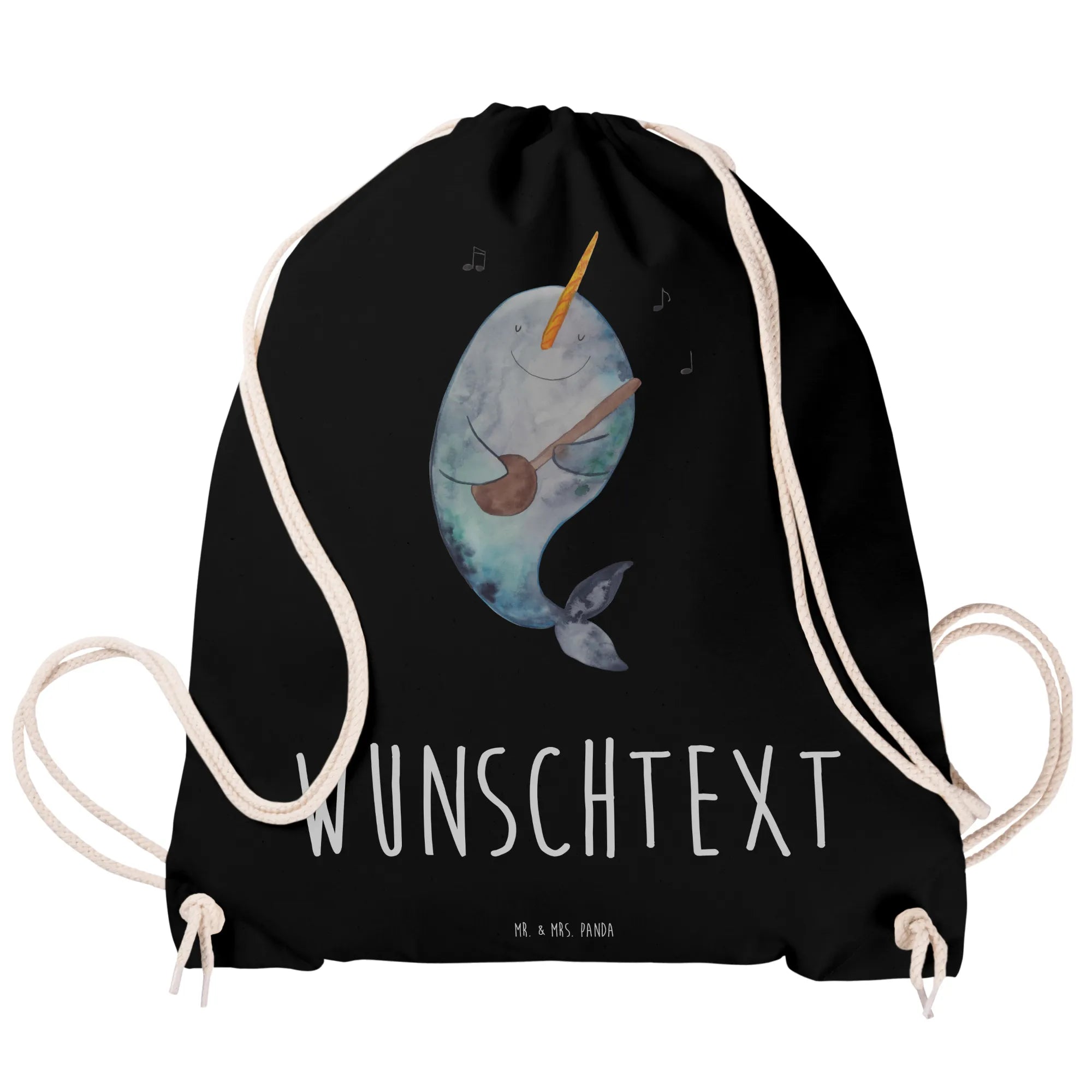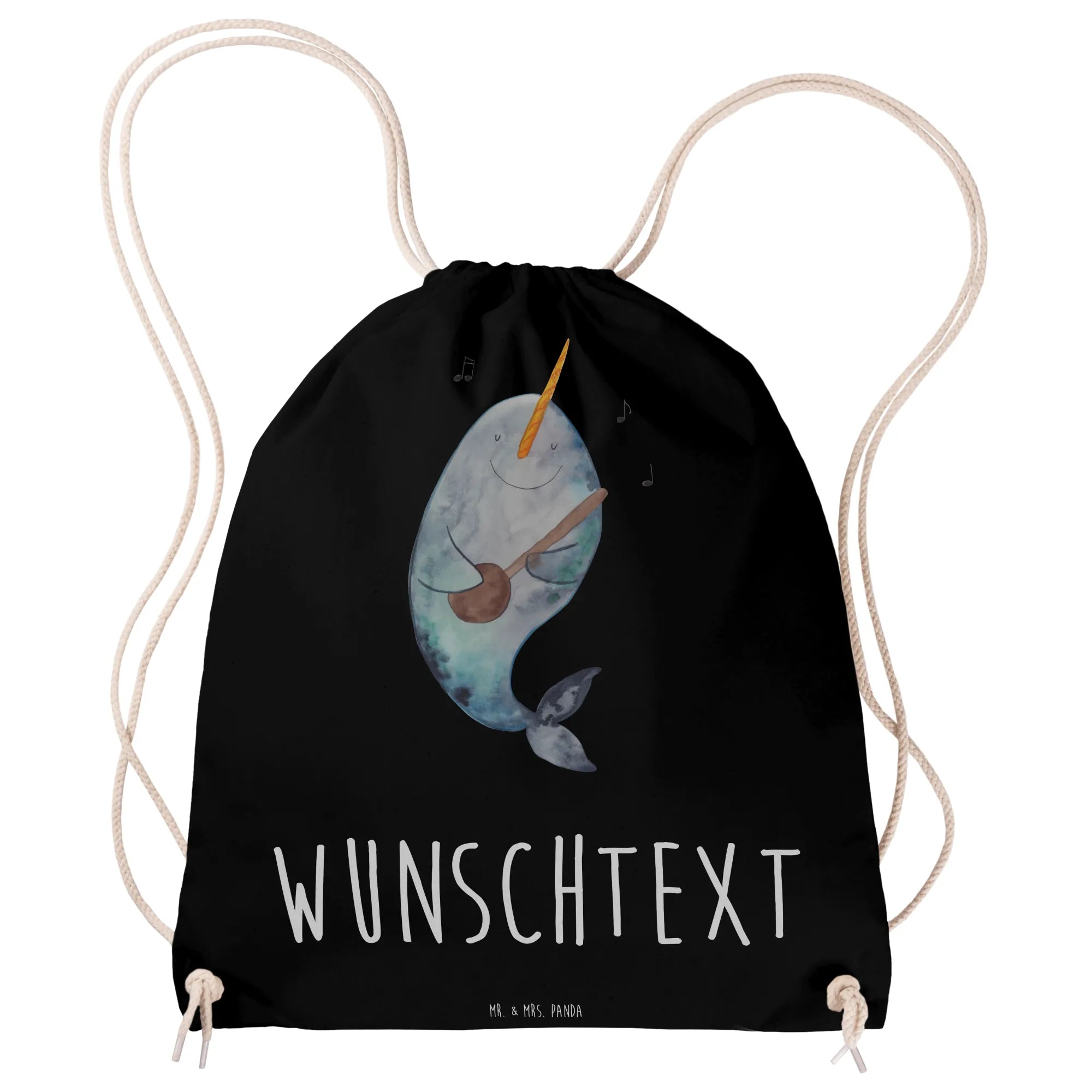 Der Narwal, spielend mit seiner Gitarre und umgeben von musikalischen Noten, bringt Freude in jeden Alltag. Ob für den Sport, für das Festival oder einfach als stylischer Begleiter im Alltag, dieser Beutel ist vielseitig einsetzbar.