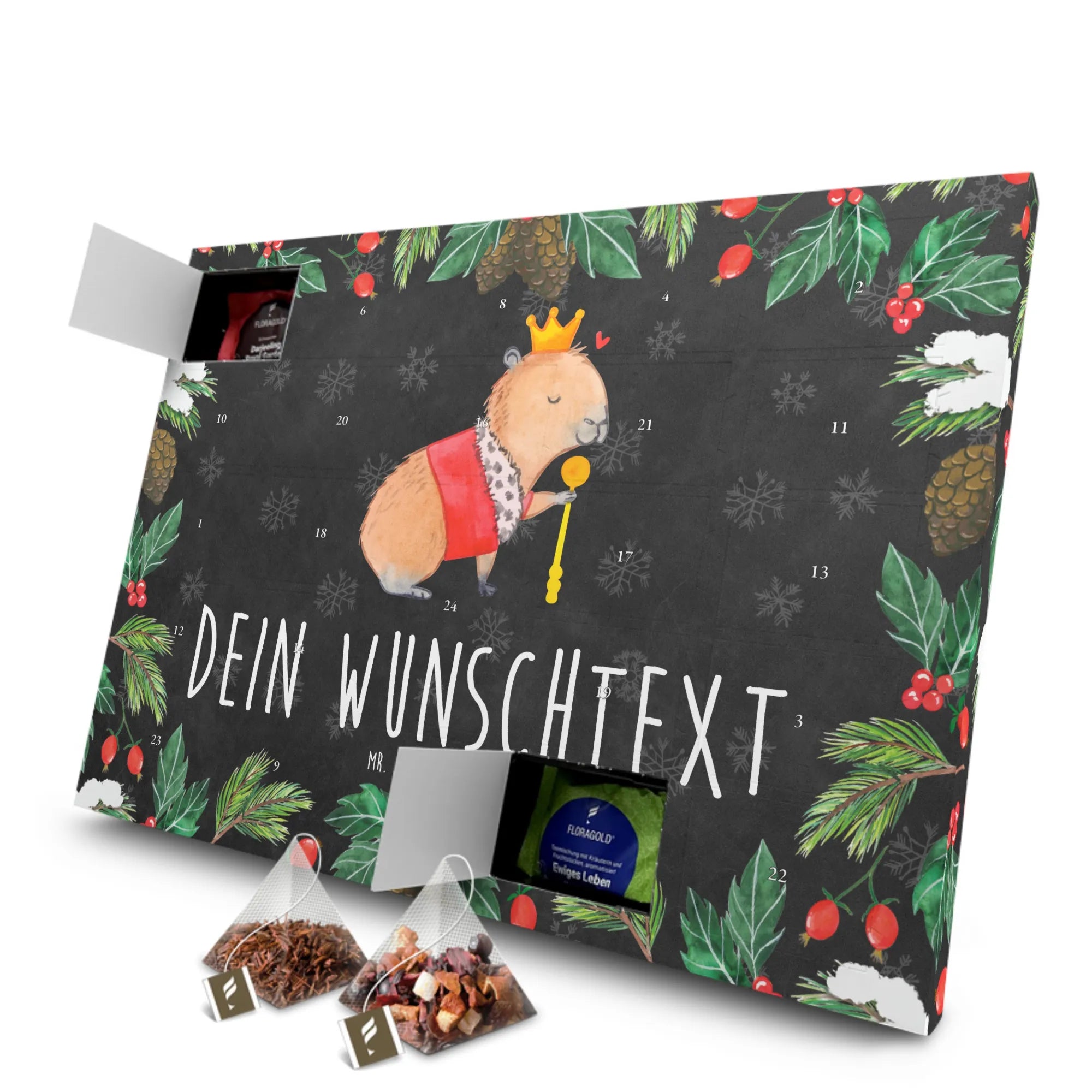 Mach dir selbst oder anderen eine Freude und hol dir diesen fantastischen personalisierten Tee Adventskalender "Capybara König" nach Hause – der perfekte Begleiter für die besinnliche Zeit des Jahres!