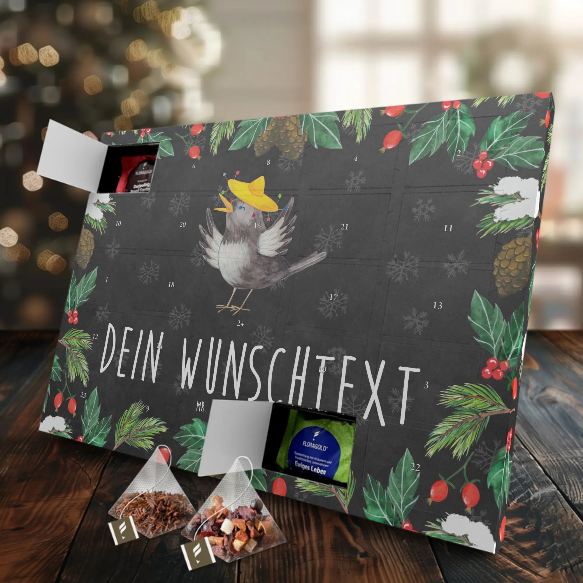 Entdecke den bezaubernden personalisierten Tee Adventskalender mit dem lustigen Raben mit Sombrero aus der kleinen Welt von Mr. & Mrs. Panda! Dieser einzigartige Kalender zaubert dir und deinen Liebsten ein Lächeln ins Gesicht. Welche bessere Möglichkeit gibt es, die besinnliche Weihnachtszeit zu genießen, als mit einer täglichen Tasse Tee und inspirierenden Sprüchen?
