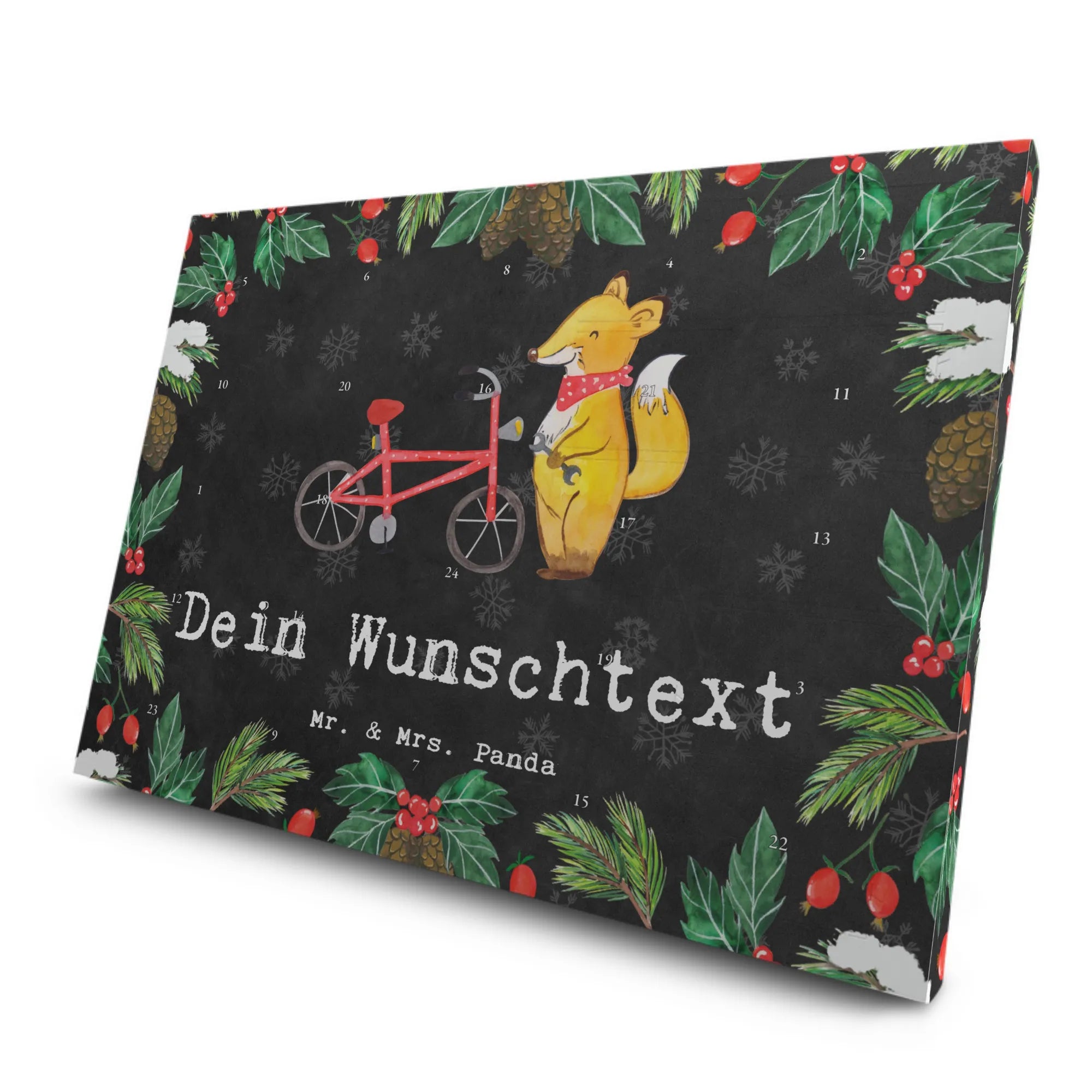 Der Kalender ist handgemacht und liebevoll mit einer süßen Illustration eines Fuchses mit Schraubenschlüssel bedruckt, der an einem Fahrrad arbeitet. Besonders bieten wir die Möglichkeit, den Kalender mit deinem eigenen Wunschtext zu personalisieren, was ihn zu einem noch besondereren Geschenk macht.