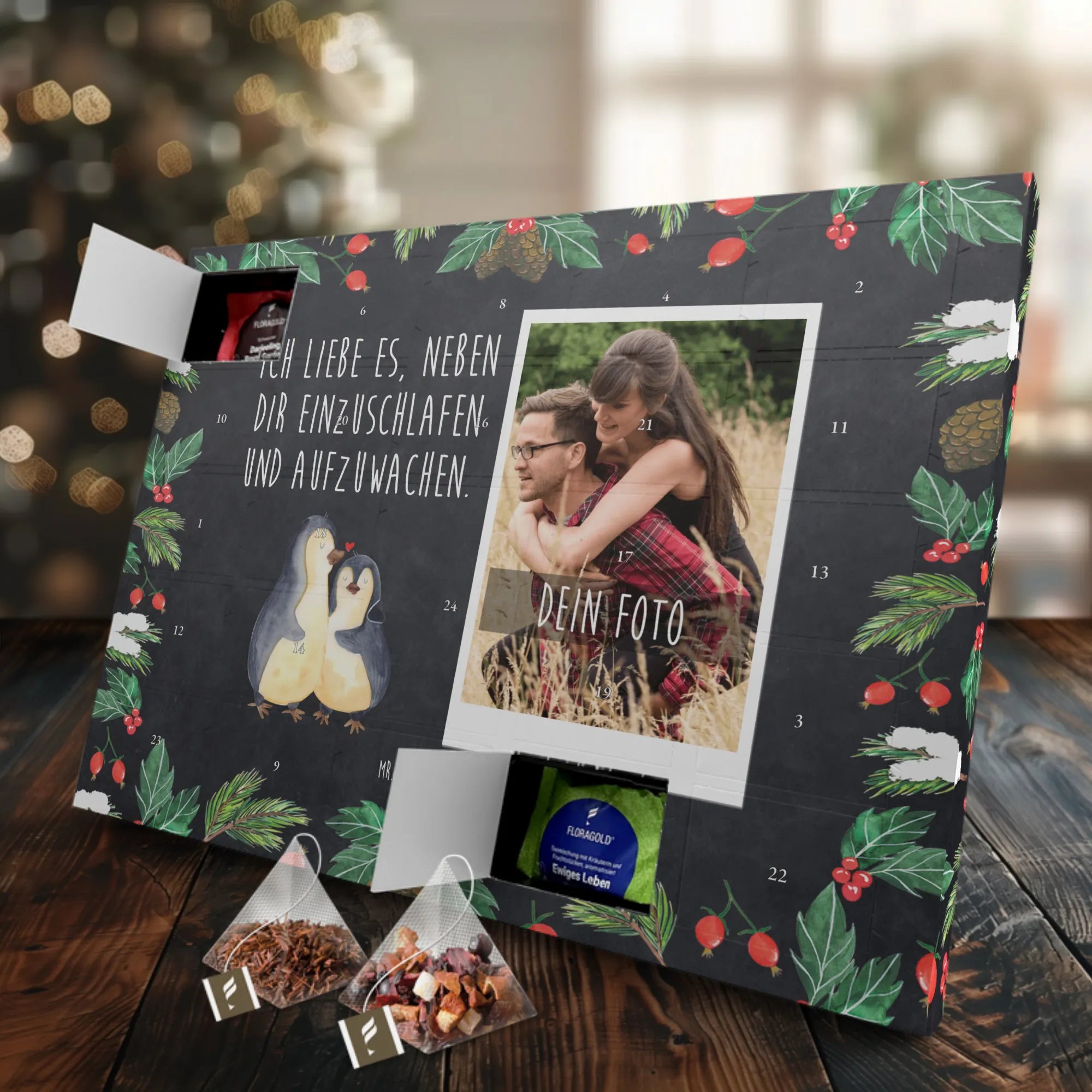 Entdecke den zauberhaften Personalisierter Tee Foto Adventskalender mit dem liebevollen Motiv "Pinguine Einschlafen" von Mr. & Mrs. Panda! Dieser Kalender ist das perfekte Geschenk für deine Liebsten – ob zum Valentinstag, Hochzeitstag oder als süßes Mitbringsel zur Verlobung.