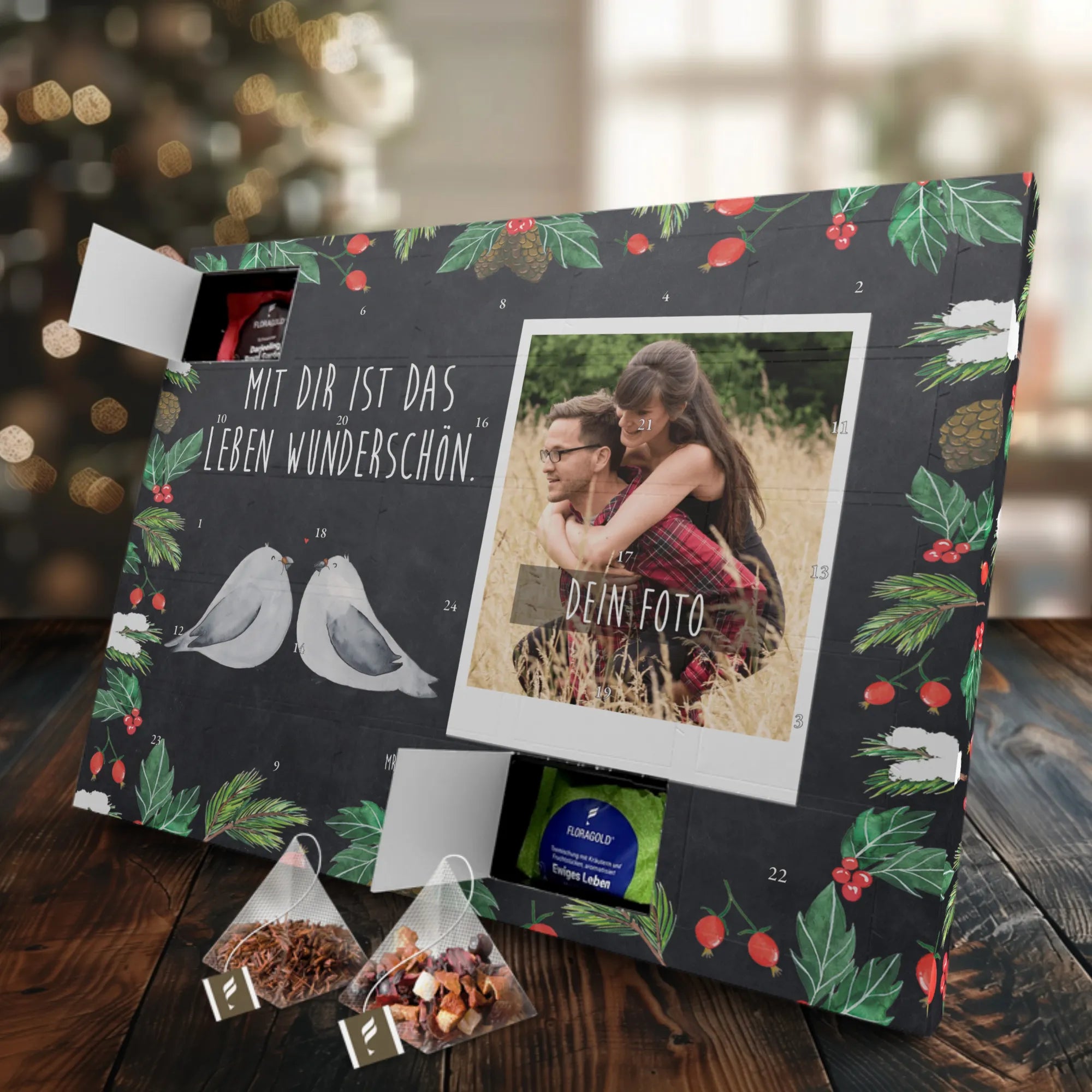 Der personalisierte Tee Foto Adventskalender von Mr. & Mrs. Panda ist das perfekte Geschenk für Verliebte und Paare, die ihre Liebe auf eine ganz besondere Art feiern möchten. Mit dem süßen Motiv der Turteltauben und dem liebevollen Spruch "Mit dir ist das Leben wunderschön" strahlt der Adventskalender pure Romantik und Zuneigung aus.