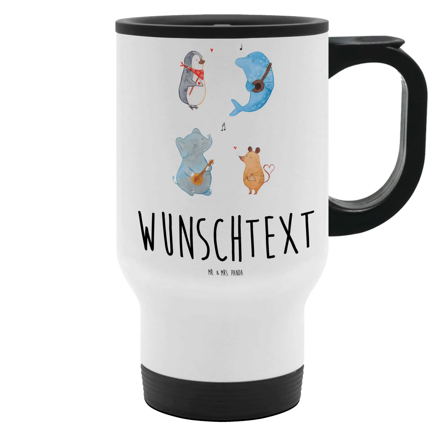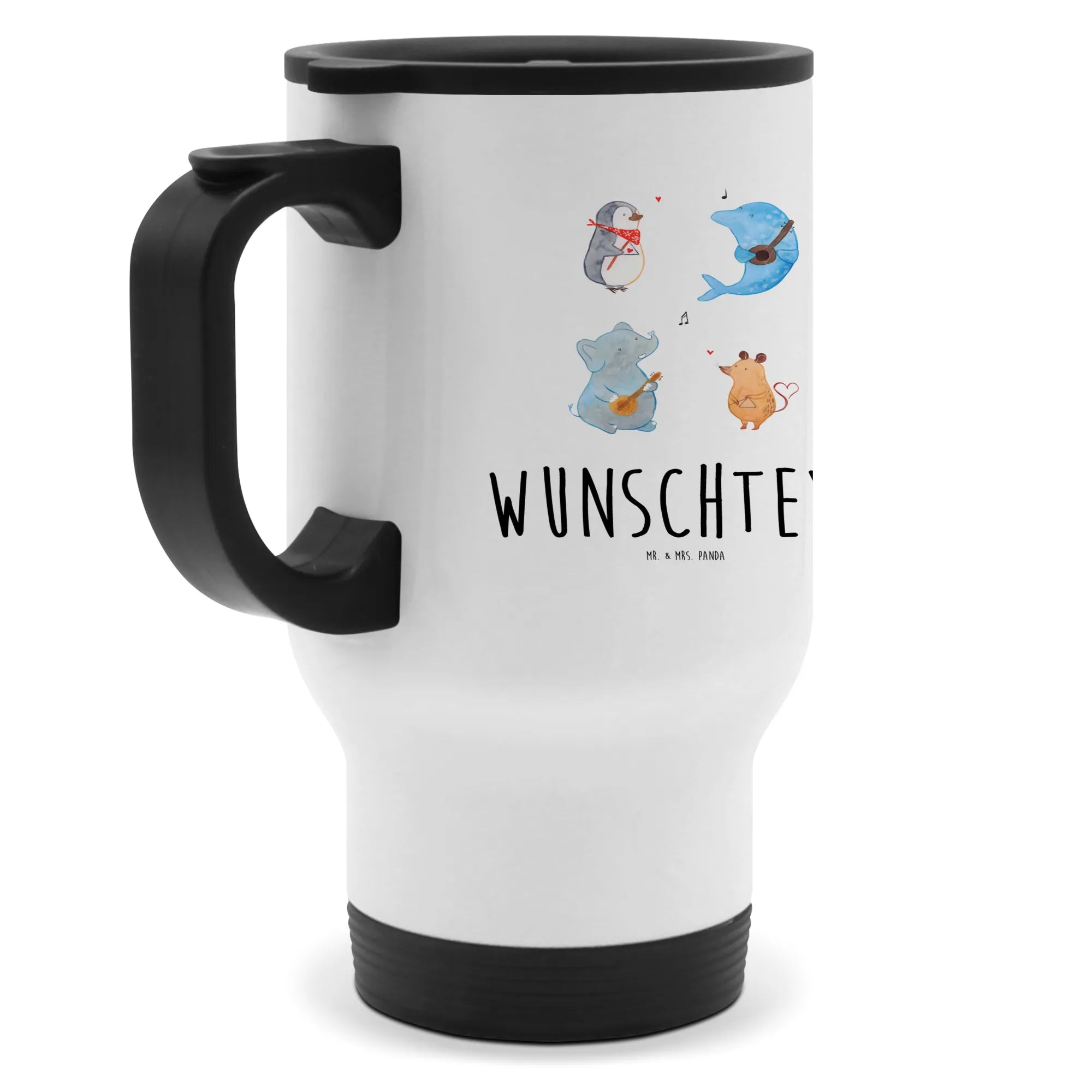 Dieser personalisierte Thermobecher mit dem bezaubernden Big Band Motiv aus der einzigartigen Small World Kollektion von Mr. & Mrs. Panda ist das perfekte Geschenk für Musikliebhaber und fröhliche Genießer.