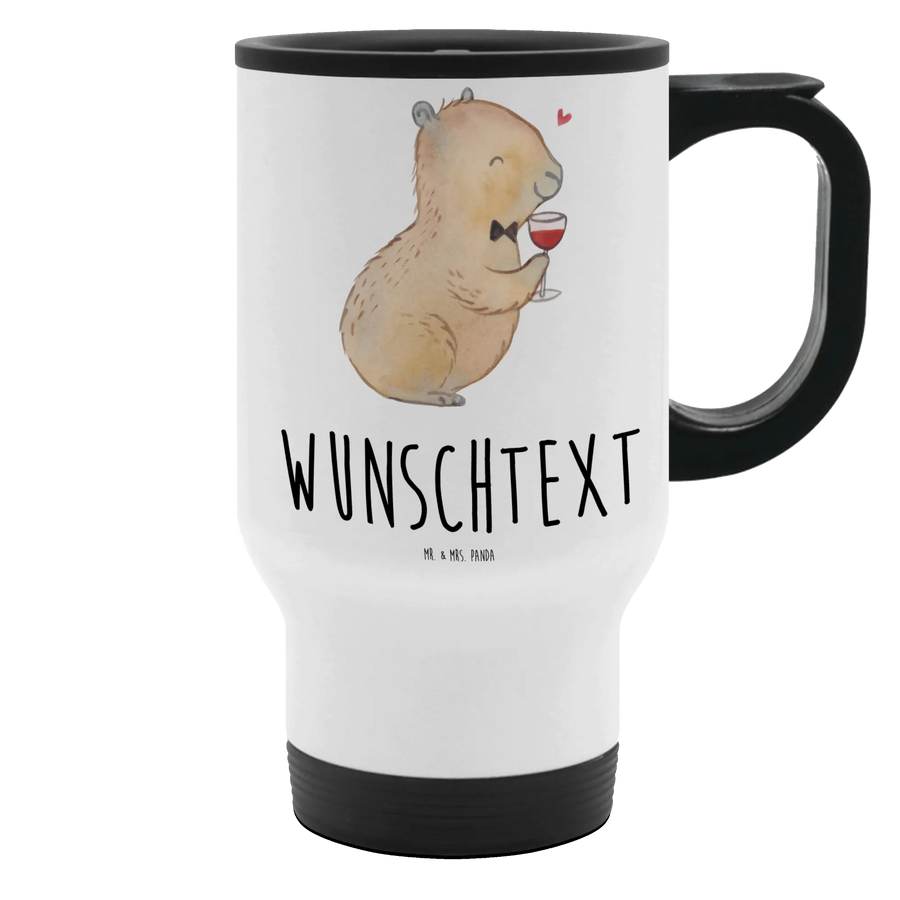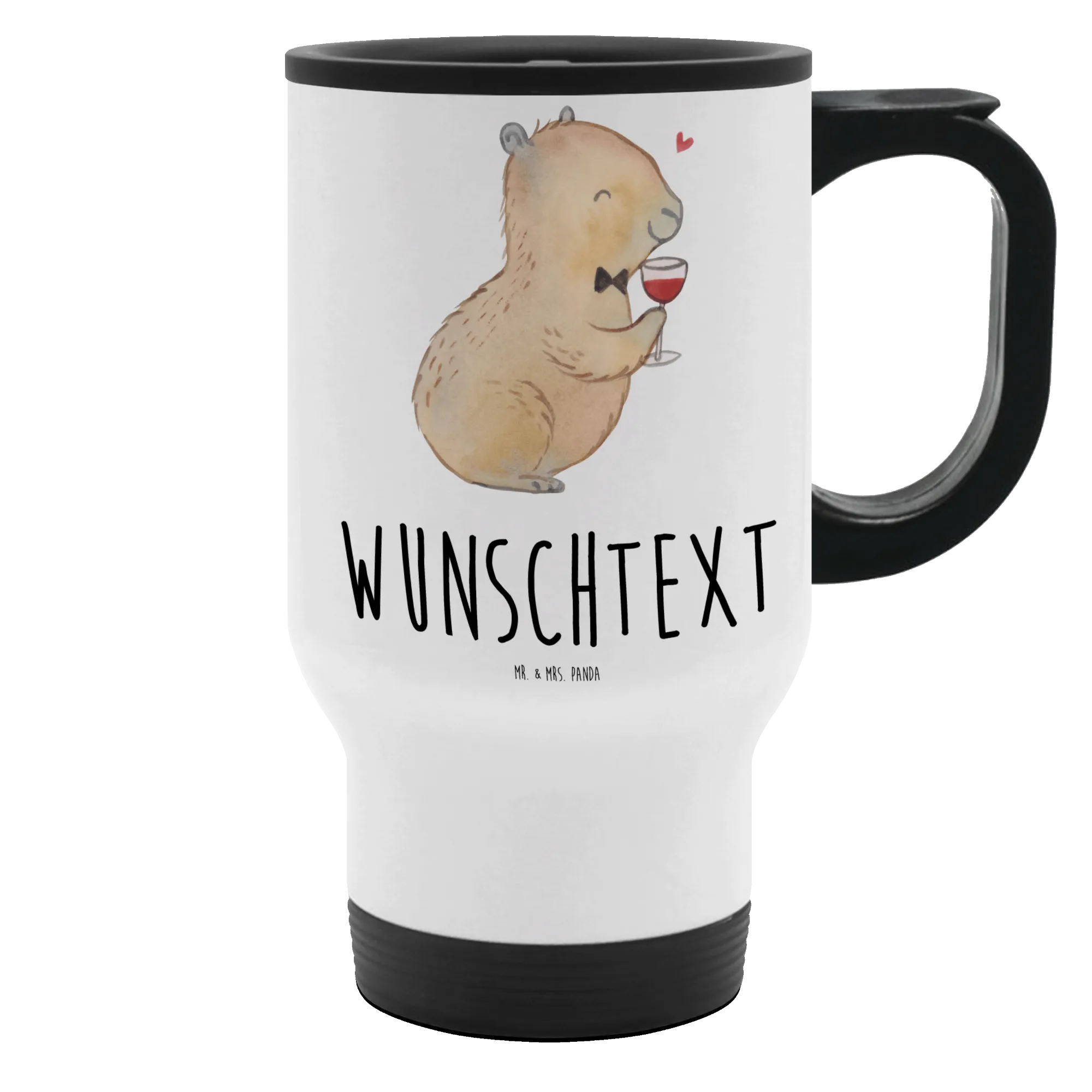 Entdecke den perfekten Begleiter für deine Kaffeepause: den personalisierten Thermobecher mit dem charmanten Capybara Wein Motiv aus der Small World Kollektion von Mr. & Mrs. Panda!