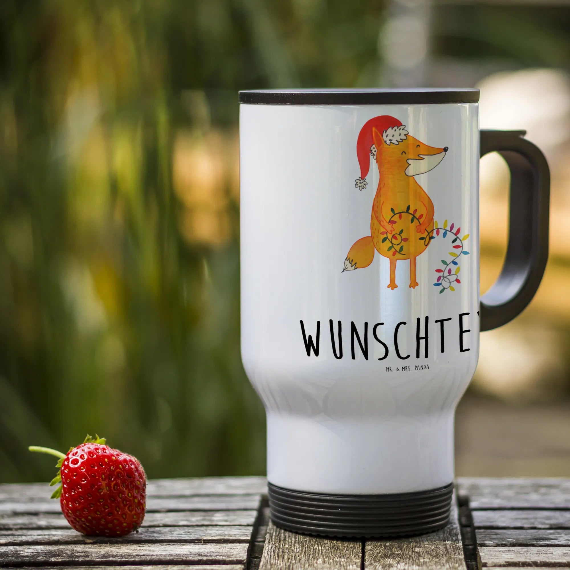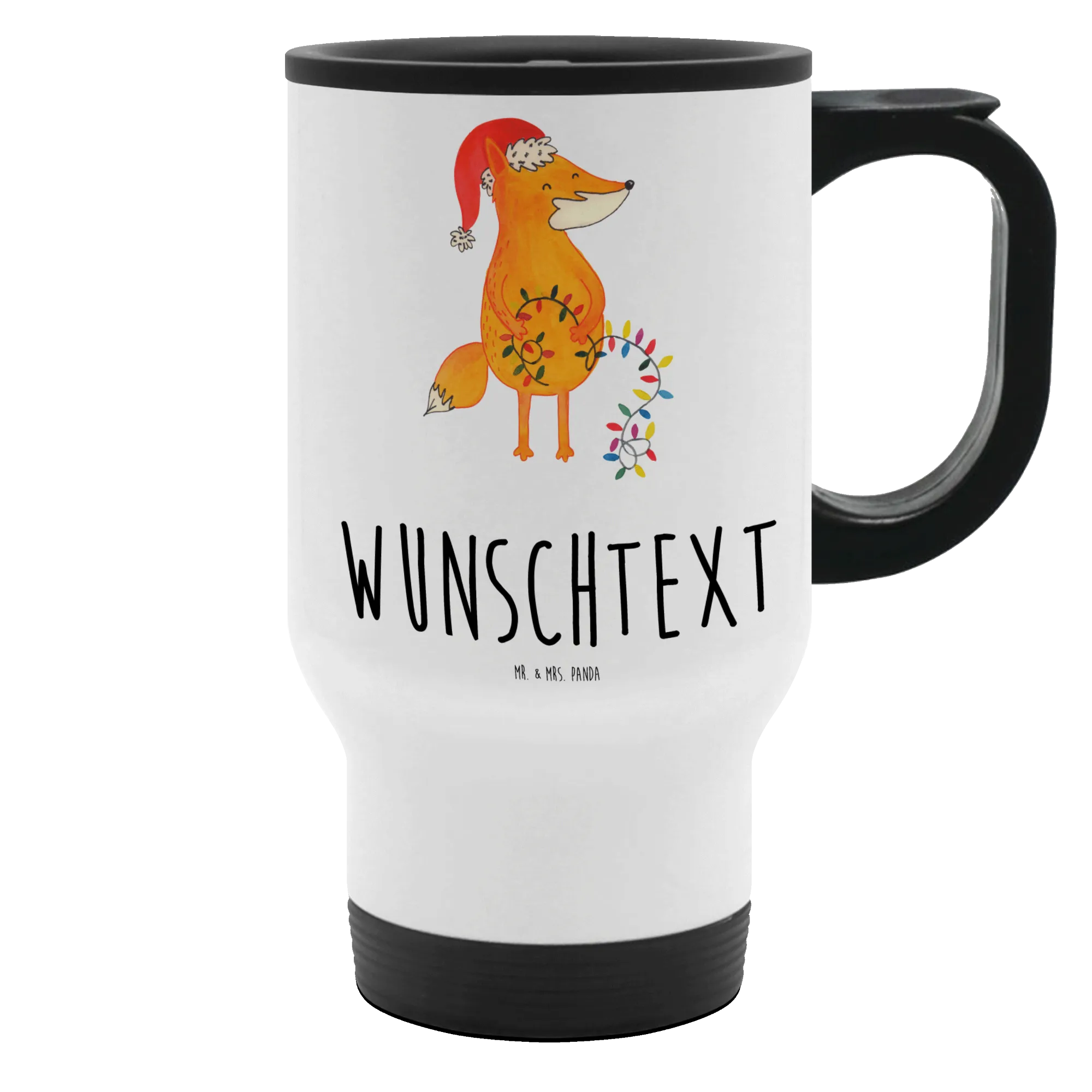 Entdecke unseren personalisierten Thermobecher "Fuchs Weihnachten" aus der Winter Kollektion von Mr. & Mrs. Panda! Dieser einzigartige Thermobecher ist nicht nur ein praktischer Begleiter für Deine heißen Getränke, sondern auch eine liebevolle Geschenkidee für die Weihnachtssaison. Mit einem warmen, orangefarbenen Fuchs, der festlich mit einer Weihnachtsmütze und Lichterketten geschmückt ist, bringt dieser Becher Freude in jeden Alltag.
