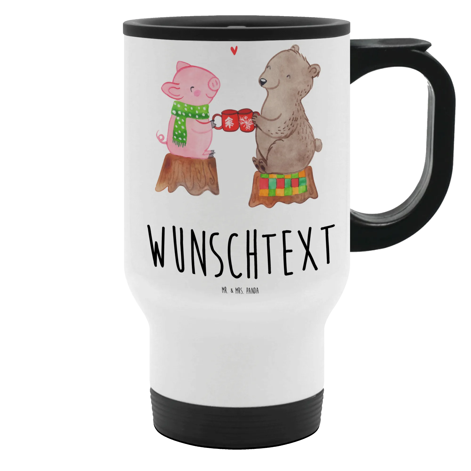 Das fröhliche Motiv zeigt ein niedliches Schweinchen, das einen Schal trägt und zusammen mit einem Bären auf einem Baumstumpf anstößt. Das herzliche "Prost" und "Alles Gute" bringen nicht nur in der Weihnachtszeit Freude, sondern das ganze Jahr über. Überrasche deine Liebsten mit einem personalisierten Thermobecher, der mit ihrem Wunschnamen oder Wunschtext versehen ist.