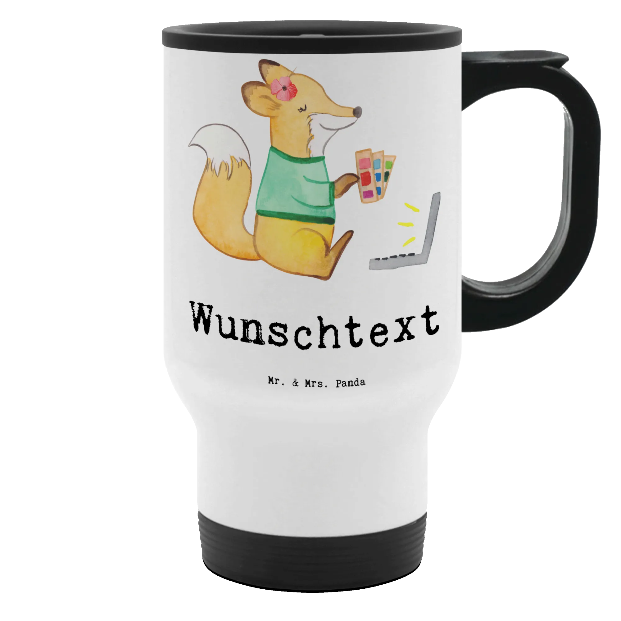 Wenn du auf der Suche nach dem perfekten Geschenk für eine kreative Grafikerin bist, dann ist dieser personalisierte Thermobecher von Mr. & Mrs. Panda genau das Richtige! Er kommt mit dem liebevollen Motiv "Grafikerin mit Herz", das nicht nur das Herz jeder Designerin höher schlagen lässt, sondern auch zeigt, wie stolz sie auf ihren Beruf ist. Mit dem witzigen Slogan "Du bist nur ein halber Mensch, wenn du keine Grafikerin bist" bist du auf der sicheren Seite – dieses besondere Stück wird bestimmt für Lächeln sorgen.
