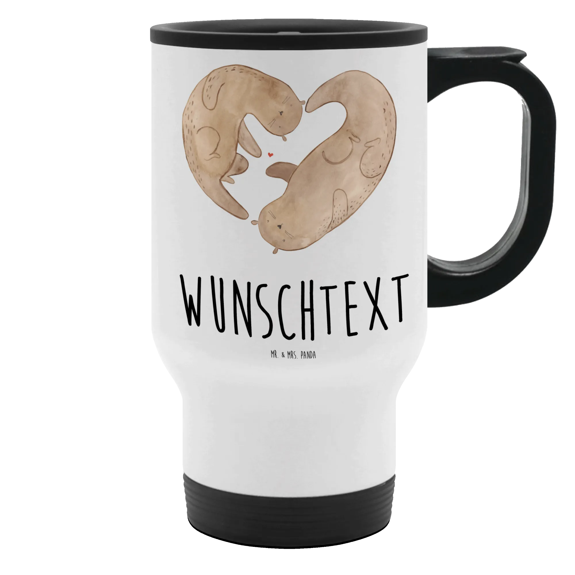 Dieser praktische und einzigartige Thermobecher ist nicht nur ein wunderbarer Begleiter für Kaffee, Tee oder heiße Schokolade, sondern wird auch individuell mit deinem Wunschnamen oder einem persönlichen Text gestaltet. Auf dem Becher sind zwei verspielte Otter abgebildet, die sich an den Pfoten halten und ein Herz bilden – perfekt für den Valentinstag oder euren Jahrestag!