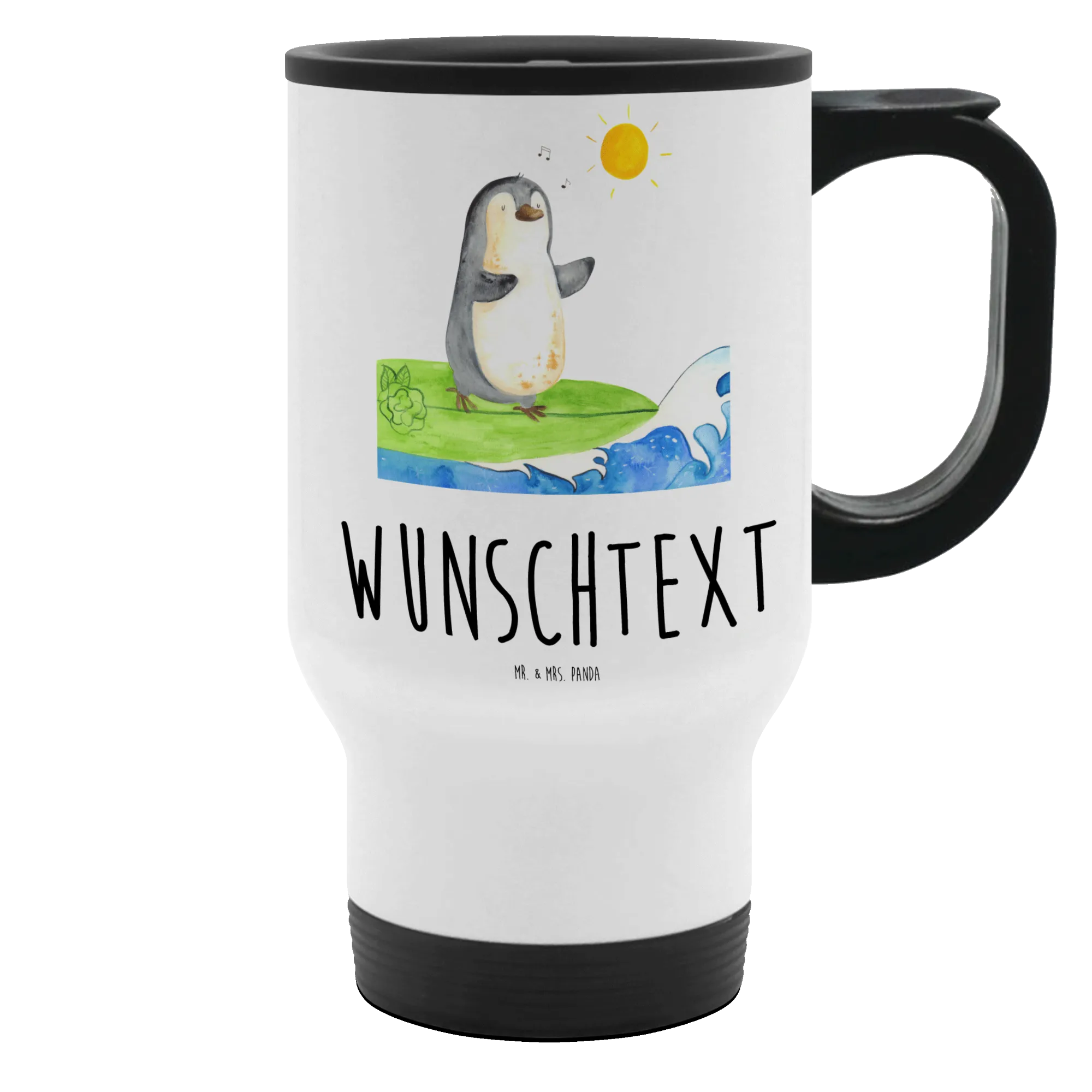 Entdecke den perfekten Begleiter für deinen Kaffee oder Tee mit unserem personalisierten Thermobecher Pinguin Surfer aus der Pinguin-Kollektion! Dieser praktische und einzigartige Thermobecher von Mr. & Mrs. Panda ist nicht nur wunderschön, sondern auch äußerst funktional.