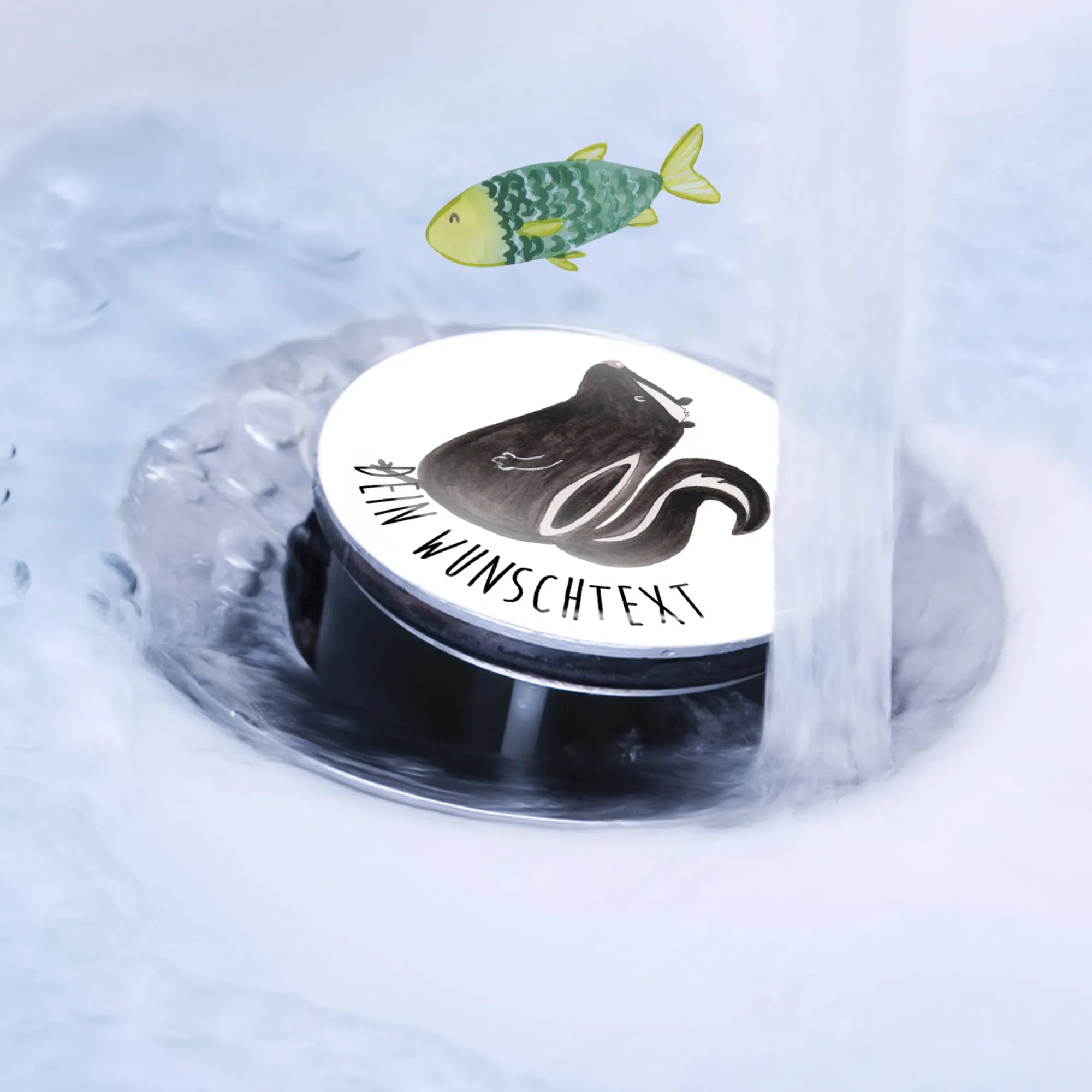 Der personalisierte Waschbeckenstöpsel mit dem süßen Motiv des sitzenden Stinktiers aus der Stinktier-Kollektion von Mr. & Mrs. Panda ist das perfekte Geschenk für alle, die ihren persönlichen Stil im Badezimmer unterstreichen möchten. 🦝