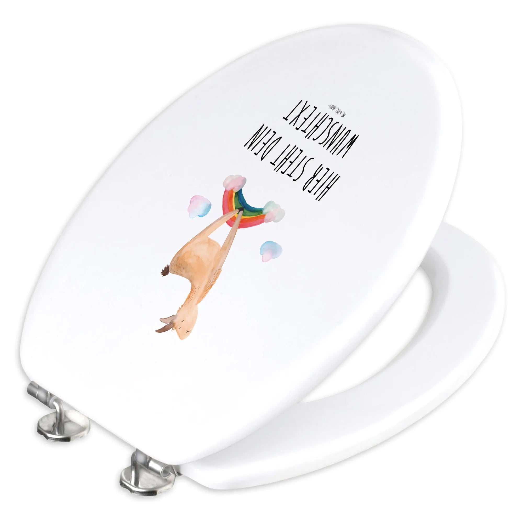 Du suchst nach einem ganz besonderen Geschenk, das Lebensfreude ins Badezimmer bringt? Dann ist unser personalisierter WC Sitz mit dem niedlichen Lama Regenbogen Motiv aus der Lama-Kollektion von Mr. & Mrs. Panda genau das Richtige für dich! Dieser wundervolle Toilettendeckel ist nicht nur ein echter Hingucker, sondern auch eine charmante Ergänzung für jede Toilette. Die fröhlichen Lamas hüpfen über einen bunten Regenbogen und zaubern dir jeden Tag ein Lächeln ins Gesicht. Ob für dich selbst oder als Geschenk für Freunde, Familie oder sogar für das neue Zuhause – dieser WC Sitz ist ein hervorragendes Überraschungsgeschenk für alle Lama-Fans!