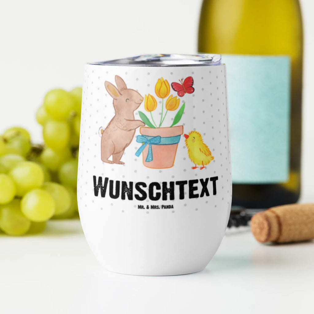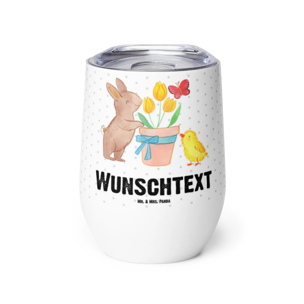 Das niedliche Motiv mit dem fröhlichen Hasen und dem kleinen Küken um die bunten Tulpen zaubert jedem ein Lächeln ins Gesicht und ist eine tolle Ergänzung für das Osterfrühstück oder gemütliche Abende mit Freunden. Ob für die Schwester, die beste Freundin oder sogar als Ostergeschenk für Kinder - dieser Weinbecher begeistert jeden!