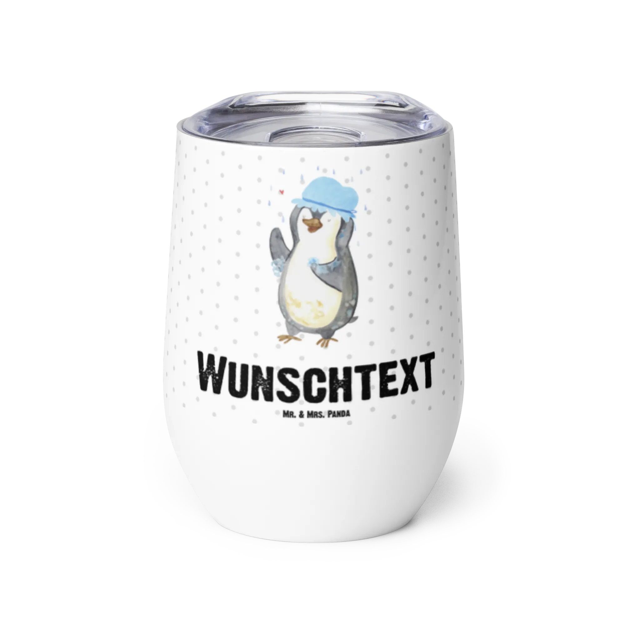 Der personalisierte Weinbecher mit dem bezaubernden Pinguin-Motiv ist das perfekte Geschenk für Pinguin-Fans und alle, die Lebensfreude und gute Laune verbreiten möchten. Mit seinem charmanten Design zeigt er einen fröhlichen Pinguin, der unter der Dusche steht, und bringt nicht nur Kinderaugen zum Leuchten, sondern sorgt auch bei Erwachsenen für ein Lächeln. Das witzige Motiv und der Spruch 'Starte den Tag singend unter der Dusche und beende ihn, indem du durch’s Wohnzimmer tanzt.' machen diesen Weinbecher zu einem echten Highlight.