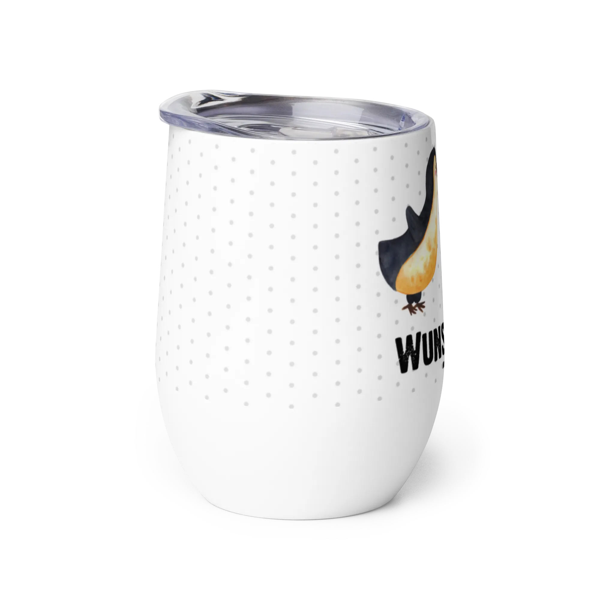 Sichere dir den schönsten Weinbecher von Mr. & Mrs. Panda! Dieser personalisierte Weinbecher hat ein Fassungsvermögen von 375 ml und misst 120 mm in der Höhe. Egal, ob beim Grillen oder im Park – die doppelwandige Vakuumdichtung sorgt dafür, dass dein Wein bis zu 5 Stunden lang perfekt temperiert bleibt. Der hochwertige Edelstahl sorgt dafür, dass dein Becher langlebig ist und die fantasievollen Designs und Sprüche von Mr. & Mrs. Panda den Becher lebendig machen. Du kannst ihn mit deinem gewünschten Text oder Namen personalisieren, wodurch er perfekt für persönliche Geschenke ist. Bitte beachte: nur Handwäsche!
