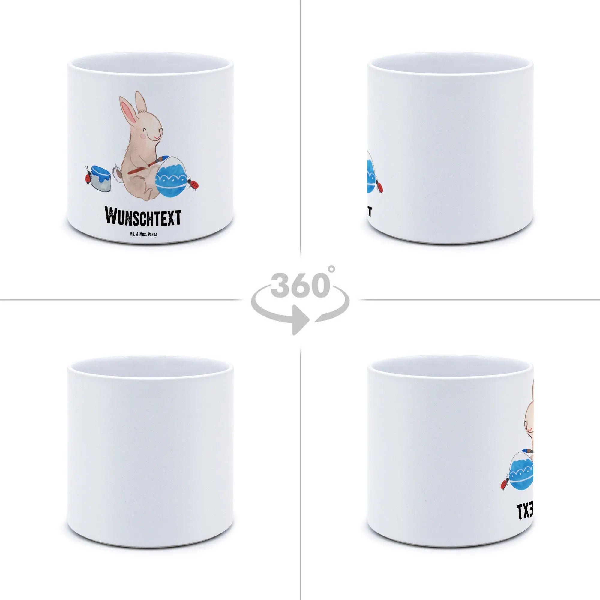 Der personalisierte XL Blumentopf Hase Marienkäfer von Mr. & Mrs. Panda ist das perfekte Geschenk für Ostern! Mit seinem bezaubernden Motiv eines kleinen Hasen, der fröhlich ein Osterei bemalt, bringt er das Osterfest direkt in dein Zuhause. Die niedlichen Marienkäfer unterstützen den Hasen, während er seine Kunstwerke kreiert.