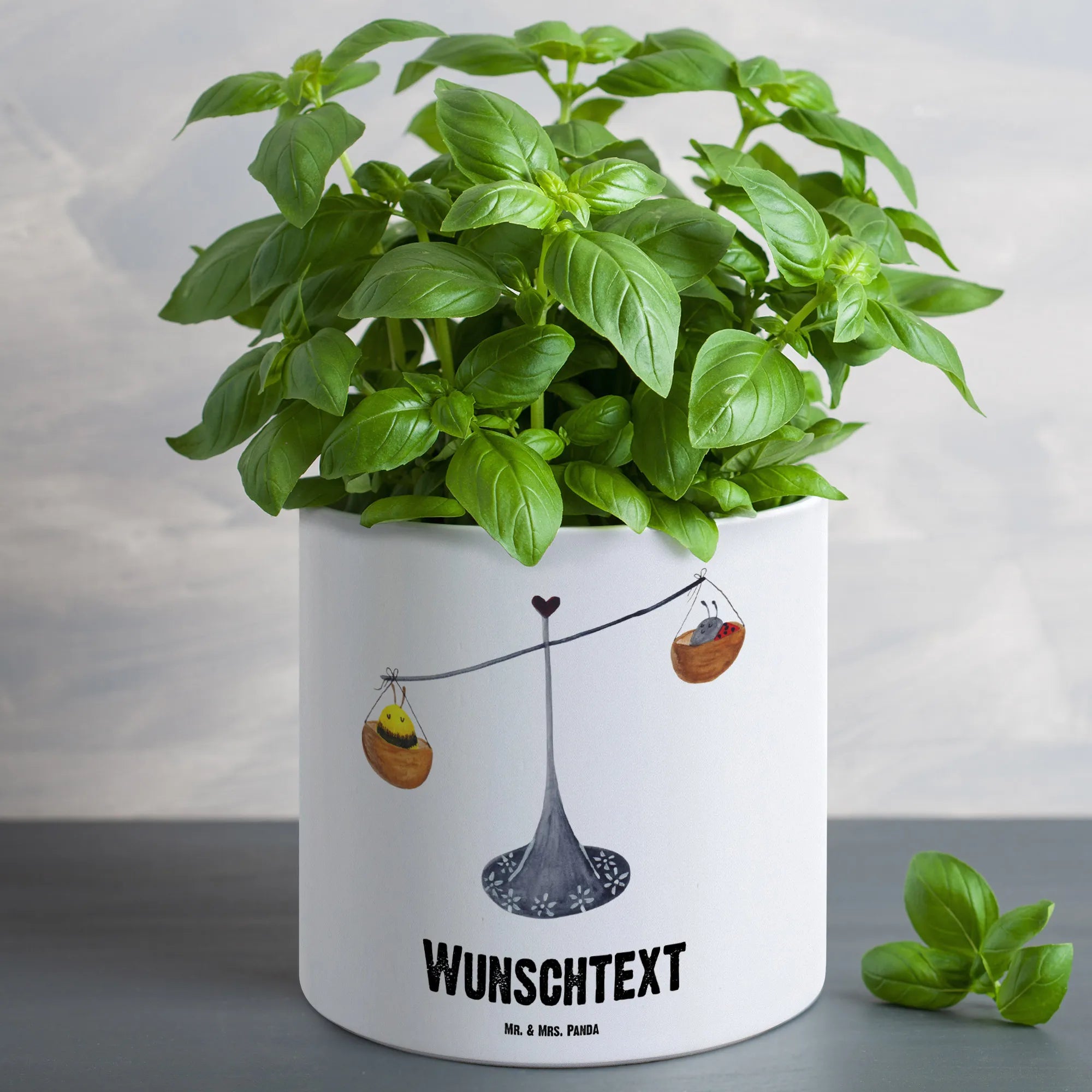 Der personalisierte XL Blumentopf mit dem zauberhaften Motiv 'Sternzeichen Waage' von Mr. & Mrs. Panda ist nicht nur ein wunderschönes Deko-Element, sondern auch das perfekte Geschenk für alle, die das Zeichen der Waage in ihrem Leben feiern möchten. Mit einem Durchmesser von 142 mm und einer Höhe von 135 mm bietet dieser elegante Keramiktopf genügend Platz für deine liebsten Pflanzen, sei es ein wunderschöner Blütenstrauß oder duftende Kräuter. Die edle Keramikoberfläche sorgt dafür, dass der Topf sowohl drinnen als auch draußen zum Blickfang wird und das Herz von Pflanzenliebhabern höher schlagen lässt!