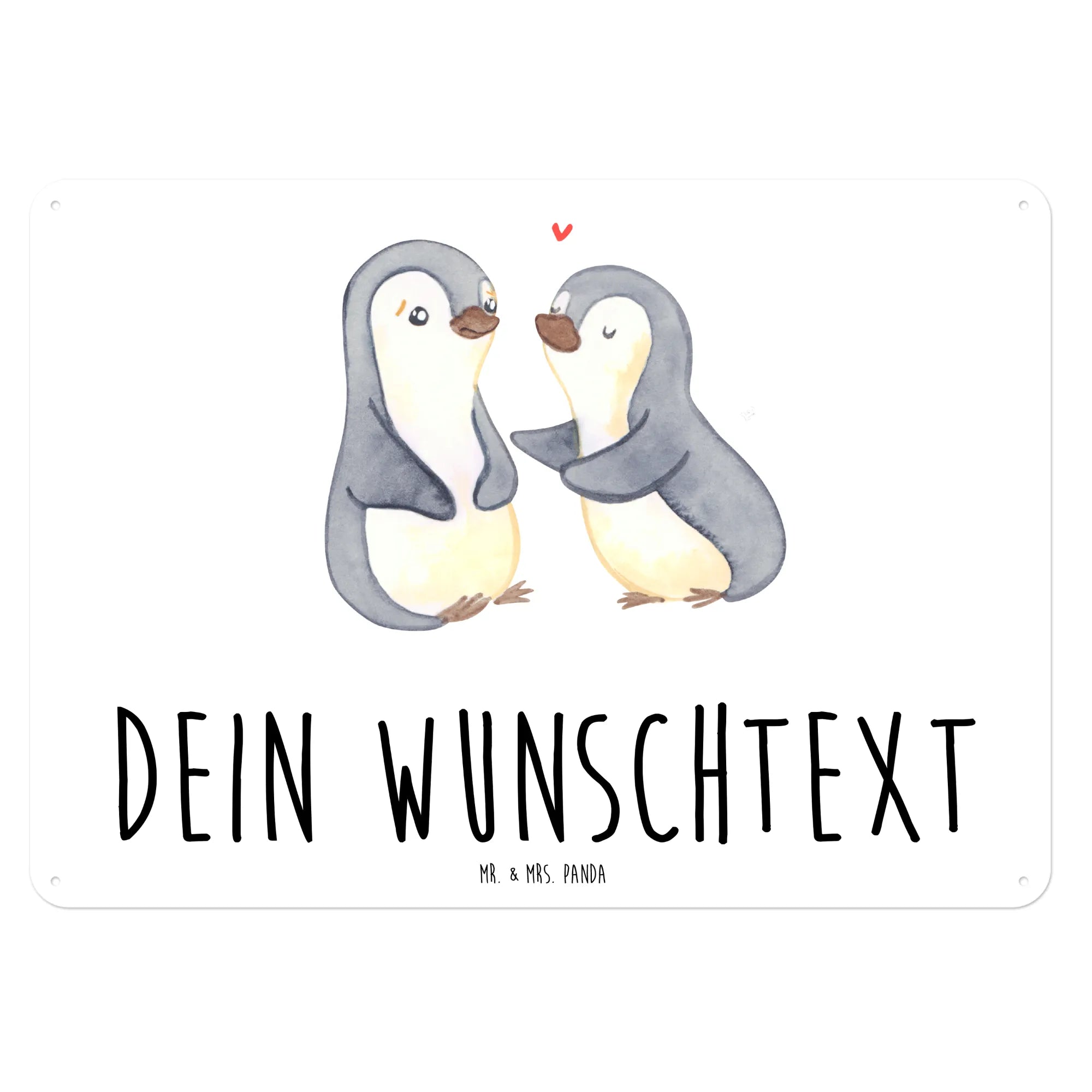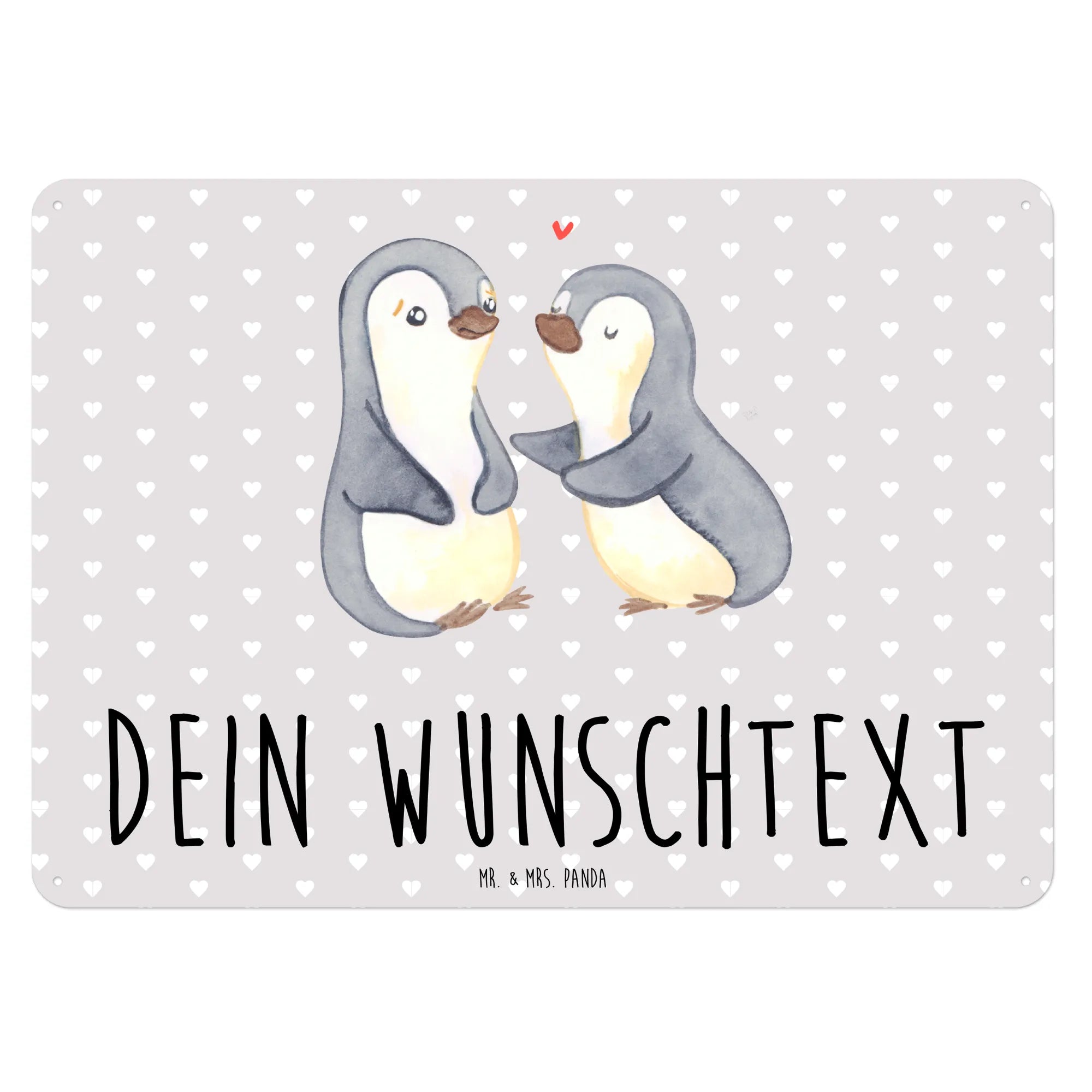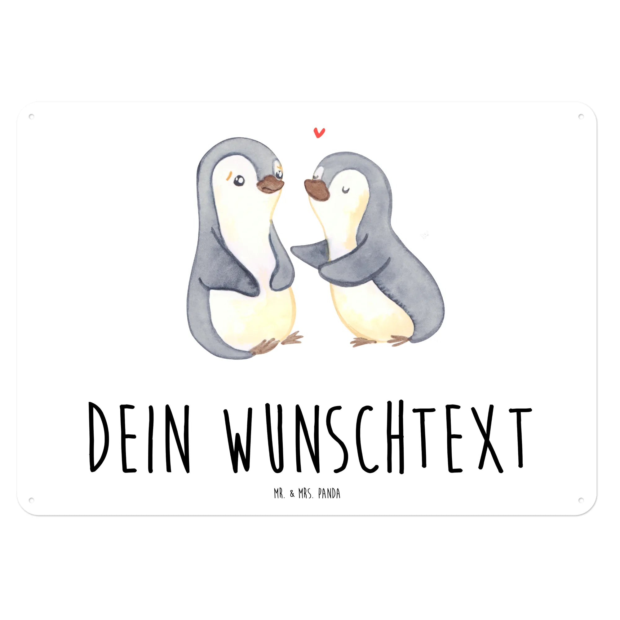 Entdecke das wunderschöne personalisierte Blechschild "Pinguine trösten" von Mr. & Mrs. Panda! Mit einer edlen, seidenmatten Oberfläche und einem liebevollen Motiv, das zwei Pinguine zeigt, die sich zärtlich zuneigen, ist dieses Schild das perfekte Geschenk für Deine Liebsten.