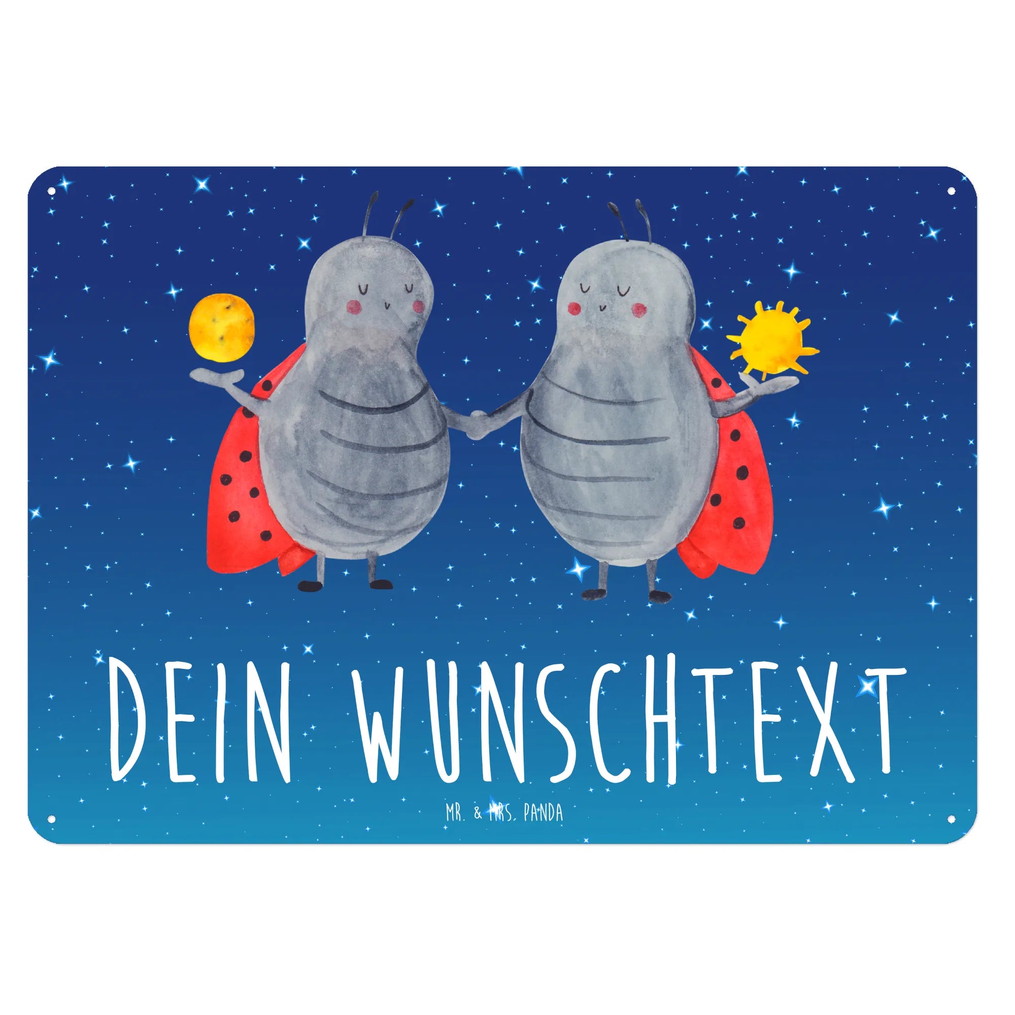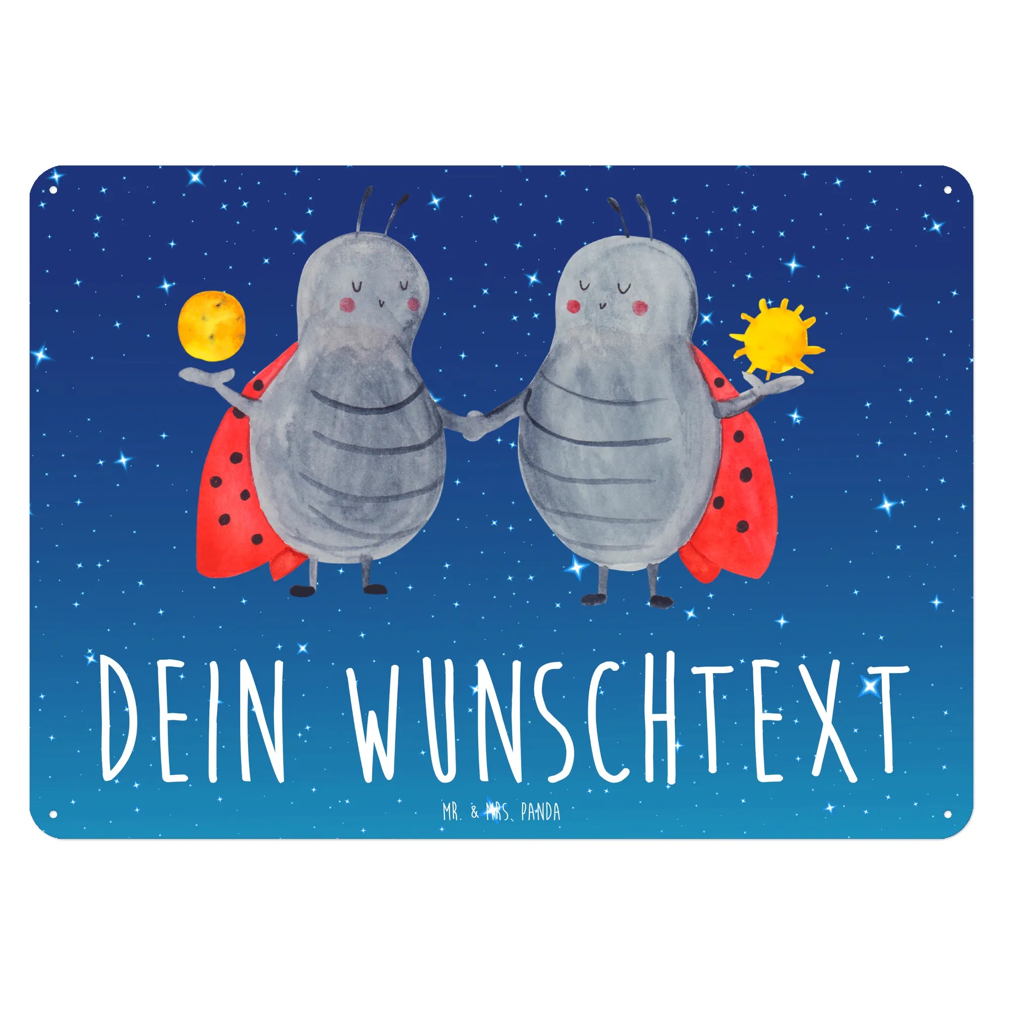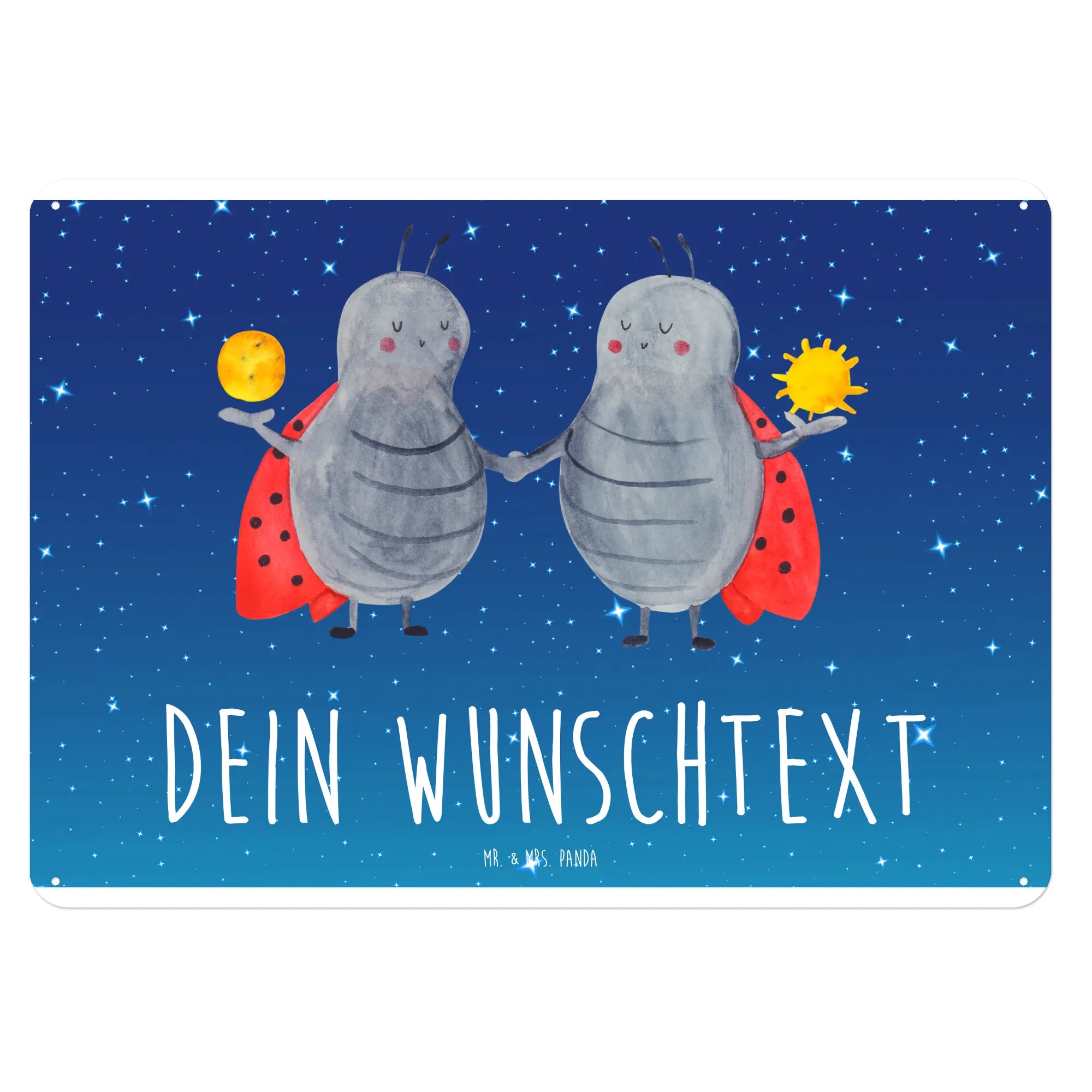 Entdecke unser wunderschönes und edles personalisiertes Blechschild mit dem Motiv Sternzeichen Zwilling von Mr. & Mrs. Panda! 🎉 Dieses zauberhafte Schild vereint charmante Gestaltung mit persönlichem Charakter und ist das perfekte Geschenk für alle Zwillinge oder ihre liebsten Menschen. Egal ob als Geburtstagsgeschenk, zu einem besonderen Anlass oder einfach nur so, dieses Schild zaubert jedem ein Lächeln ins Gesicht. Das besondere Design zeigt fröhliche Marienkäfer, die symbolisch für die Zwillinge stehen. Die beiden Glückskäfer begeistern mit ihrem einzigartigen Spruch: "Aufgeschlossen und begeistert wie ein Zwilling!".