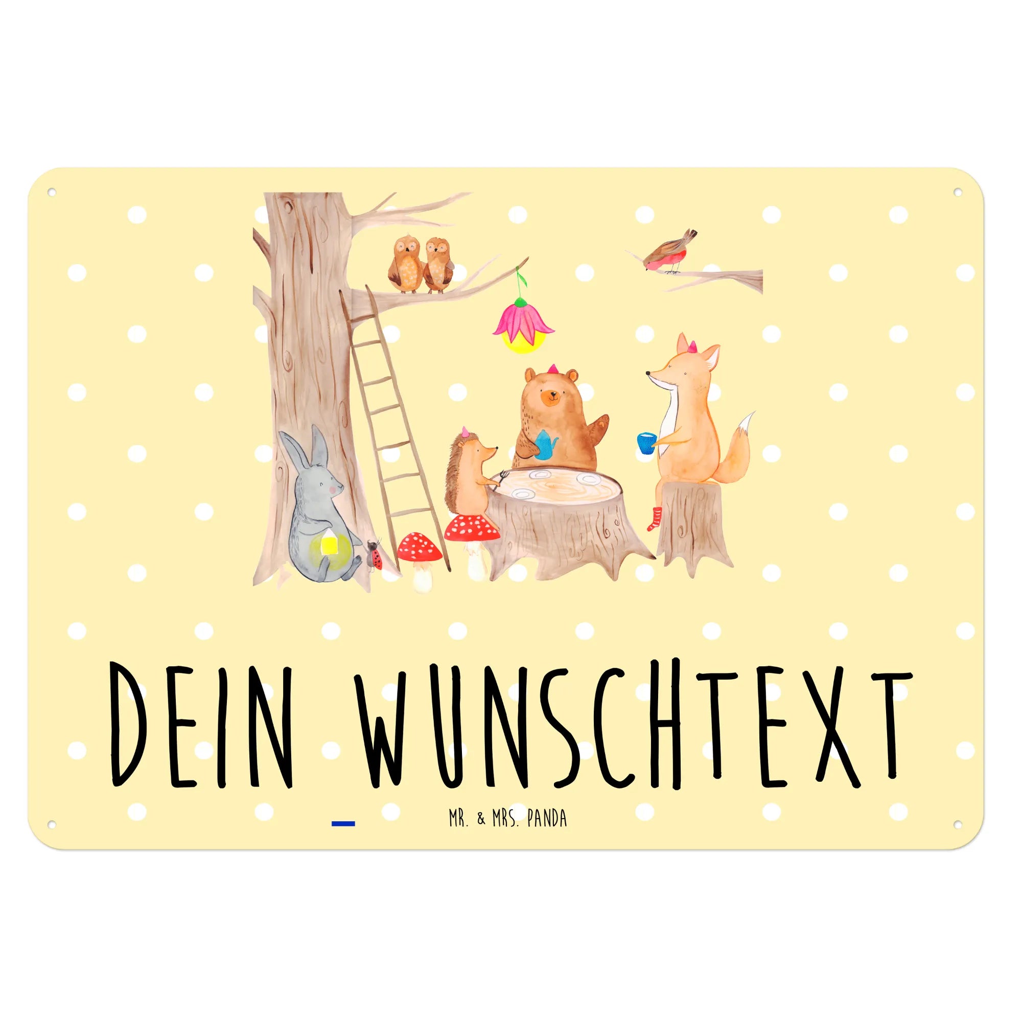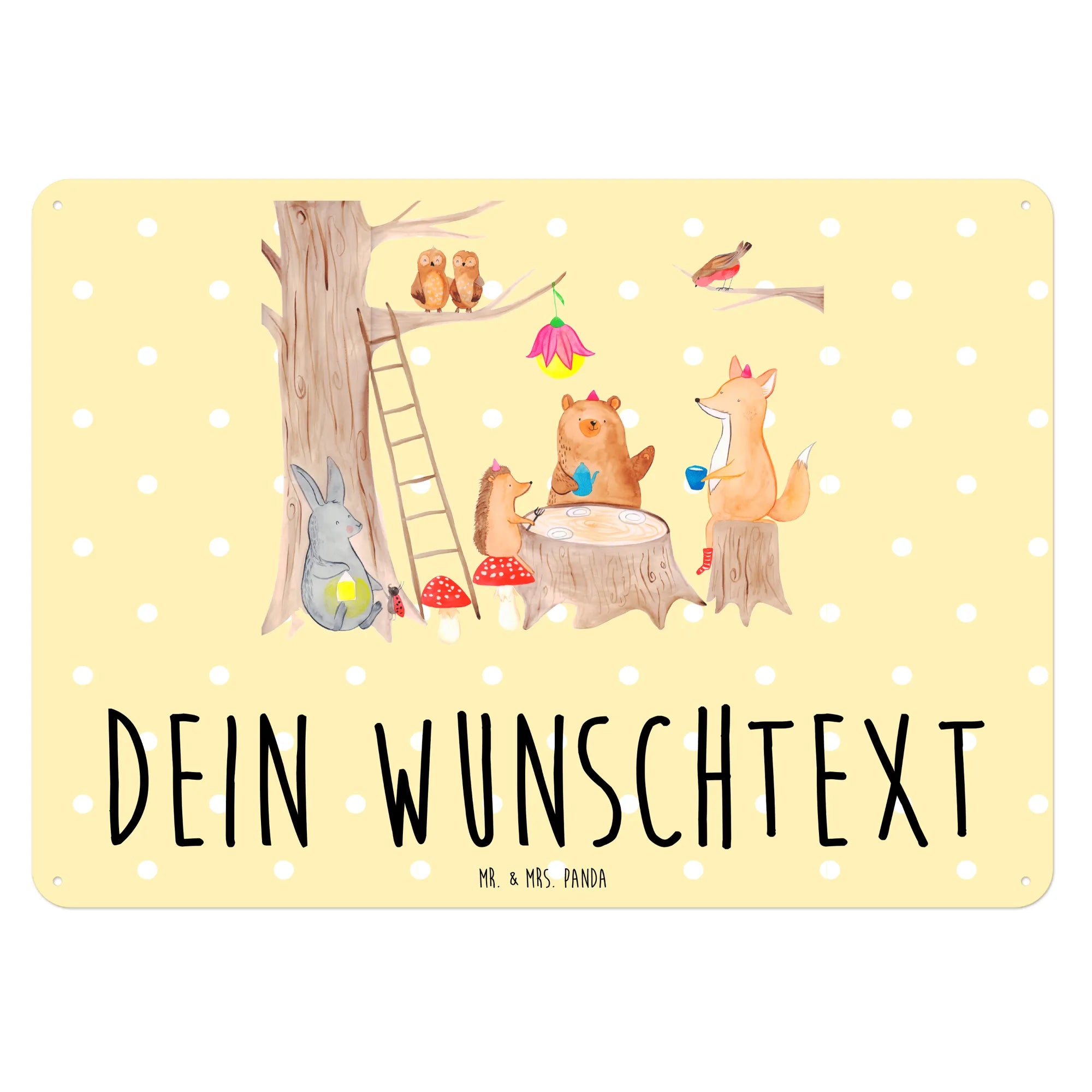 Du suchst das perfekte Geschenk für einen besonderen Anlass? Dann ist das personalisierte Blechschild mit dem süßen Motiv der Waldtiere beim Picknick genau das Richtige!