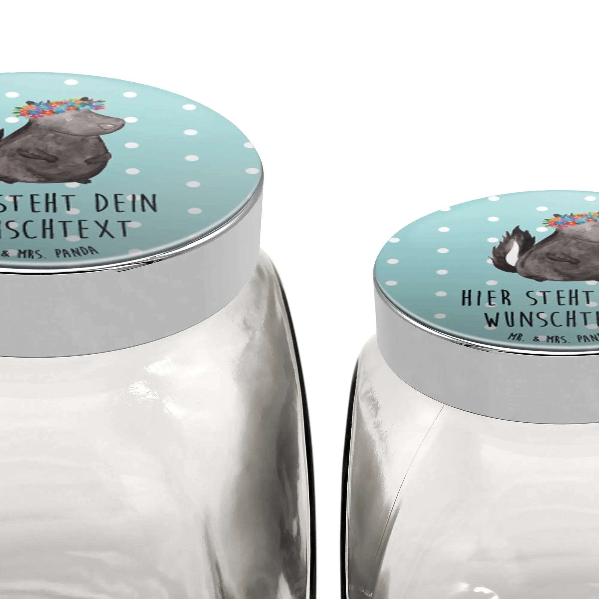 Das personalisierte Bonbonglas "Stinktier Blumenmädchen" von Mr. & Mrs. Panda ist das perfekte Geschenk für alle Tierliebhaber und Naschkatzen! Mit seinem liebevollen Design, das ein süßes Stinktier mit einem bunten Blumenkranz zeigt, bringt es Farbe und Freude in jede Küche oder Büro. Ob als Aufbewahrungsdose für Süßigkeiten, Kekse, Müsli oder Tee – dieses hochwertige Glas lässt keine Wünsche offen.