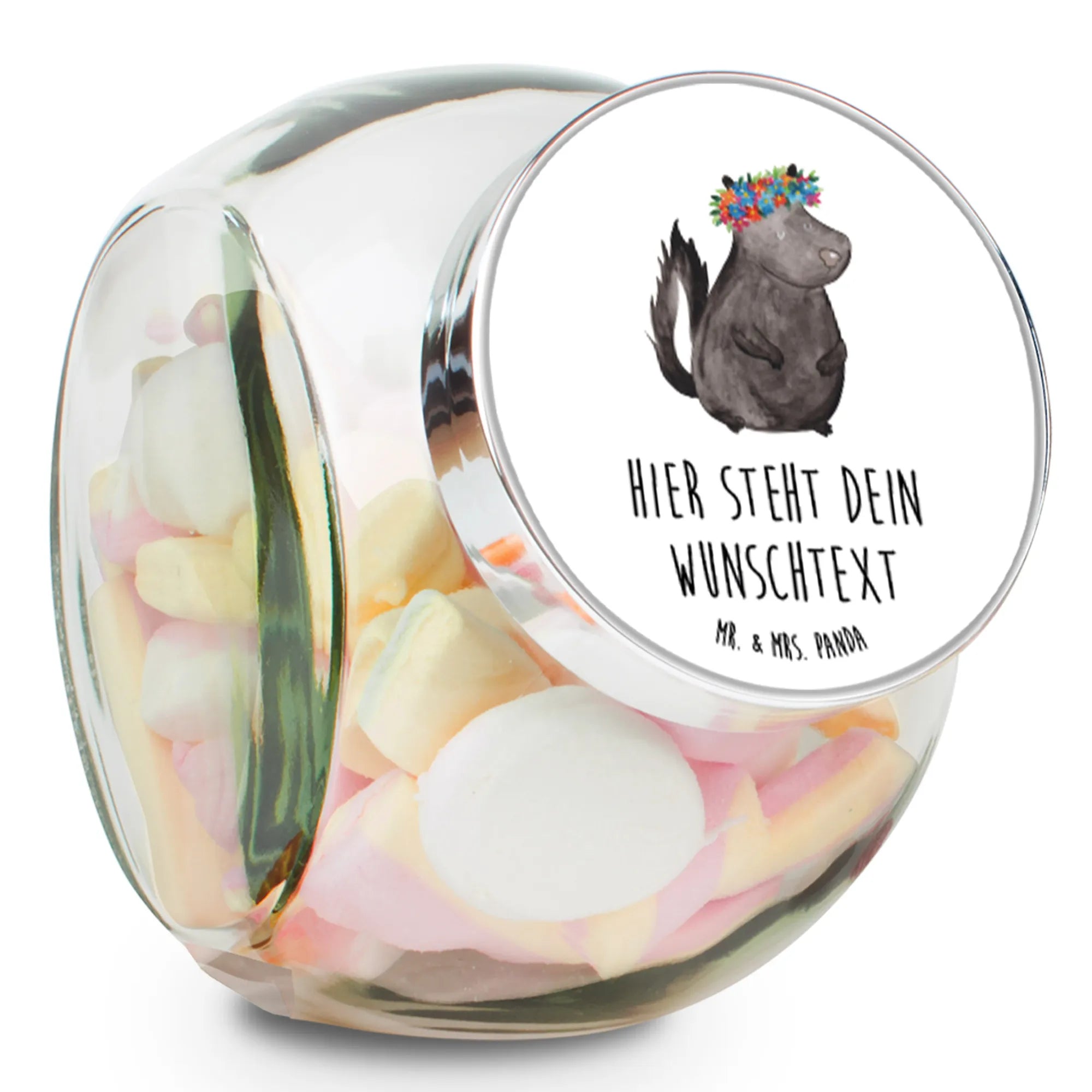 Das personalisierte Bonbonglas mit dem bezaubernden Stinktier Blumenmädchen-Motiv von Mr. & Mrs. Panda ist das perfekte Geschenk für jeden Menschen, der das Besondere liebt. Ob zur Hochzeit, zum Geburtstag oder einfach als kleine Aufmerksamkeit - dieses liebevoll gestaltete Glas zaubert jedem ein Lächeln ins Gesicht.