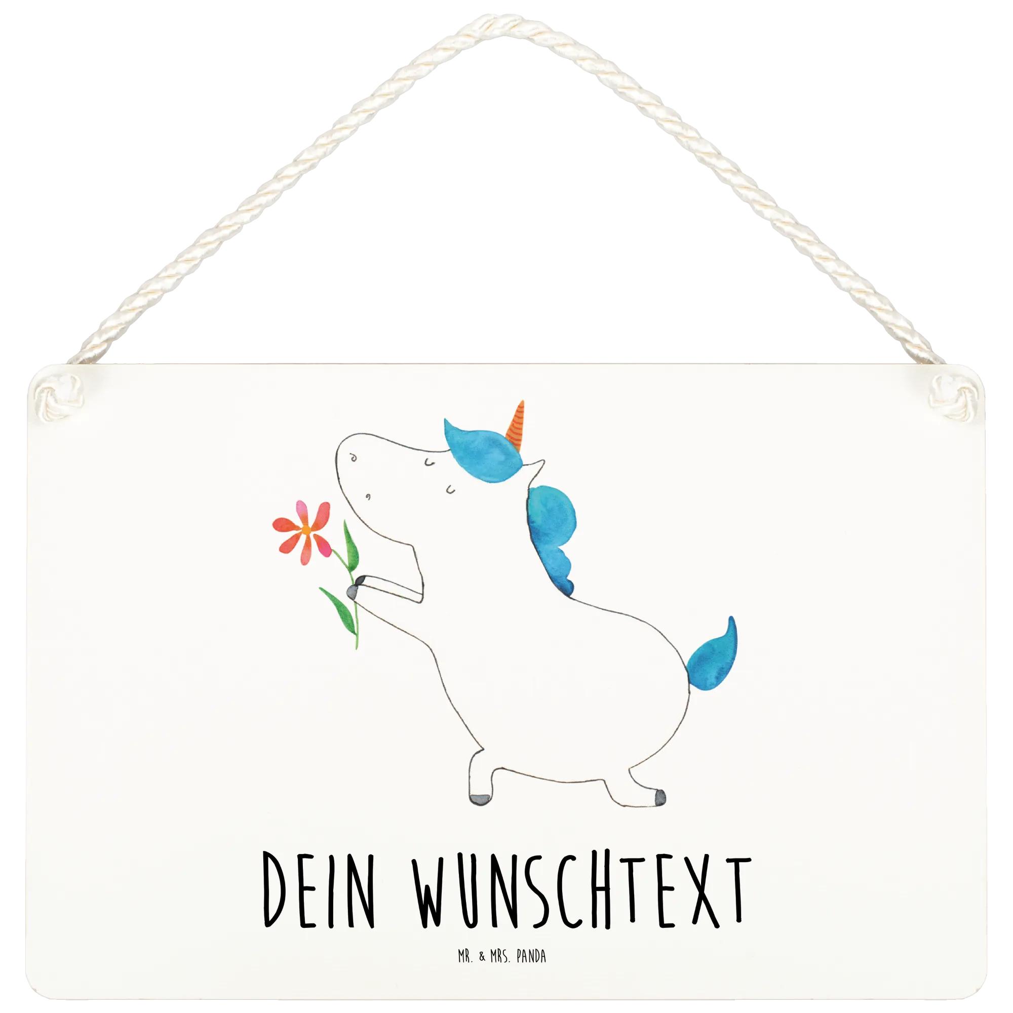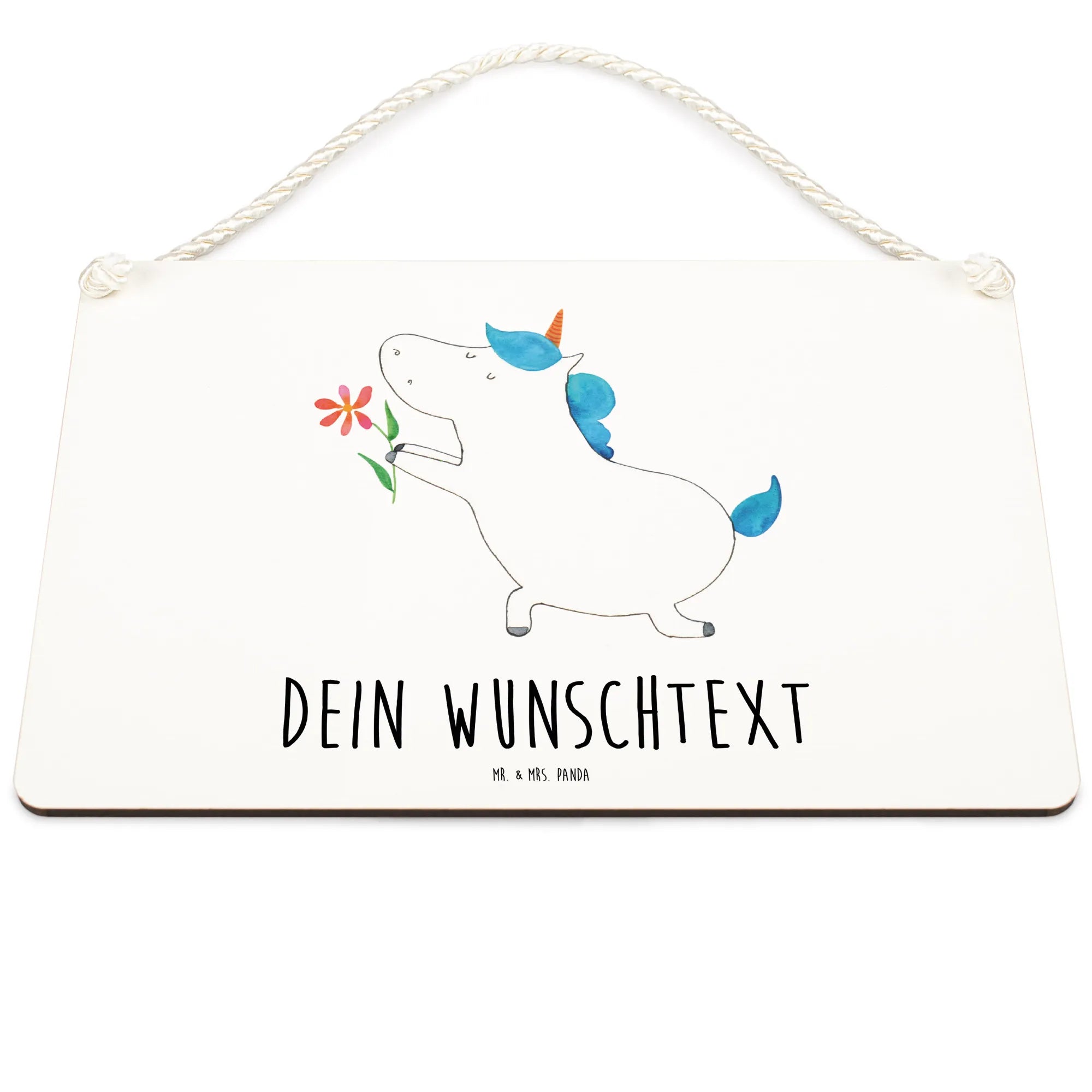 Das personalisierte Deko Schild Einhorn Blume von Mr. & Mrs. Panda ist das perfekte Geschenk für alle, die die zauberhafte Welt der Einhörner lieben! Mit einem handgezeichneten Motiv eines süßen Einhorns, das liebevoll eine Blume präsentiert, spricht dieses Schild nicht nur Romantiker und Pärchen an, sondern ist auch ein wahrer Blickfang in jedem Zuhause.