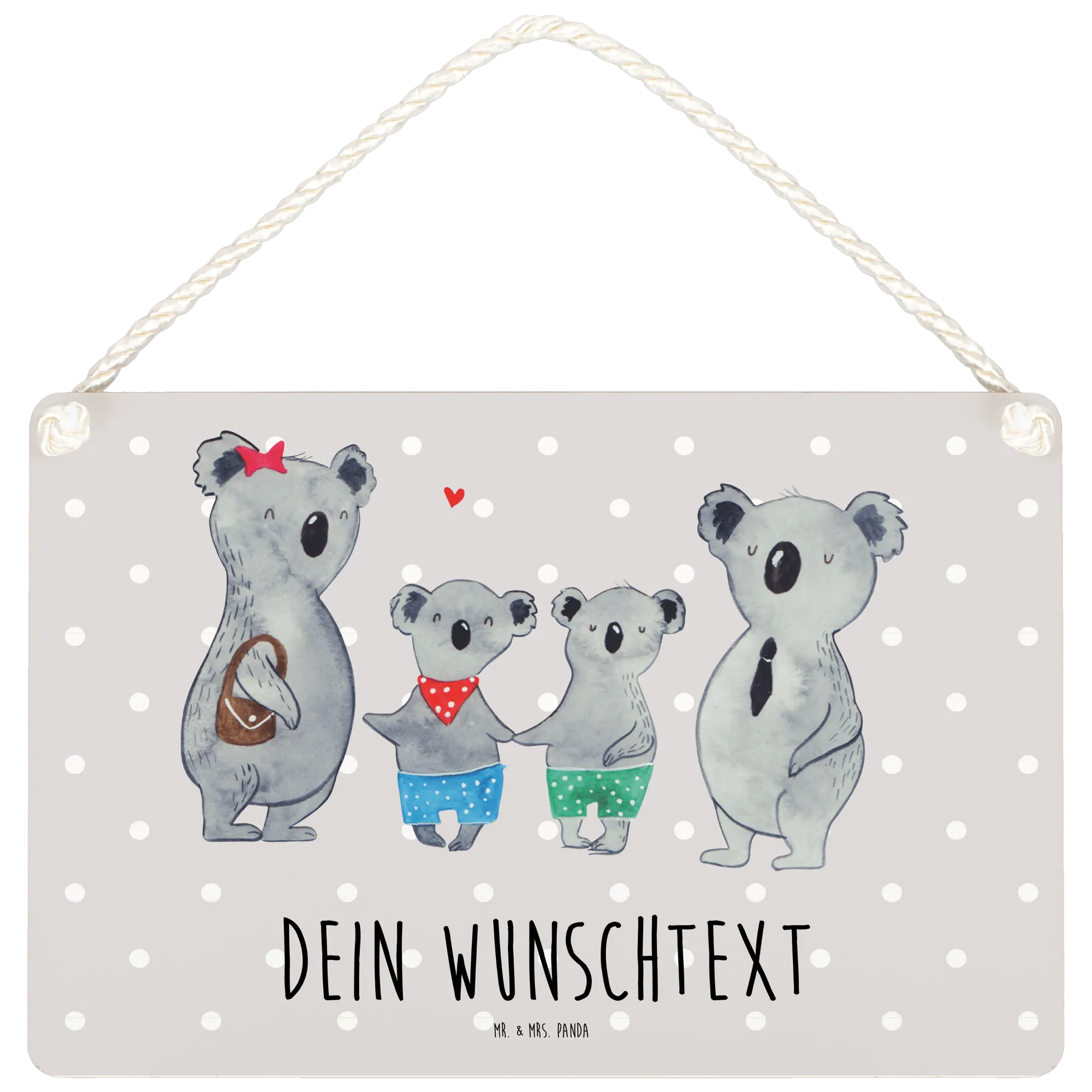 Das personalisierte Deko Schild "Koala Familie zwei" aus der liebevollen Familie Kollektion von Mr. & Mrs. Panda ist das perfekte Geschenk für alle, die Familie über alles schätzen. Mit seinem herzerwärmenden Design, das eine glückliche Familie von vier Koalabären darstellt, strahlt dieses Schild nicht nur eine wundervolle Atmosphäre aus, sondern erinnert auch an die Werte der Familienbande. Auf diesem Schild sieht man eine Mutterkoala mit einem roten Sternchen im Haar und einem Koalavater in einem Anzug, was für die verschiedenen Rollen innerhalb einer Familie steht.