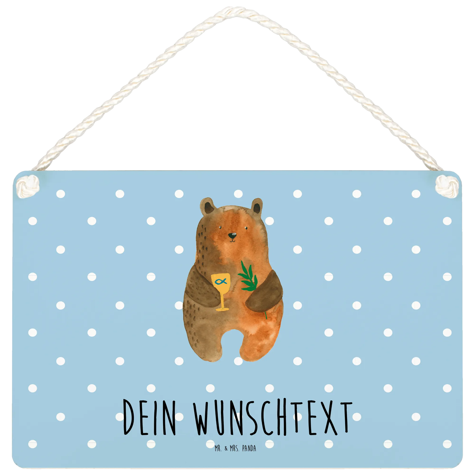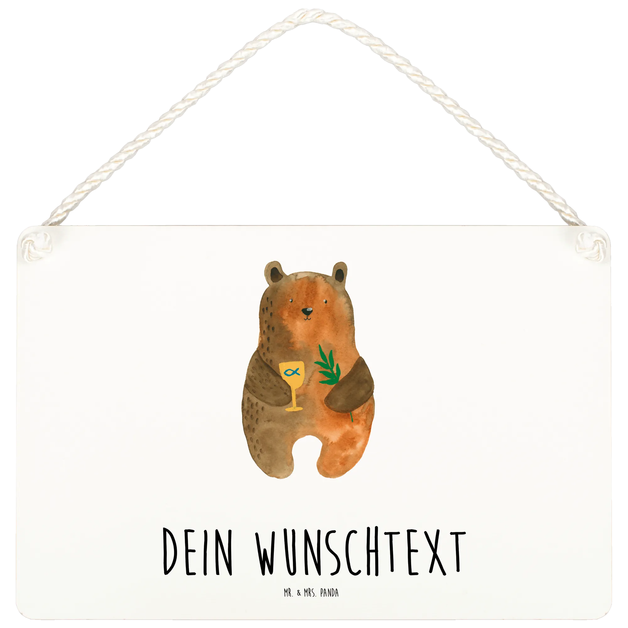 Das personalisierte Deko Schild "Konfirmation-Bär" von Mr. & Mrs. Panda ist das perfekte Geschenk zur Konfirmation! Mit einem abenteuerlustigen Bären, der einen goldenen Kelch in einer Hand und einen Zweig in der anderen hält, verbreitet das Schild Freude und gute Wünsche.